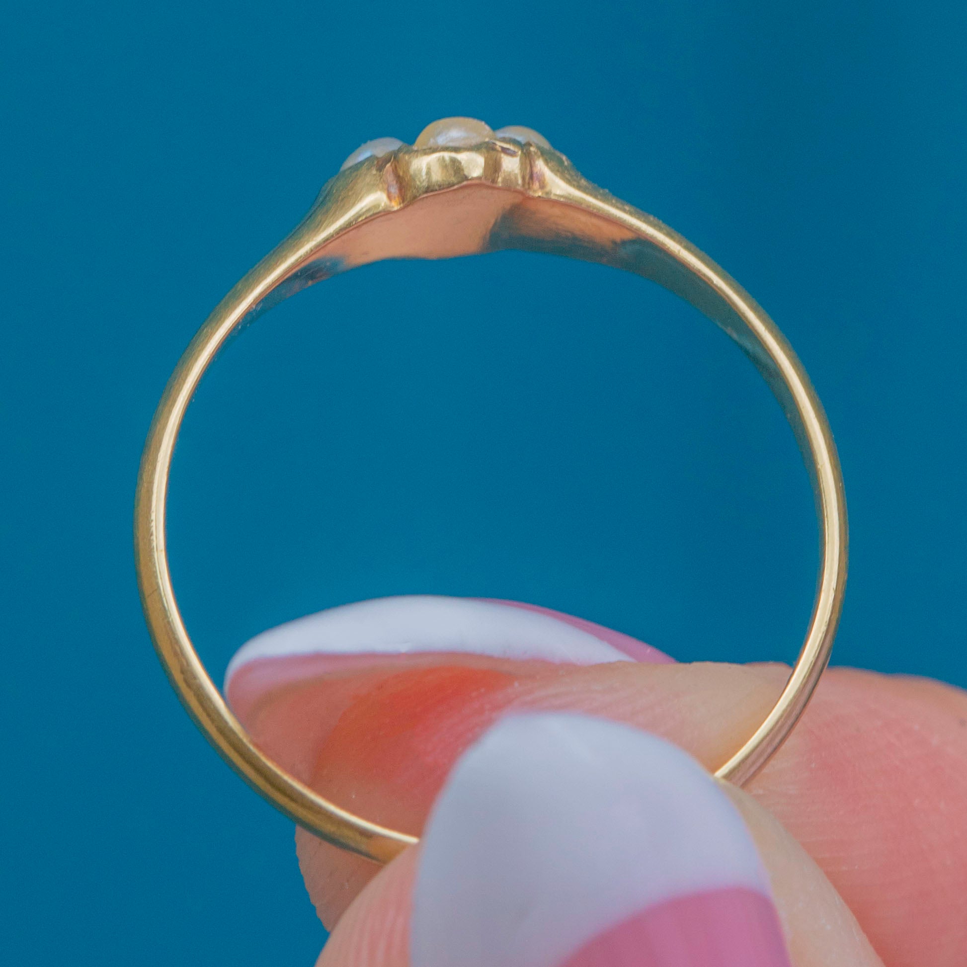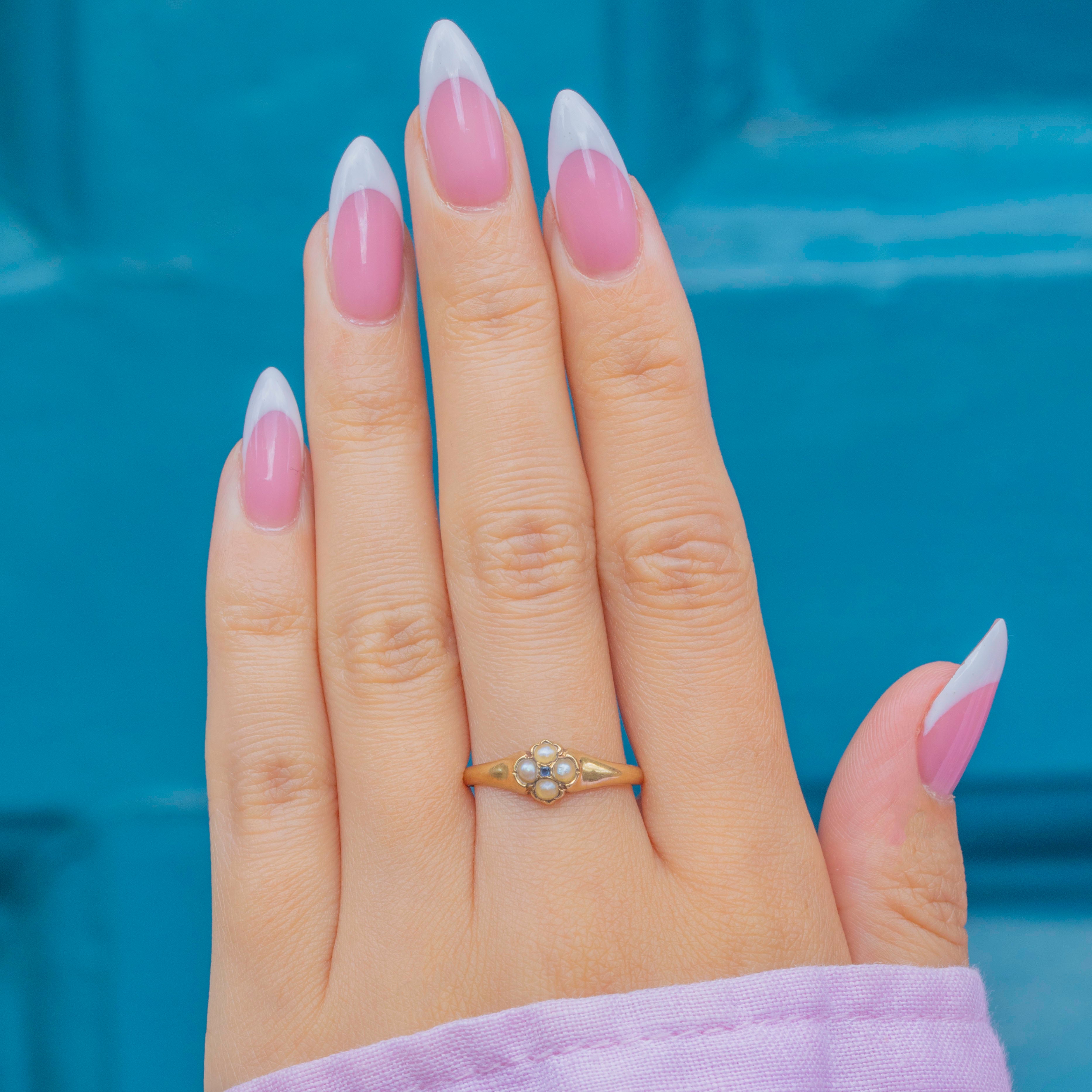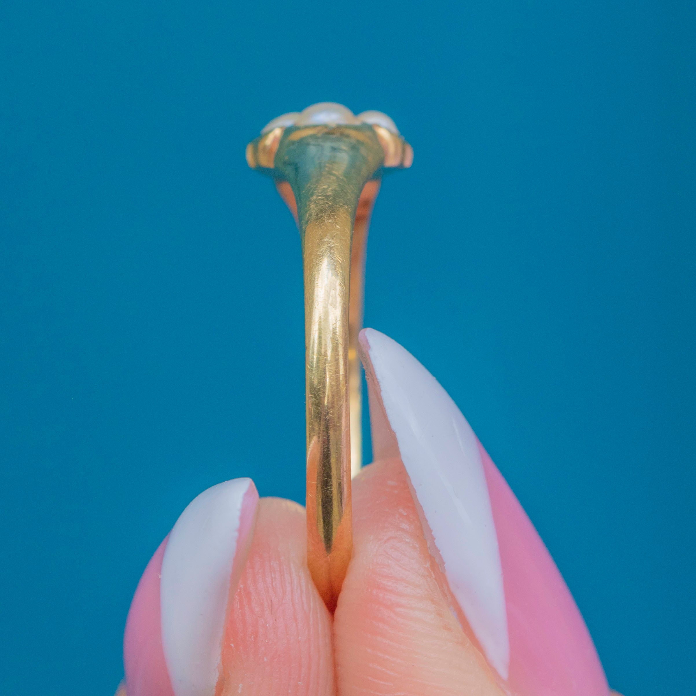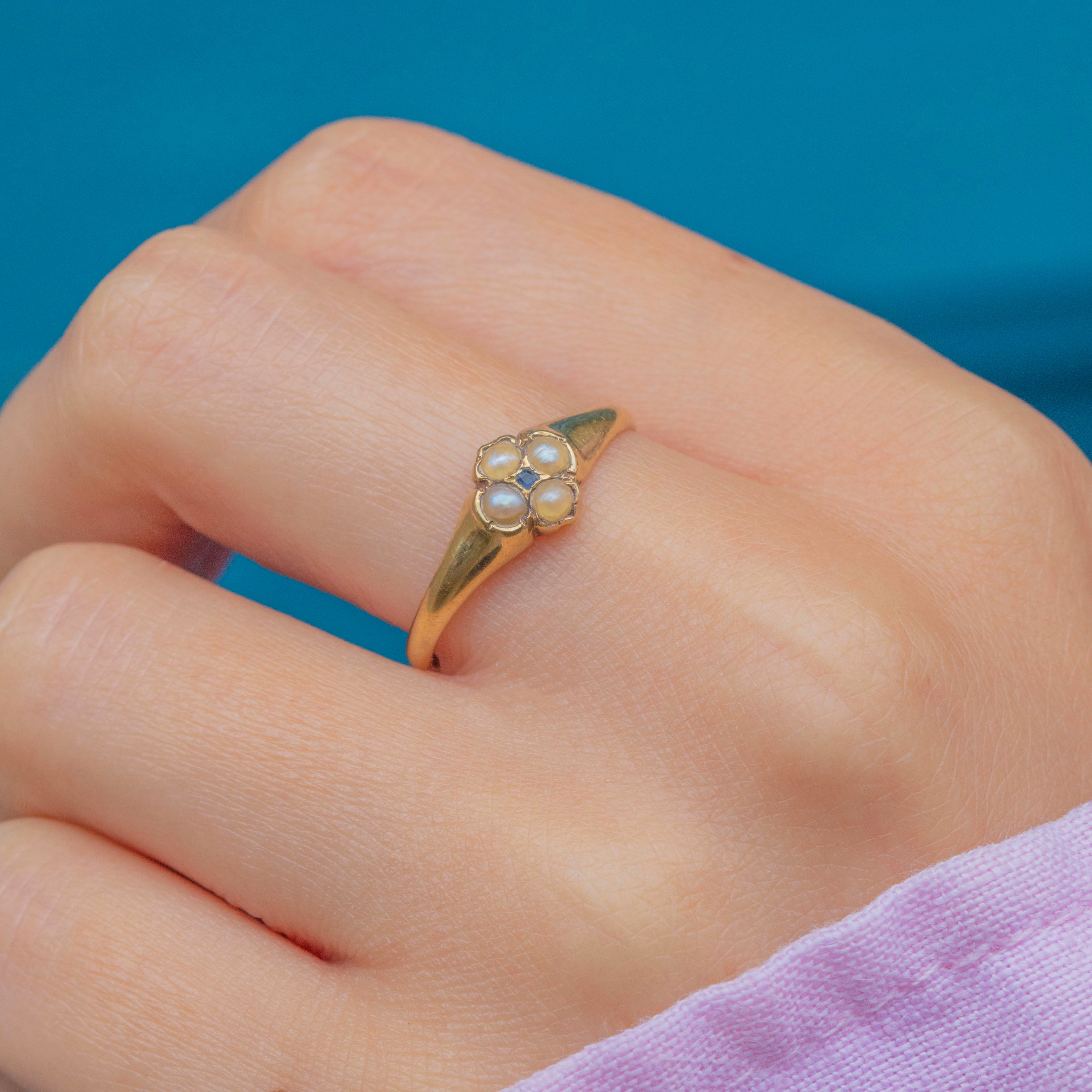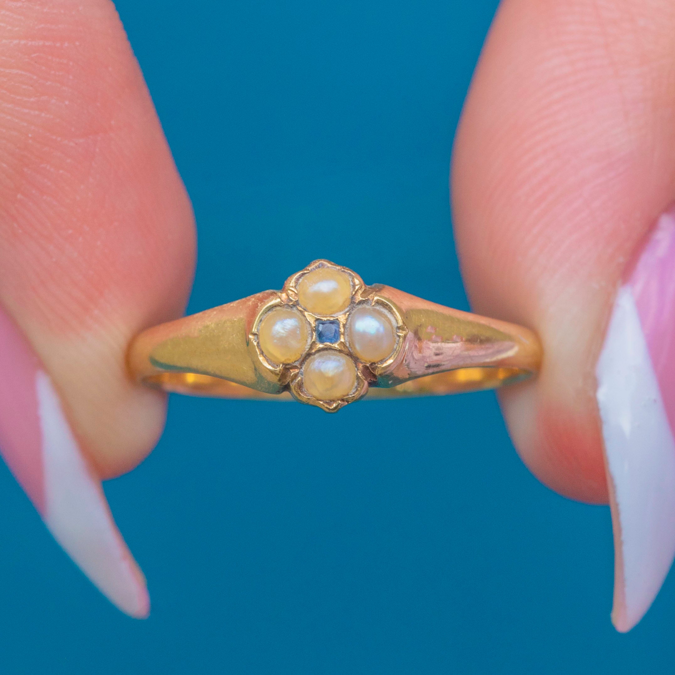 This adorable Victorian ring displays four lustrous Pearls and is centred by a dainty Sapphire, arranged into a delicate floral motif.