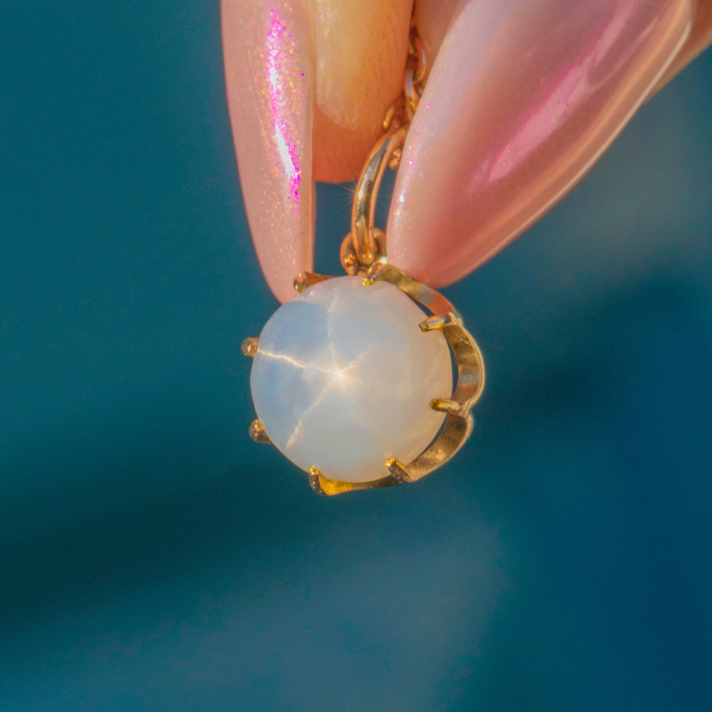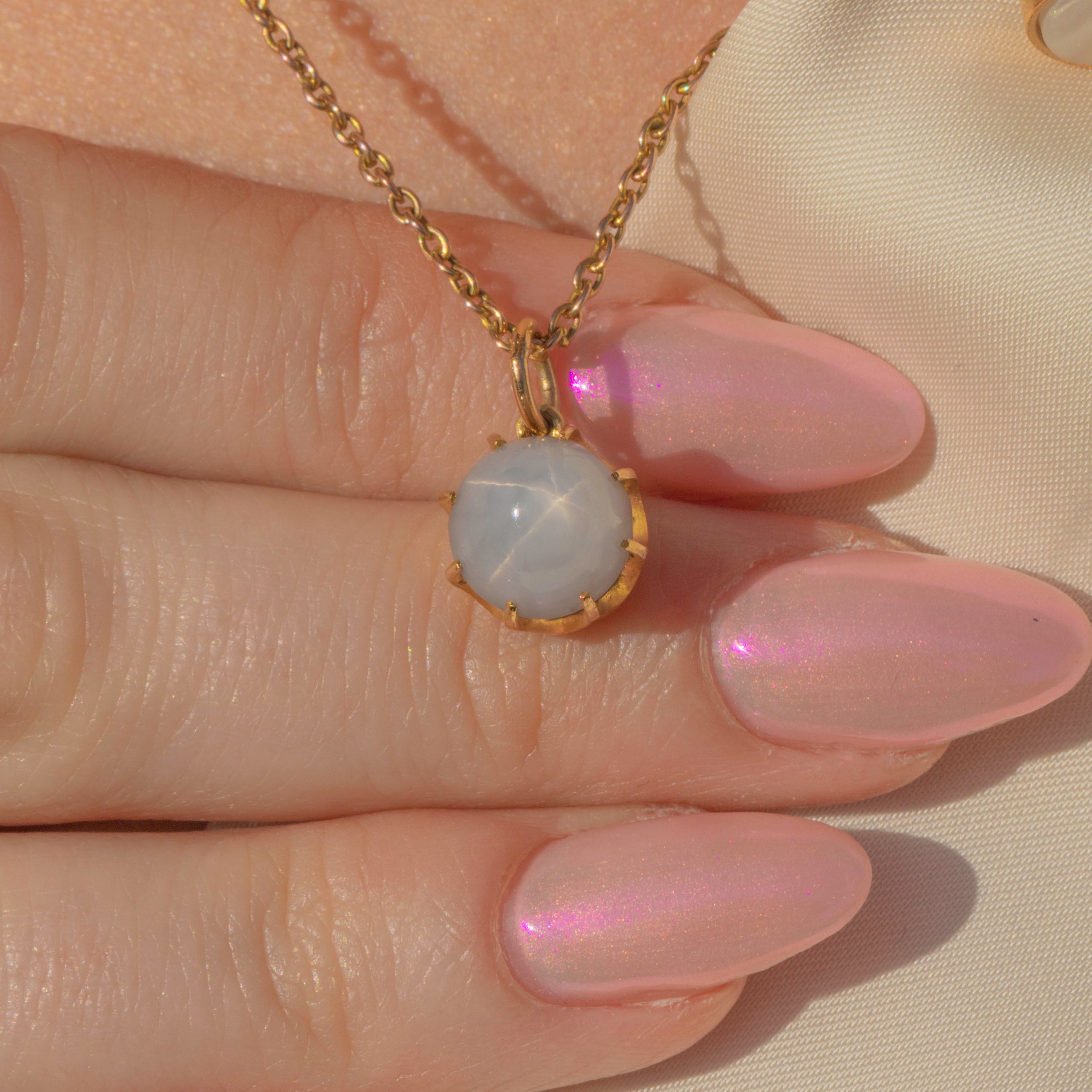 The 'star' effect visible in this gem, also known as asterism, is caused by light refracting off rutile silk inclusions, creating a star-like reflection. This celestial pendant is an absolute must-have, boasting the rare and enchanting Star Sapphire, renowned for its mystical properties and believed to bestow good fortune upon its wearer.