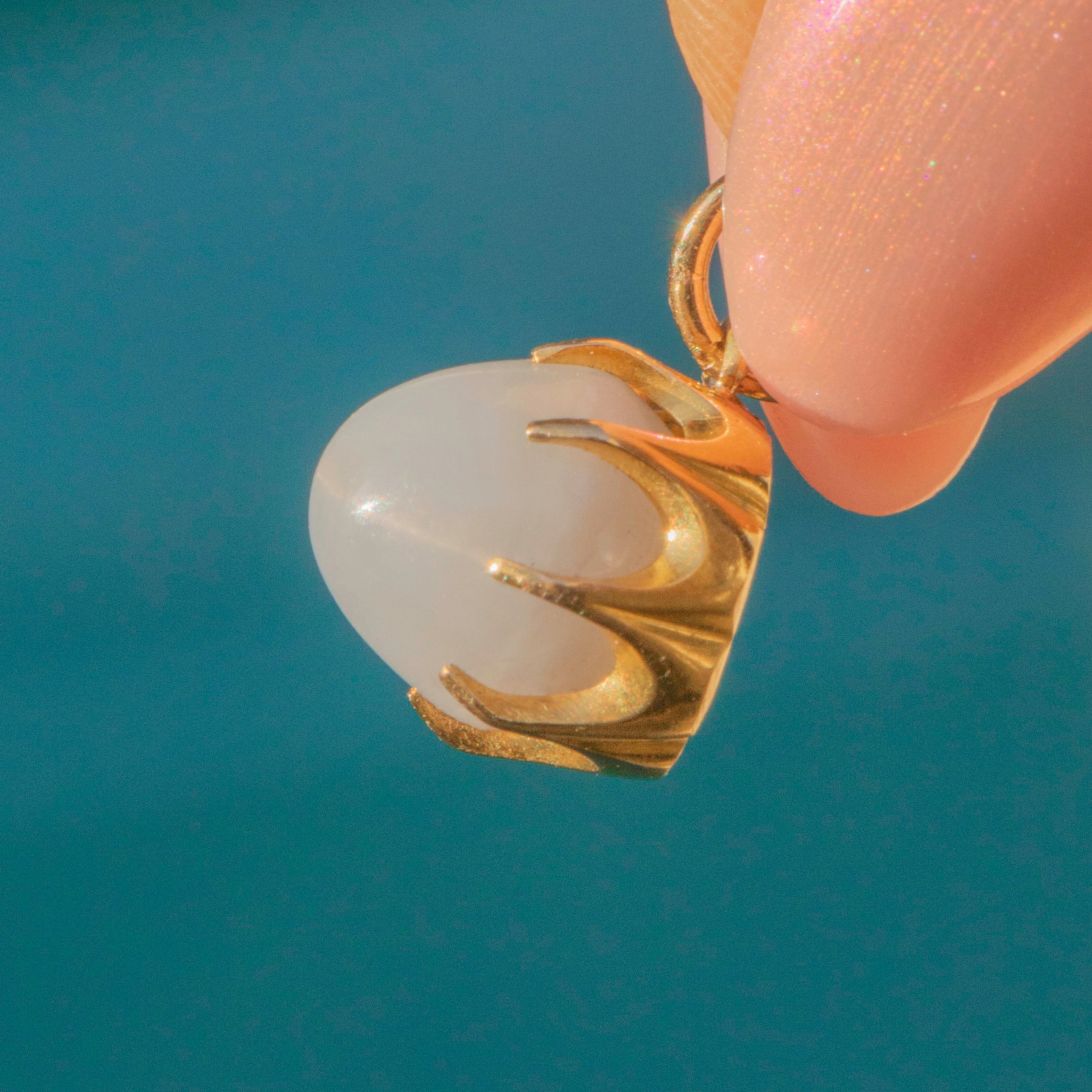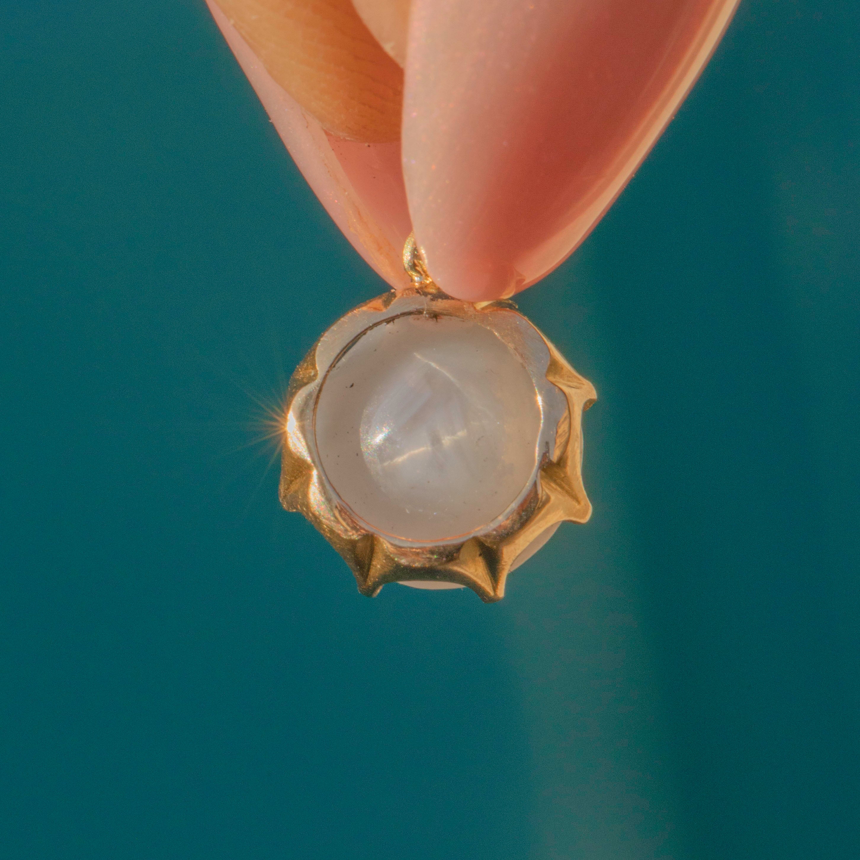 This antique 18ct Gold Star Sapphire charm will enchant you the moment you lay your eyes on her! The smooth 4.83ct Sapphire cabochon boasts a misty grey hue, revealing the captivating star striation as its high-domed surface moves in the light.