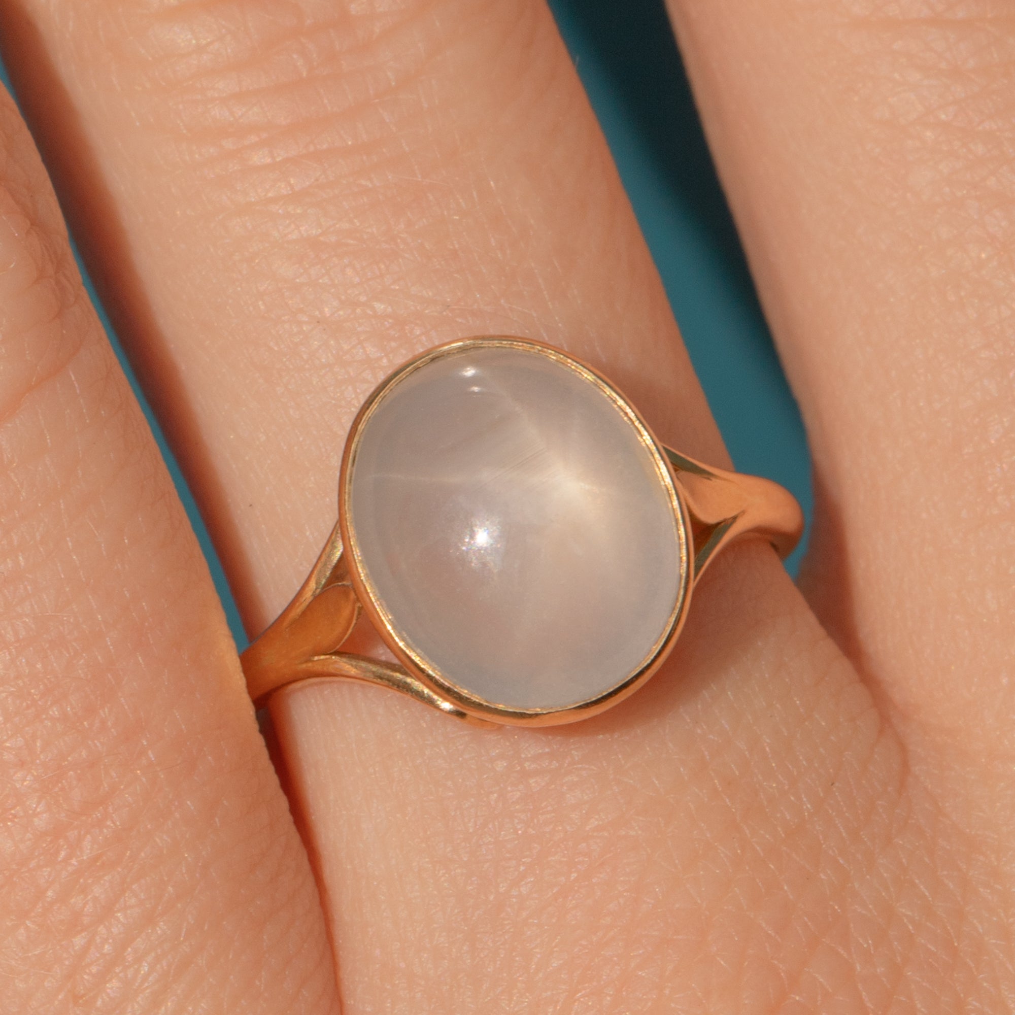 Add some celestial charm to your repertoire with this antique 18ct Gold star Sapphire ring! Homing a cloudy white 4.50ct Sapphire cabochon with sweet lilac overtones, as the light glides over her smooth cabochon cut a six point star reflects off of her surface, a testament to the wonders of mother nature.