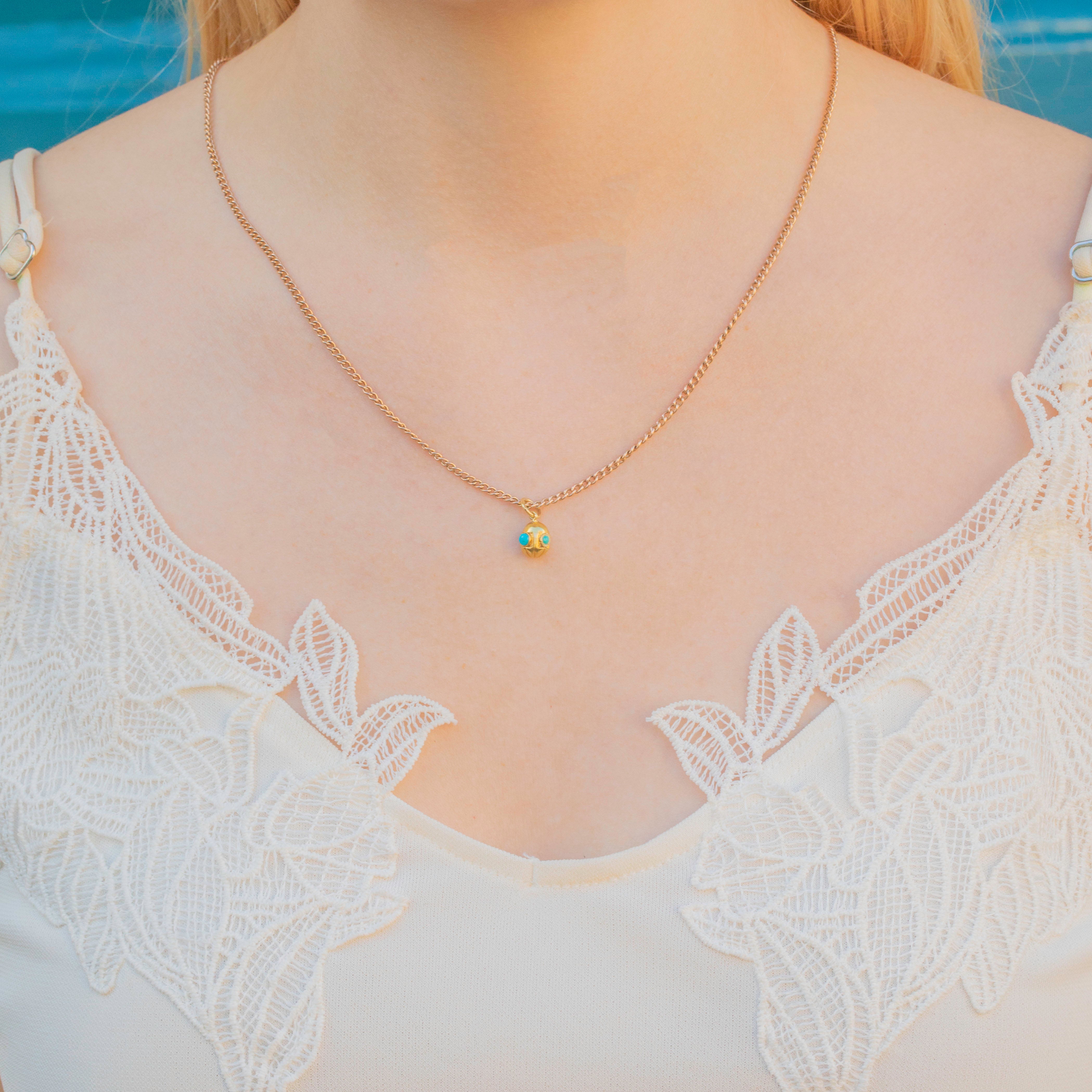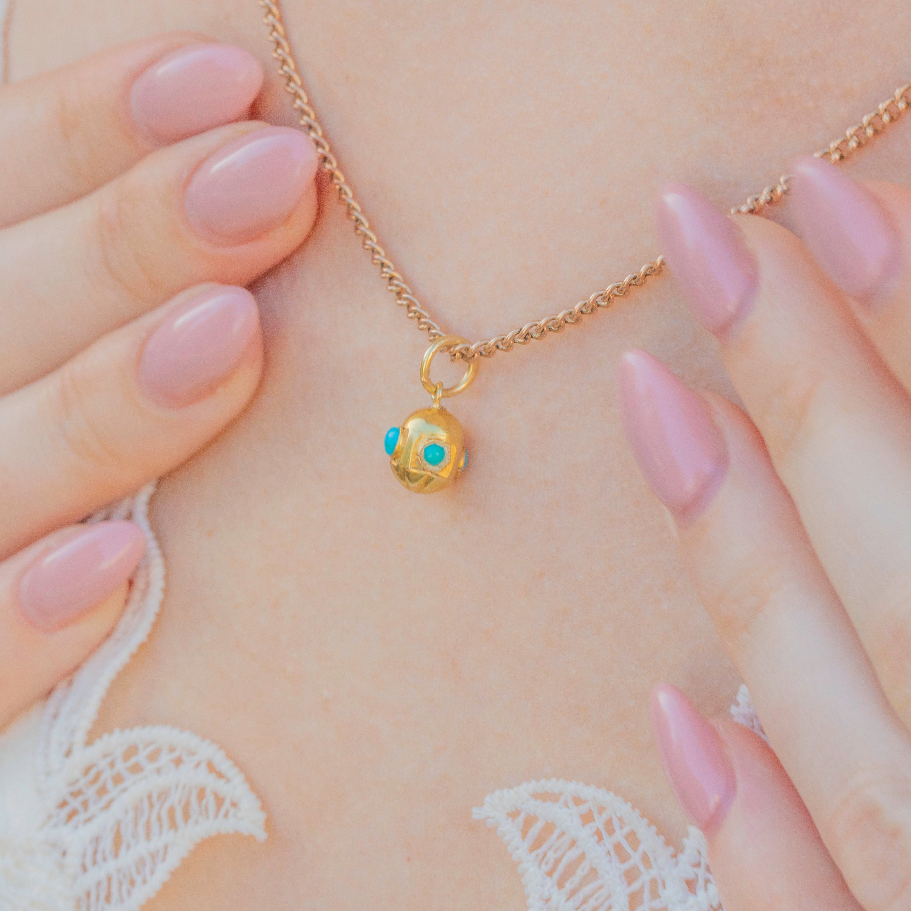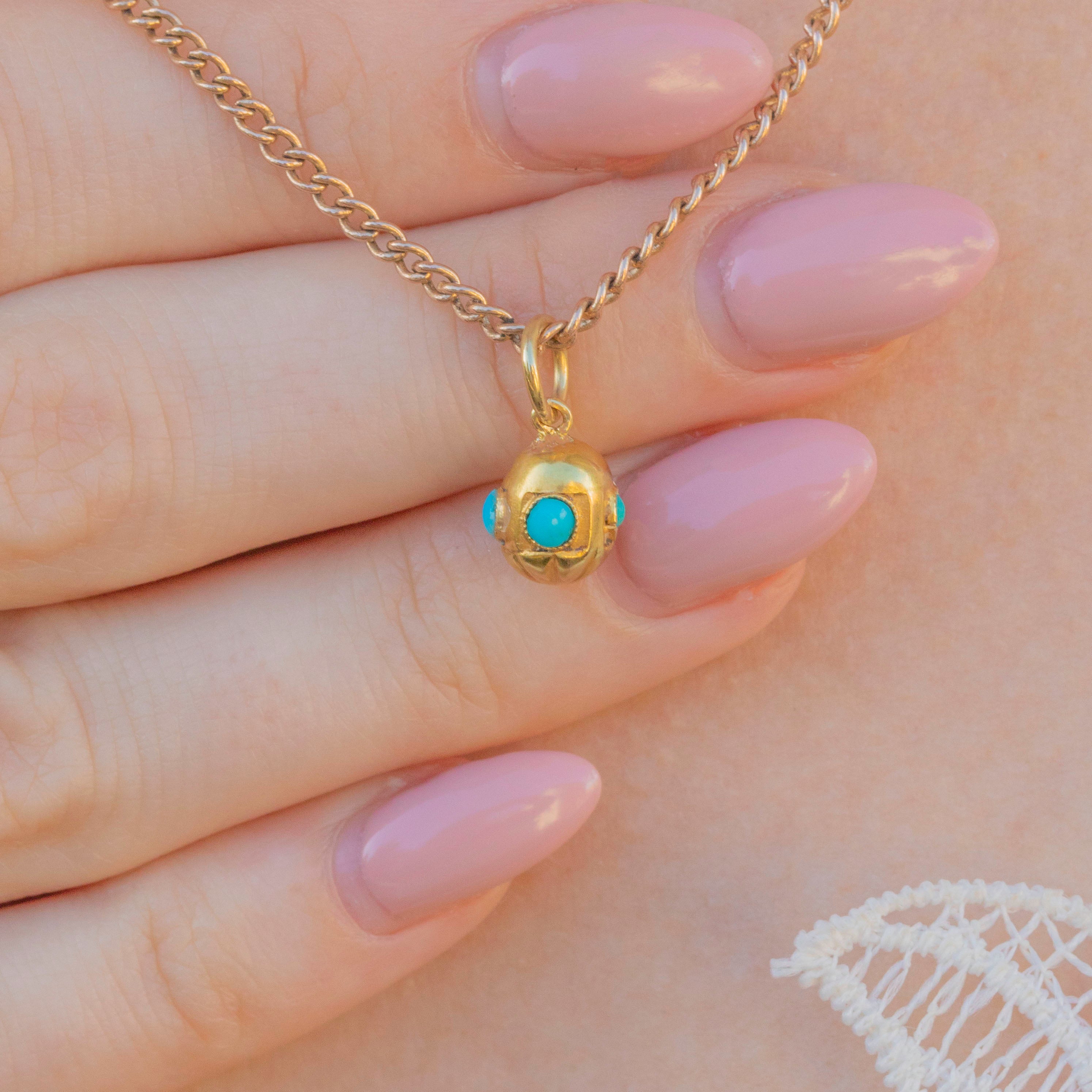 VERY GOOD. This antique 18ct Gold Turquoise charm is in very good condition. The Gold is luminous with no dings or scuffs and the Turquoise are all secure within their bezels. The pendant is overall in excellent condition, bar one Turquoise that is a slightly different shade and possibly a replacement. With a generously sized jump ring, you can wear this Victorian 18ct Gold charm from a chain of your choice with ease!