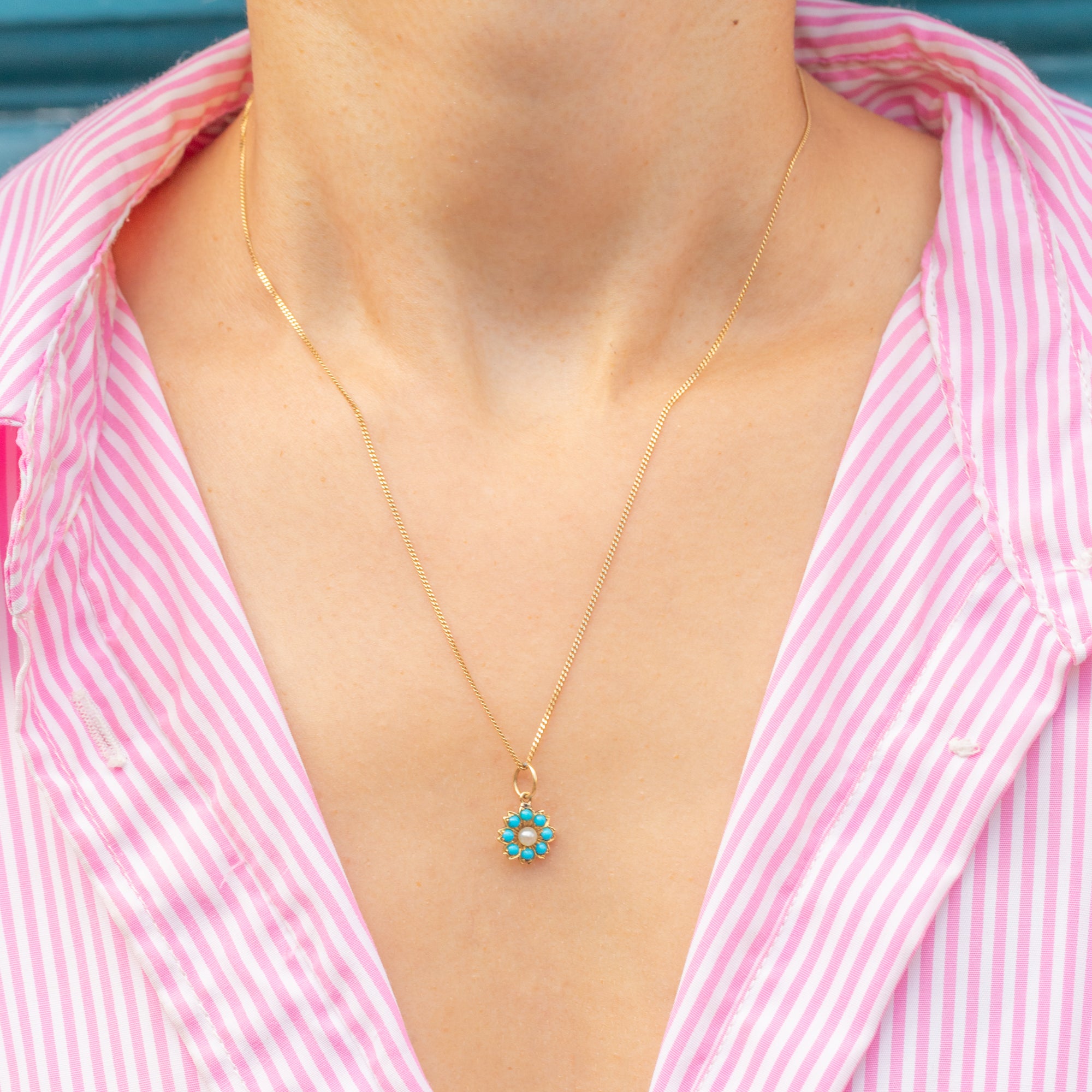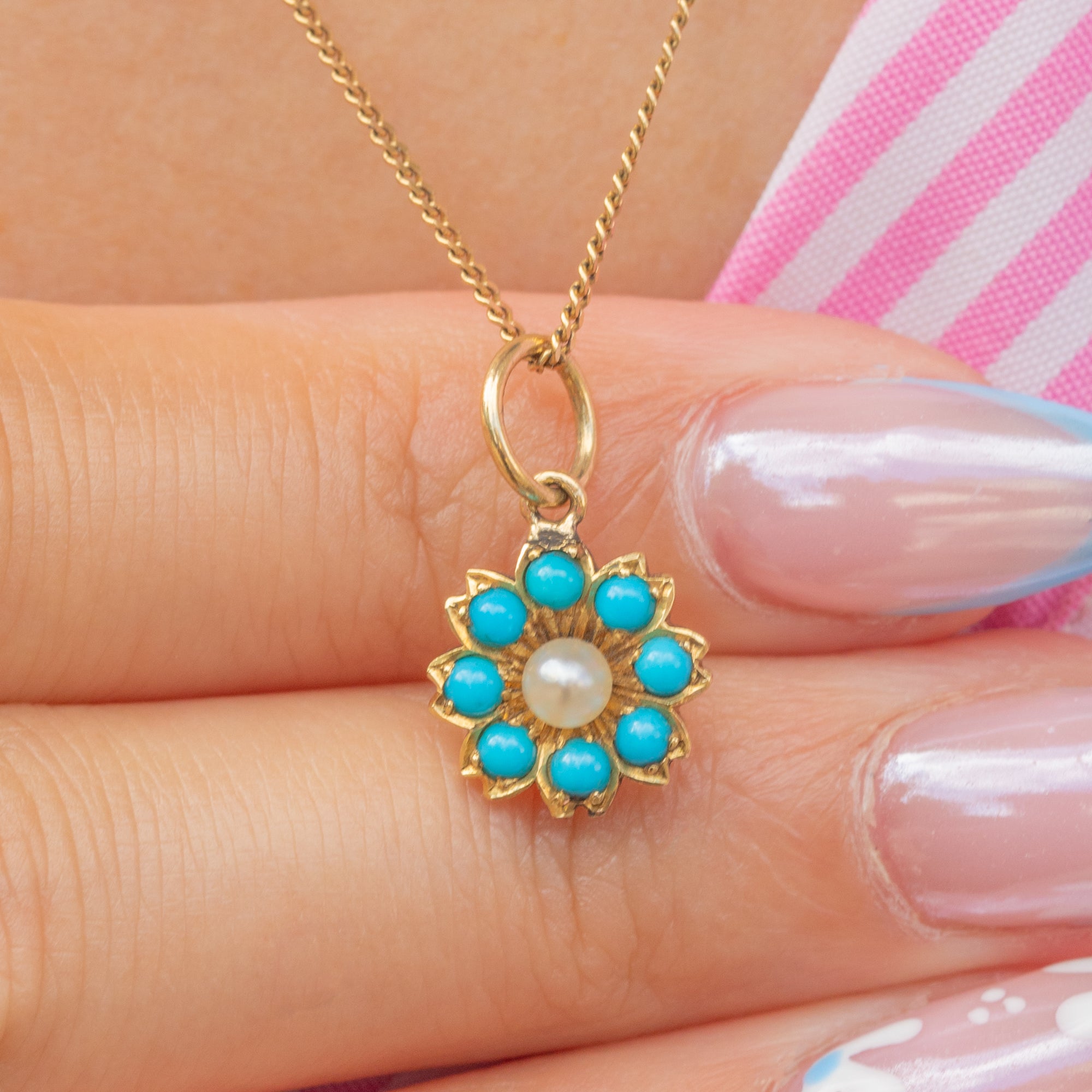 It is adorned with an array of vibrant Turquoise stones and complete with a lustrous seed Pearl in its centre. Petite and delicate, this Victorian charm will make a wonderful addition to your collection.