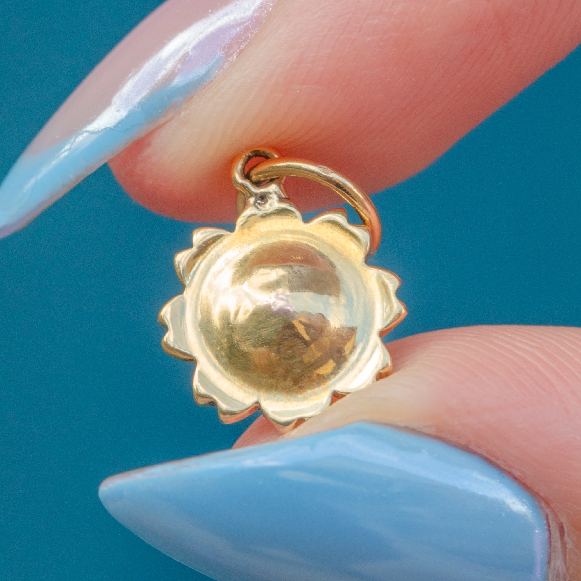 EXCELLENT: Each gemstone is vibrant and has been securely nestled within the buttery 18ct Gold. The back of the pendant is smooth and comfortable and with a securely soldered jump ring, this charm can be worn with utmost confidence.