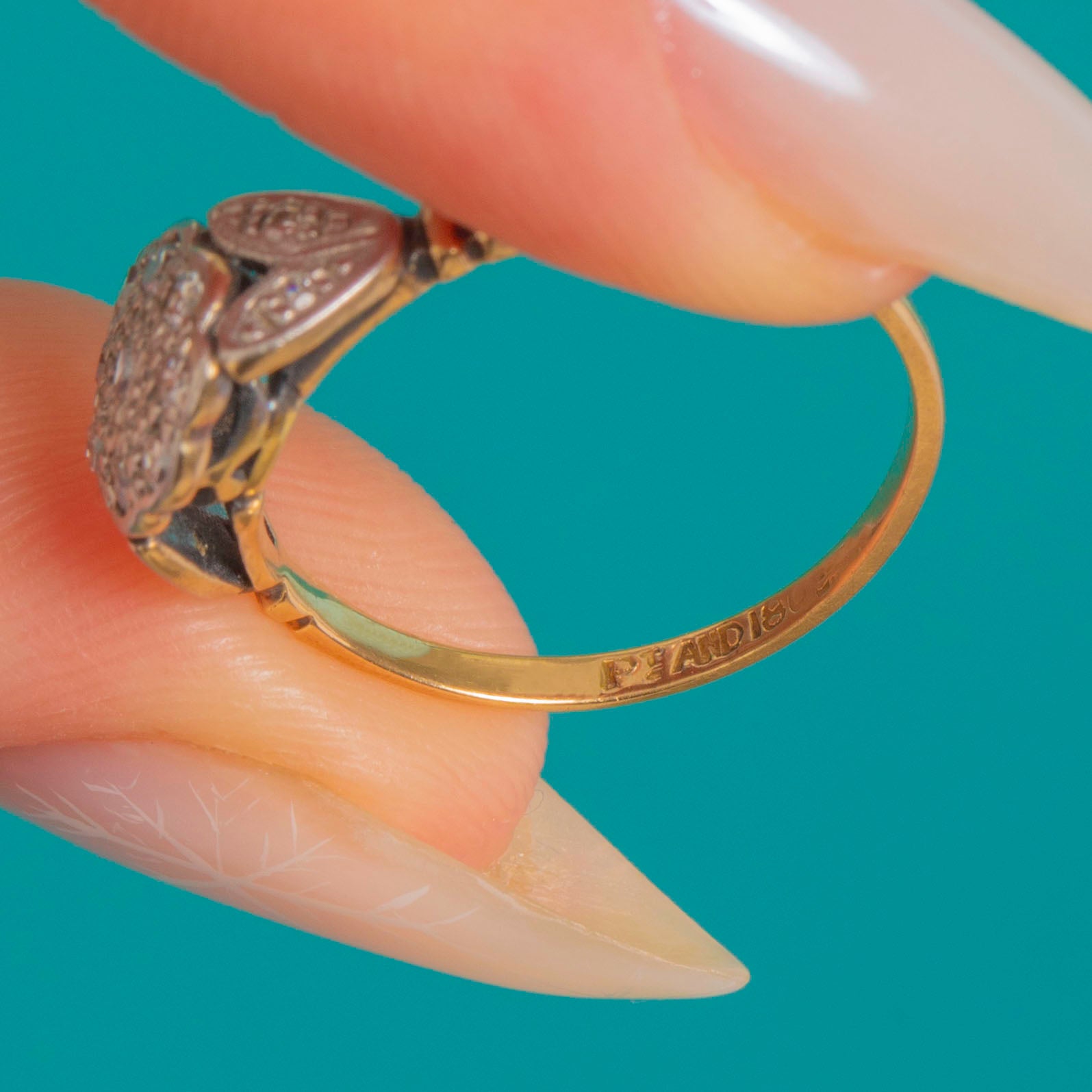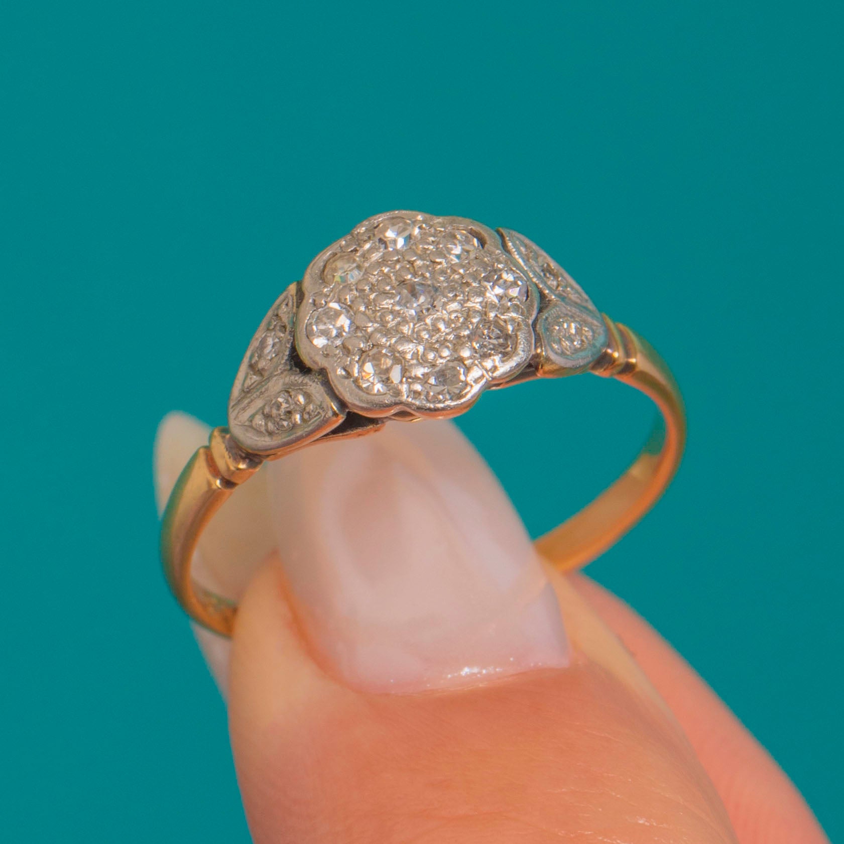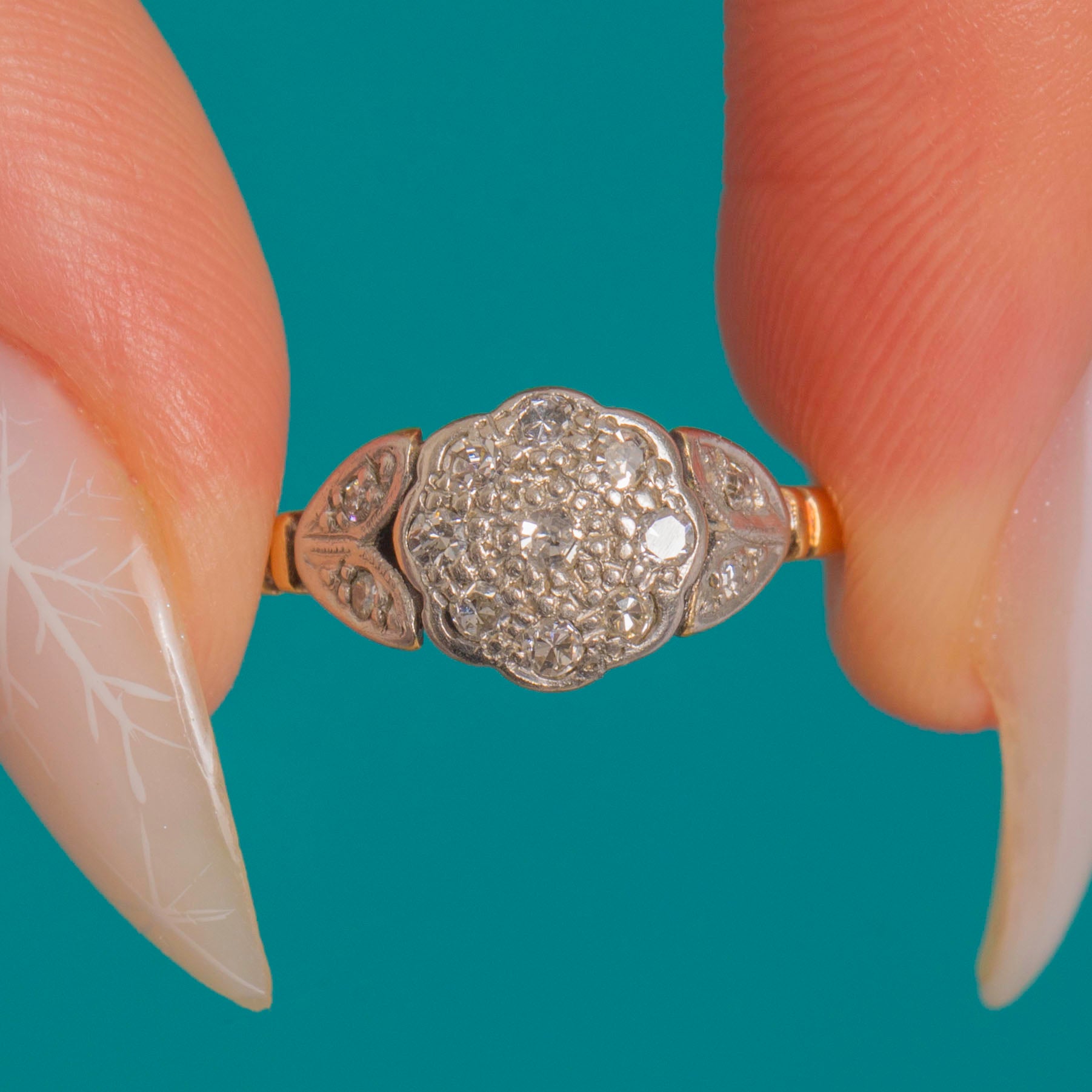 A gorgeous original Art Deco cluster ring from the 1920s, full of those charming period sparkles. The head is styled as a petite Diamond “flower”, framed by sweet leaf-like shoulders that give it a crisp, elegant silhouette on the hand.