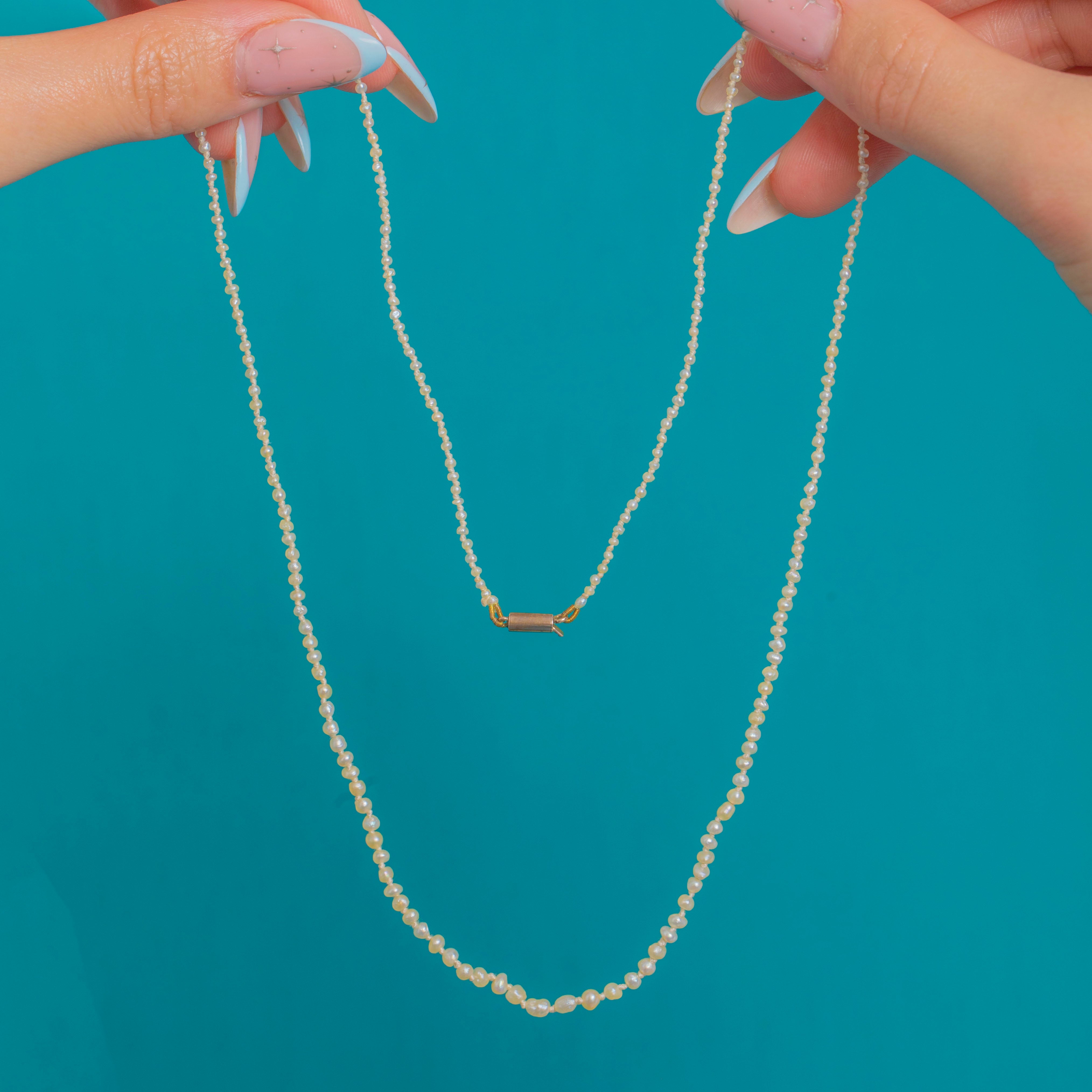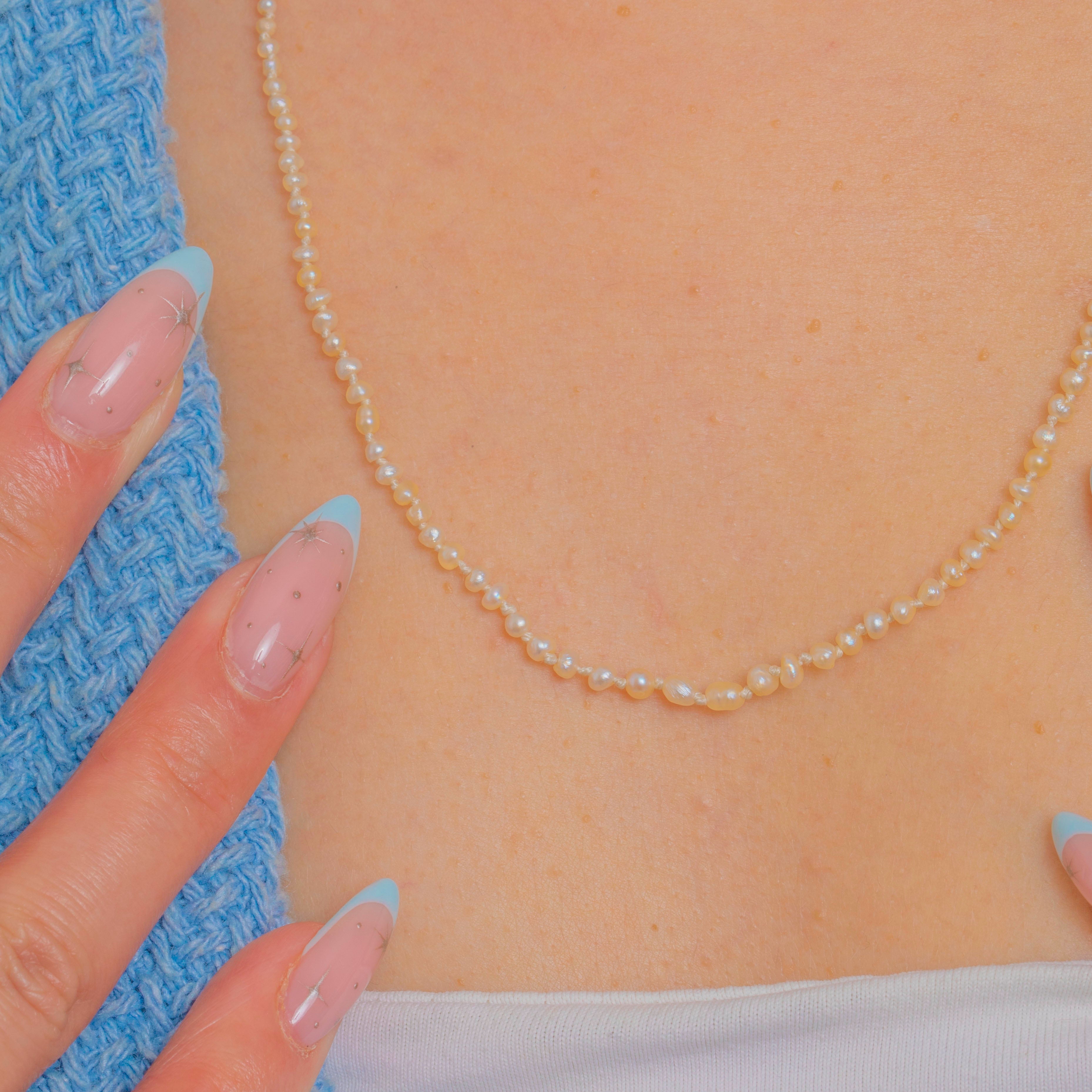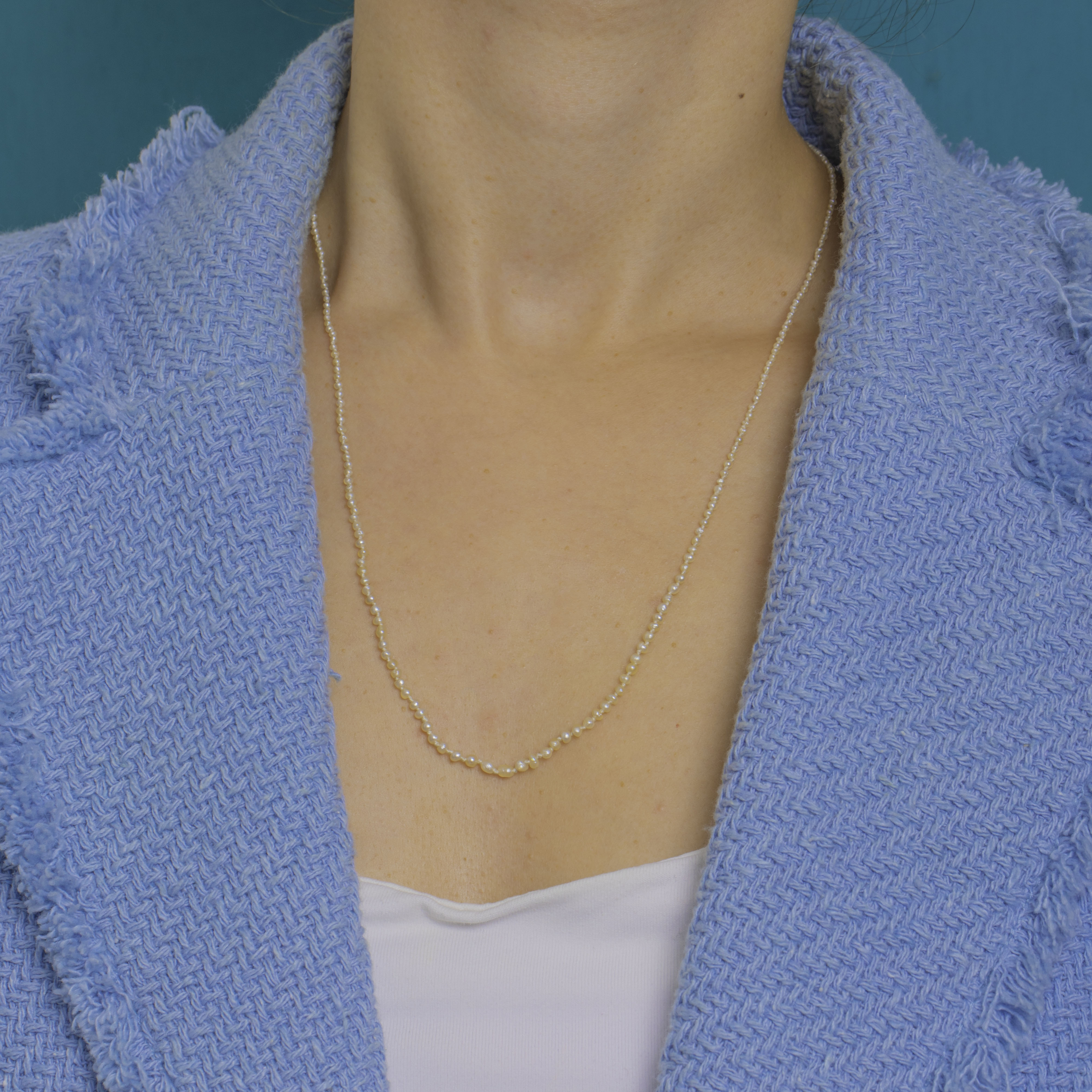 A whisper-fine Victorian strand of Natural Pearls, delicately graduated from tiny to petite and threaded for an elegant, fluid drape. The soft off-white to cream hues and gentle lustre lend a timeless, minimalist beauty that flatters any neckline.