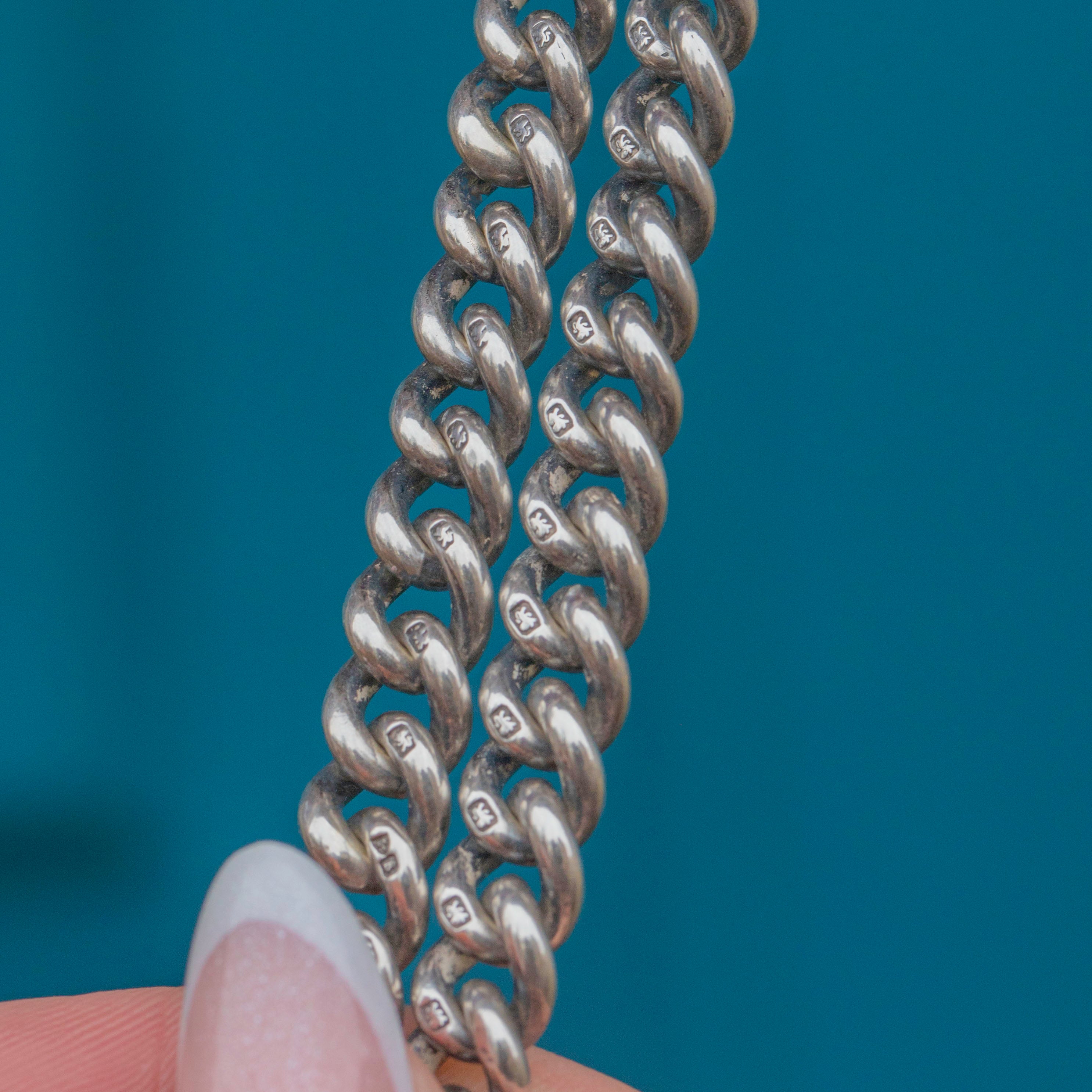 VERY GOOD-EXCELLENT: This antique Silver Albert chain is in superb condition. The links are uniform and secure, and her dog-clips are in perfect working order. There are some minor signs of wear to the Silver commensurate with age, however, this is difficult to spot without a jeweller's loupe. In great condition, this Victorian chain is a must-have!