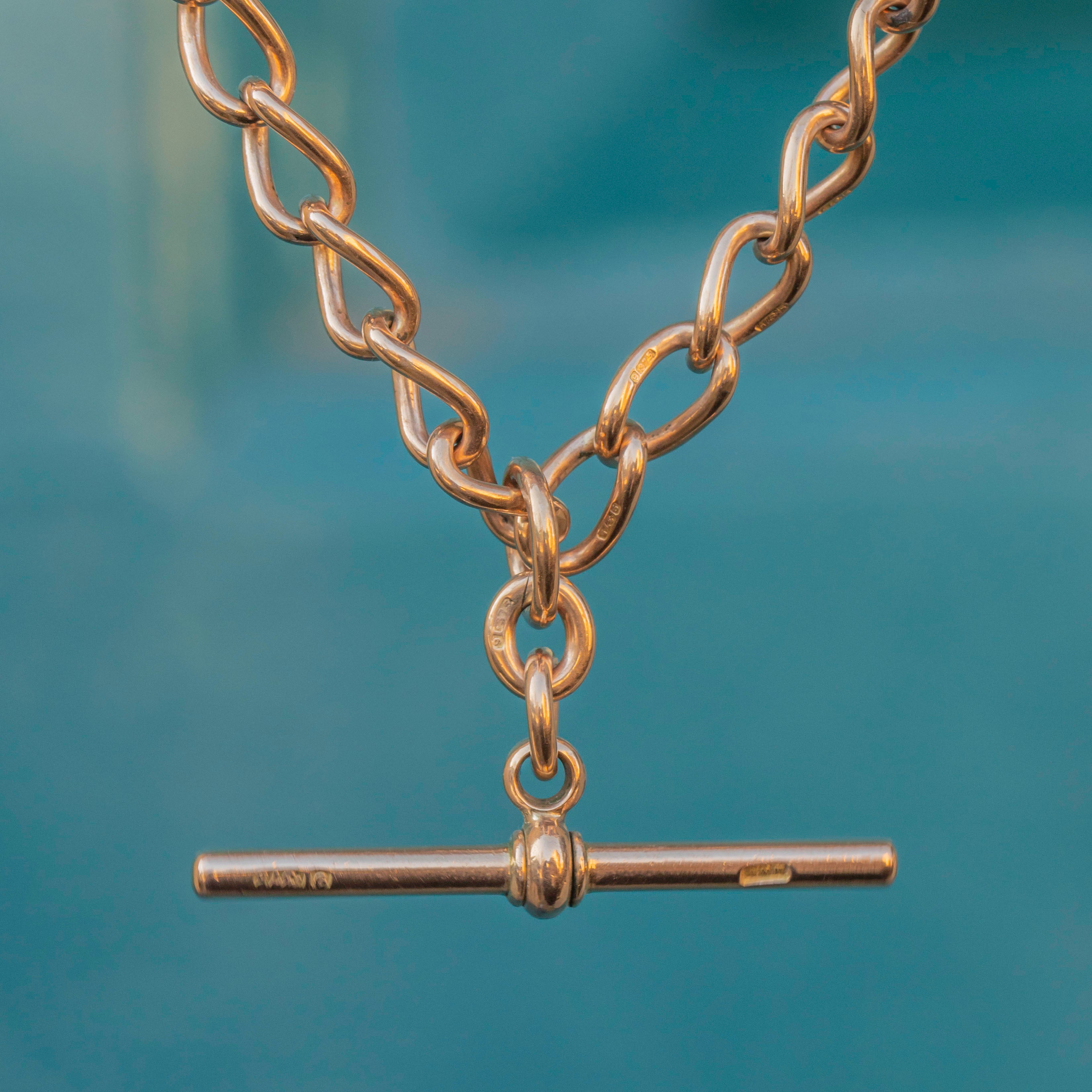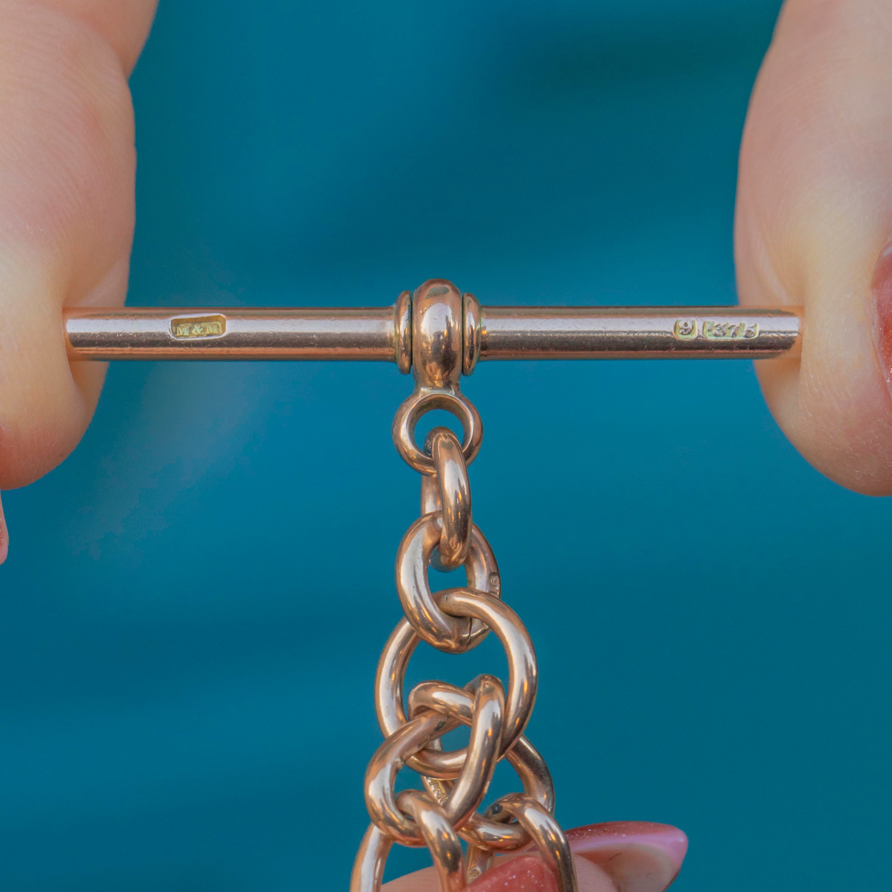 EXCELLENT. This antique 9ct Gold Albert chain is in excellent condition. Every luscious link is secure and sturdy, with the bolt ring, dog clip and t-bar all intact. The Gold is bright with crisp stamps on each component. This is a stunning chain you need in your collection!
