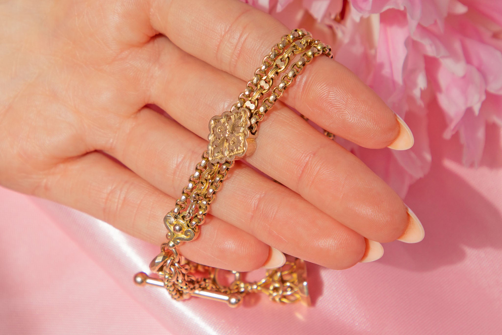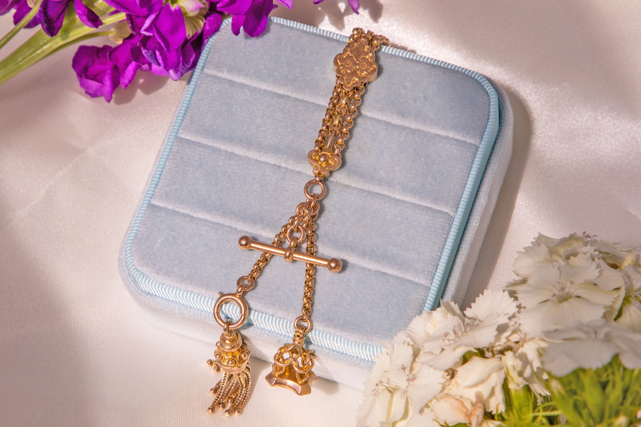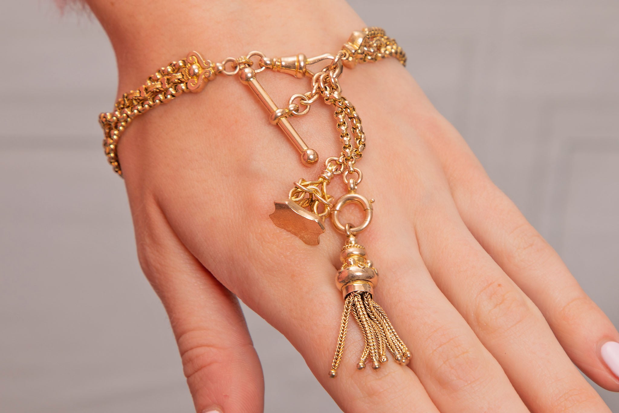 Bracelet à breloques coulissant Albertina en or 9 carats antique, pompon amovible et mini médaillon, 21,7 g