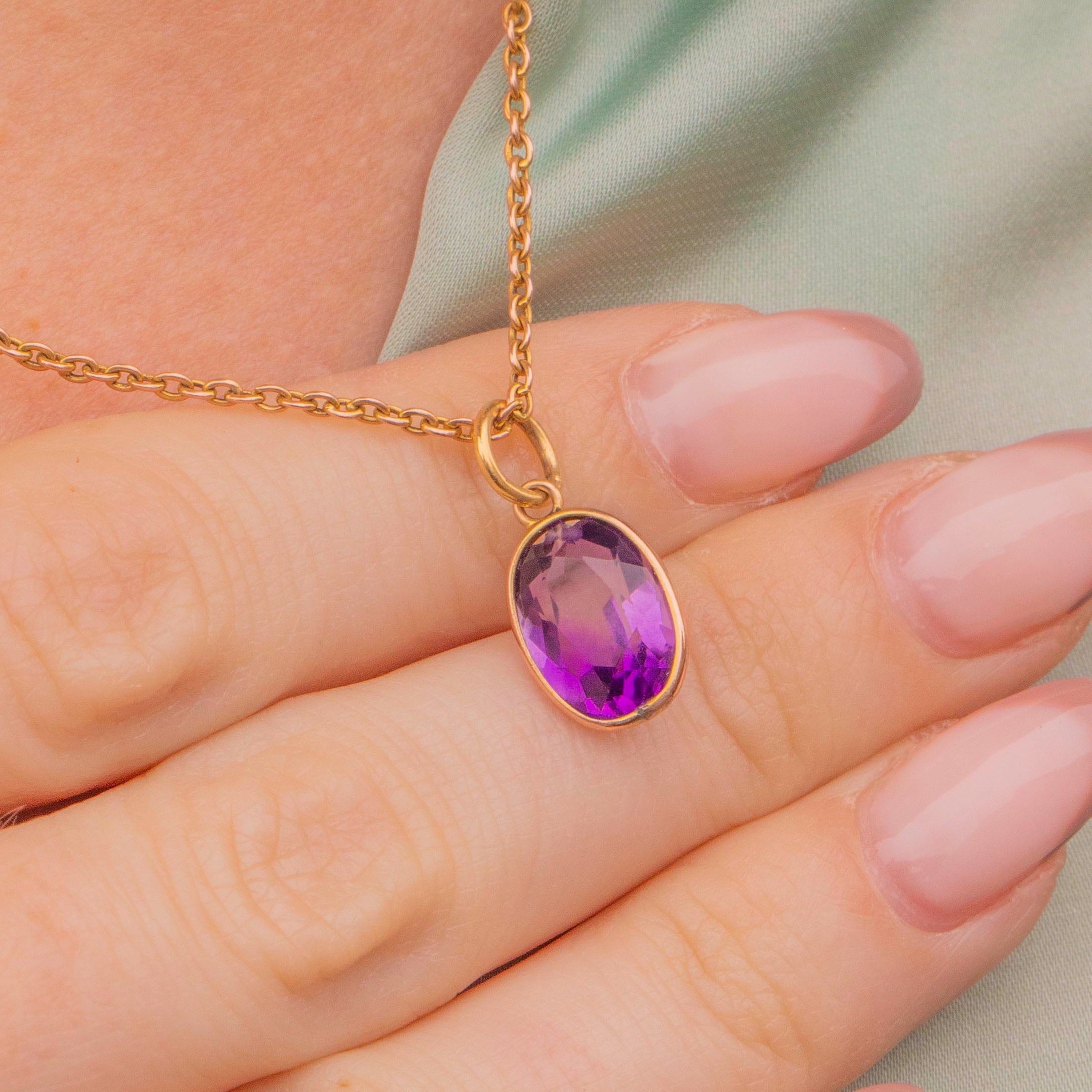 VERY GOOD. This antique 9ct Gold Amethyst bezel-set charm is in very good condition. Her Amethyst is radiant and faceted beautifully. She has a few minor nibbles, however this is only noticeable under close inspection and does not detract from her beauty. She sits nicely within her bezel setting and with a securely soldered jump ring, can be worn with confidence.