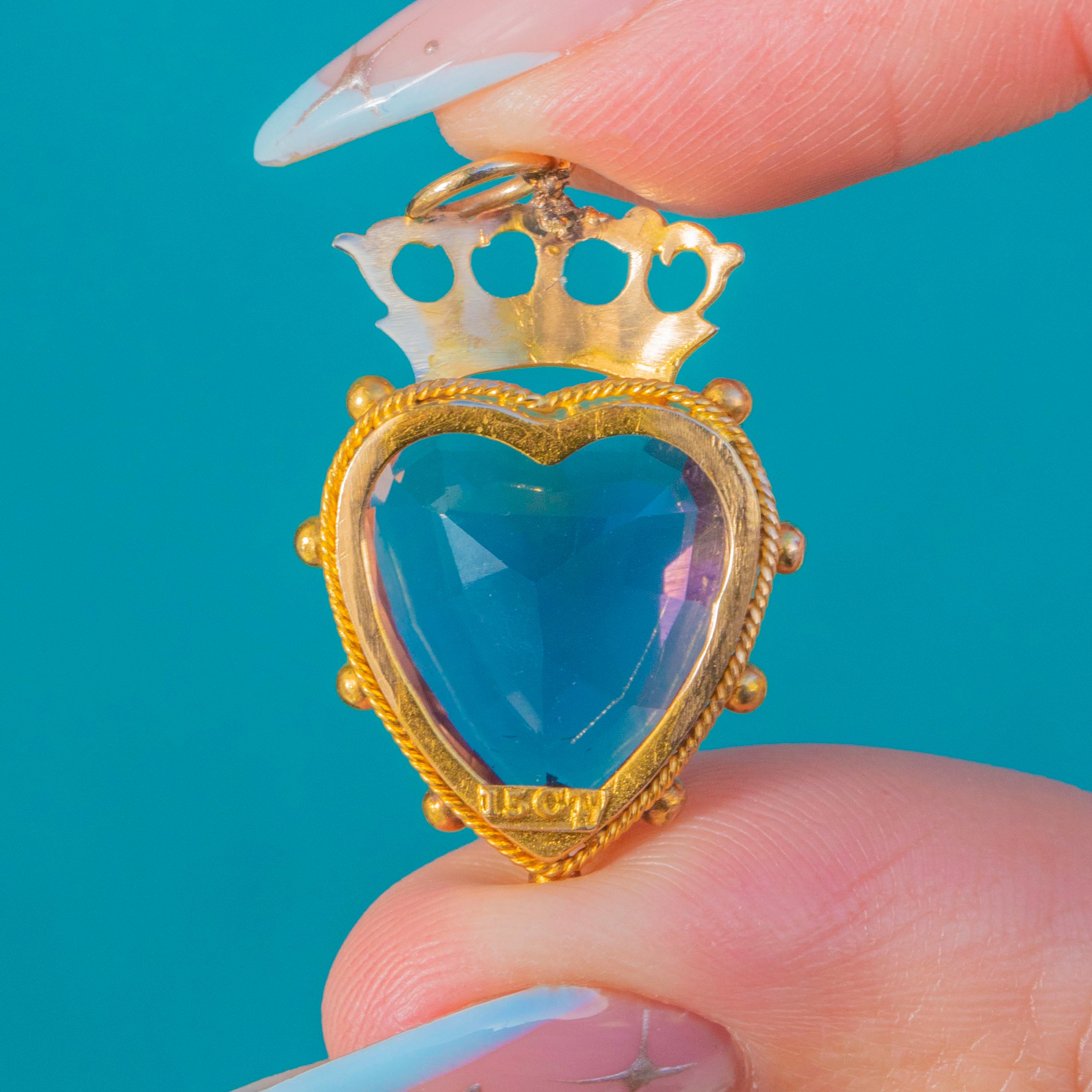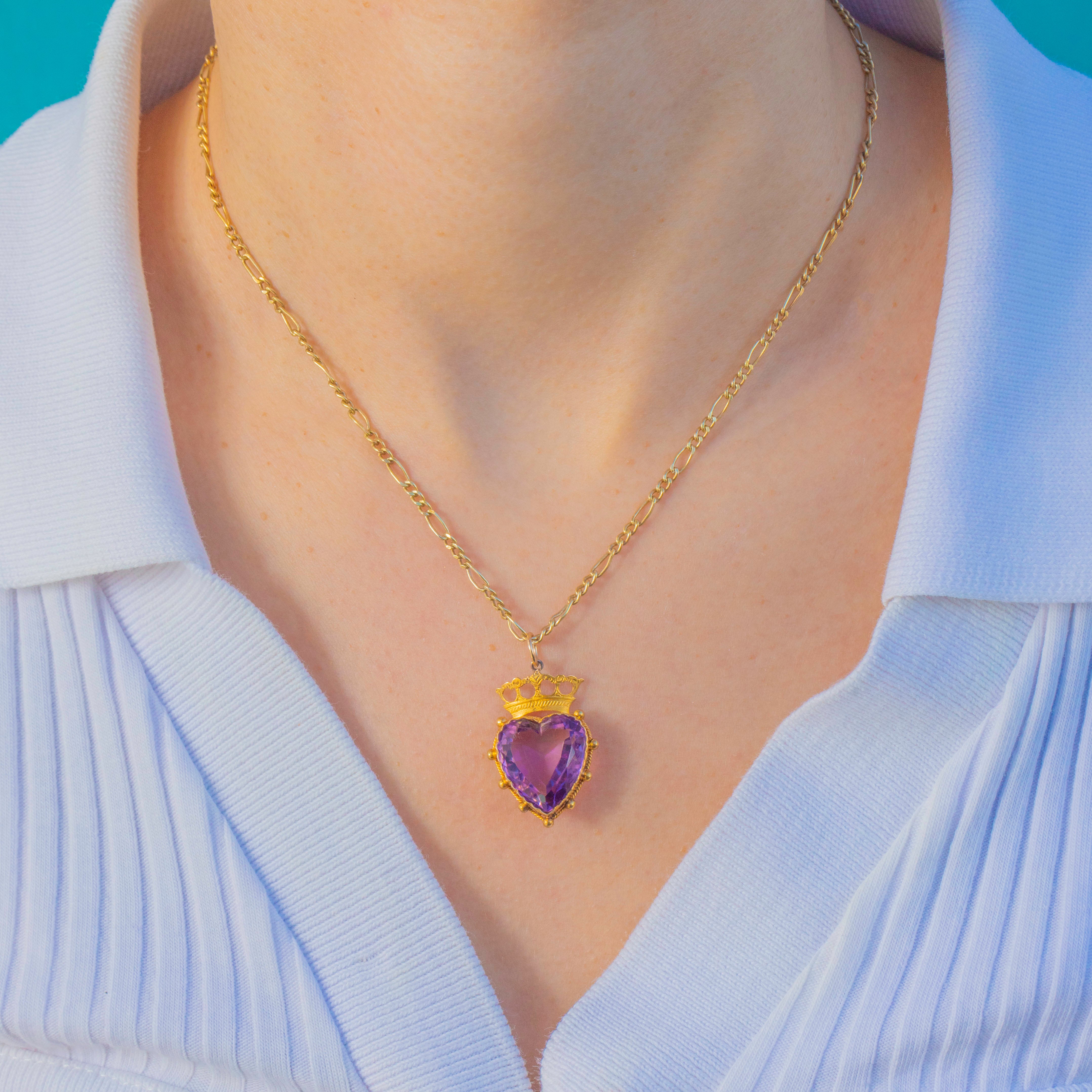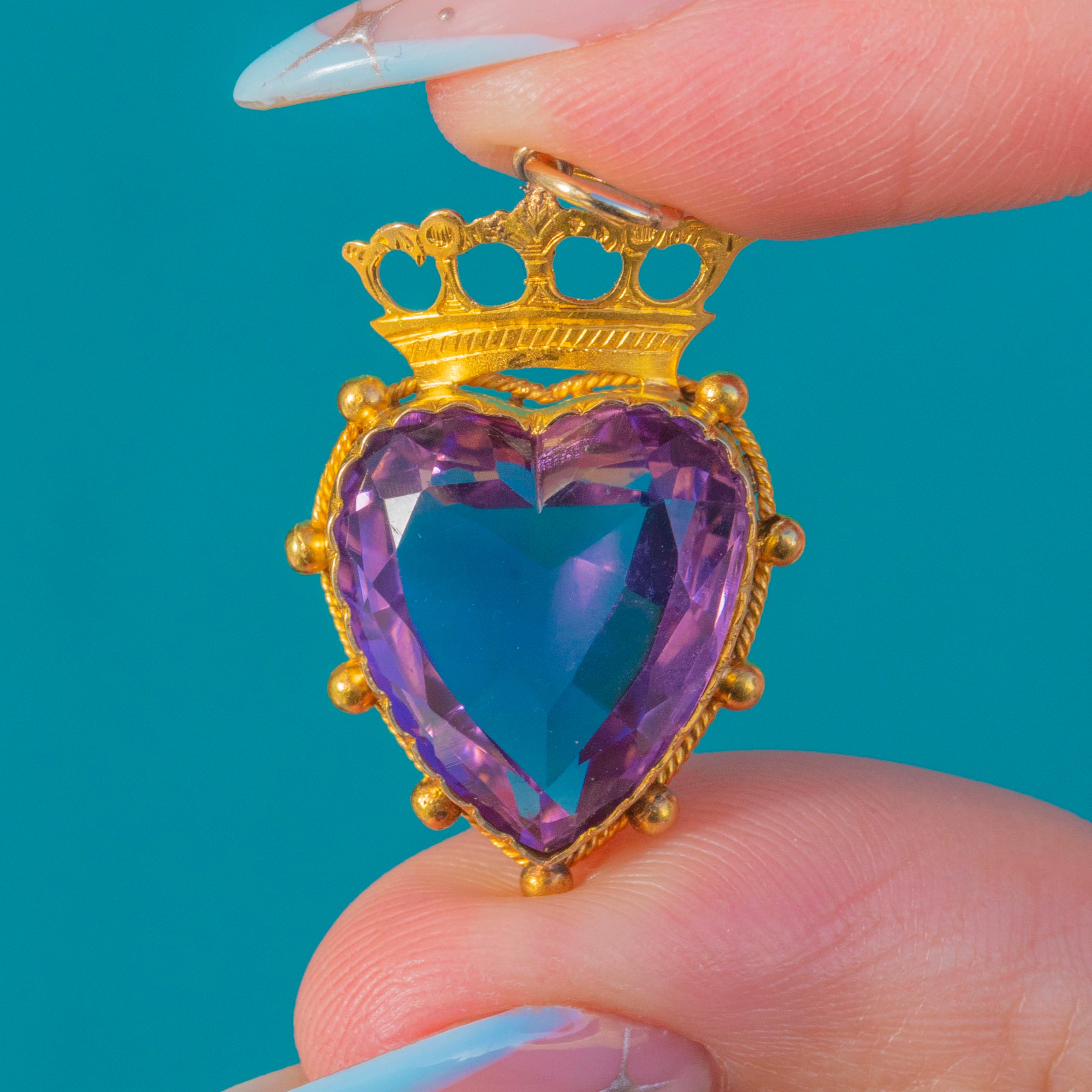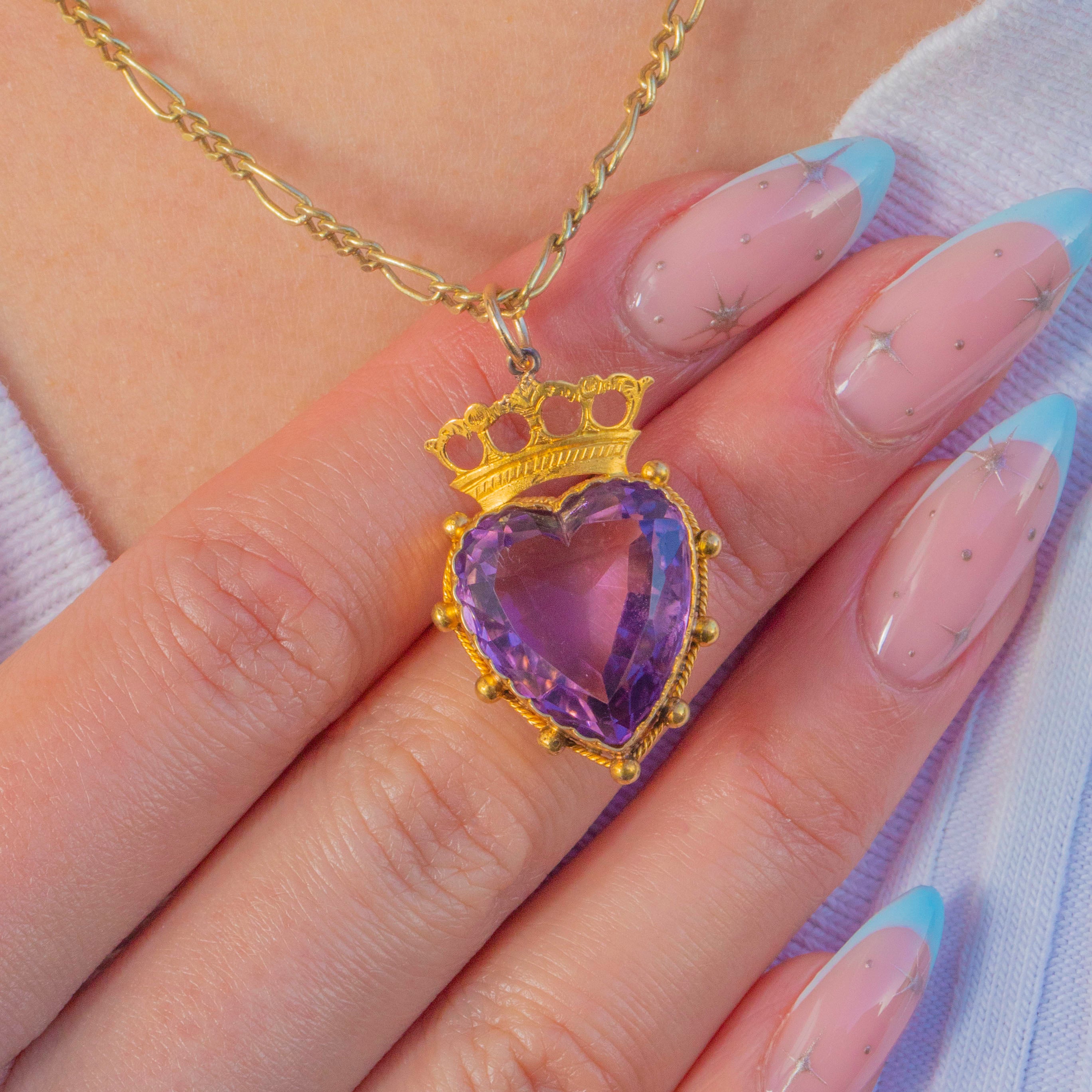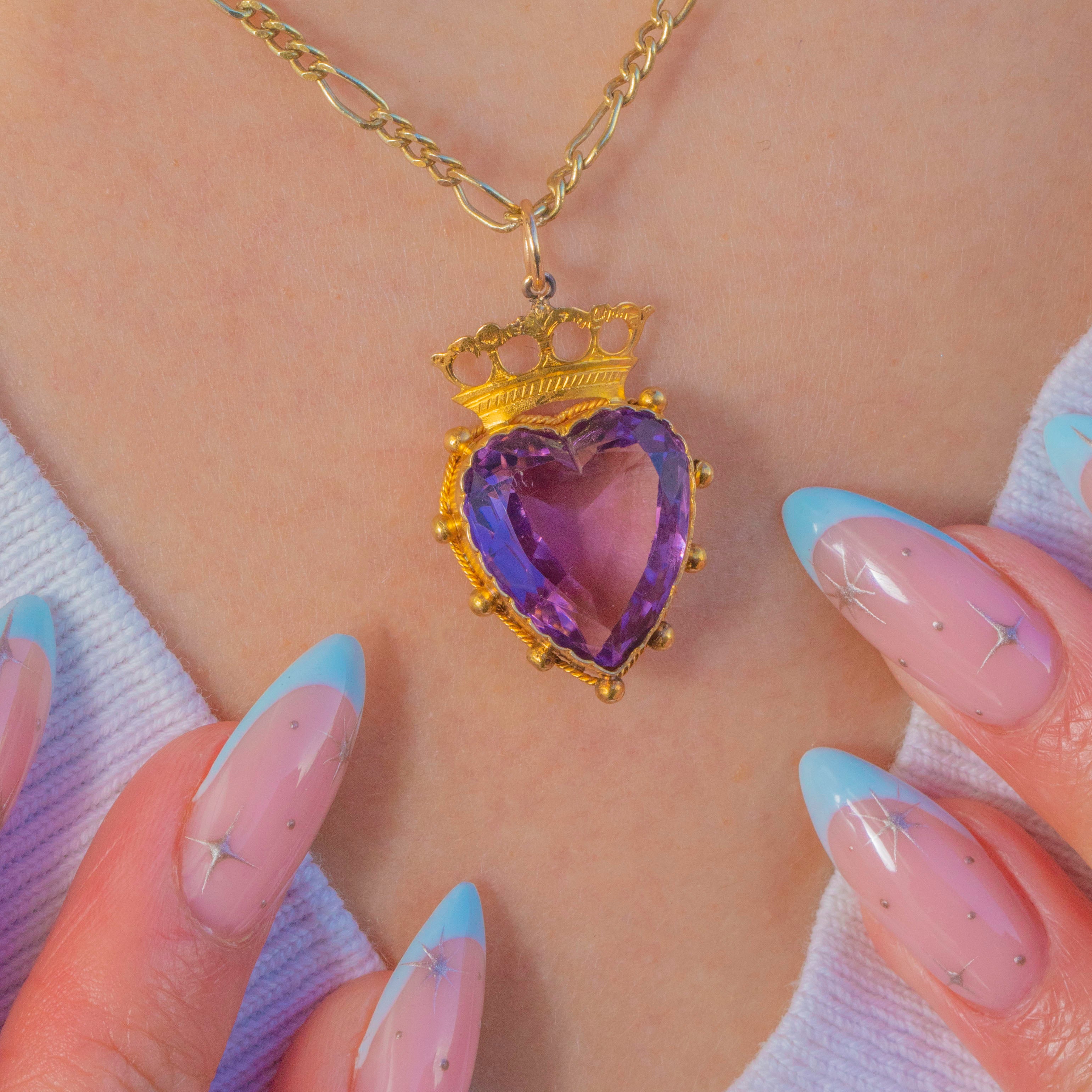 Regal and romantic, this Victorian crowned heart pendant is a miniature treasure in rich 15ct Gold. A heart-shaped Amethyst glows a sumptuous purple with lilac flashes, framed by a textured bezel, rope‑twist border and delicate granule beading. An openwork coronet sits proudly above, its crisp detailing lending a charming heraldic flourish.