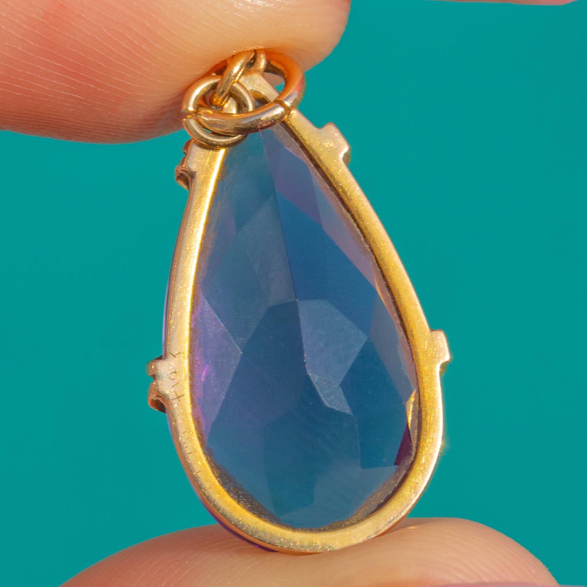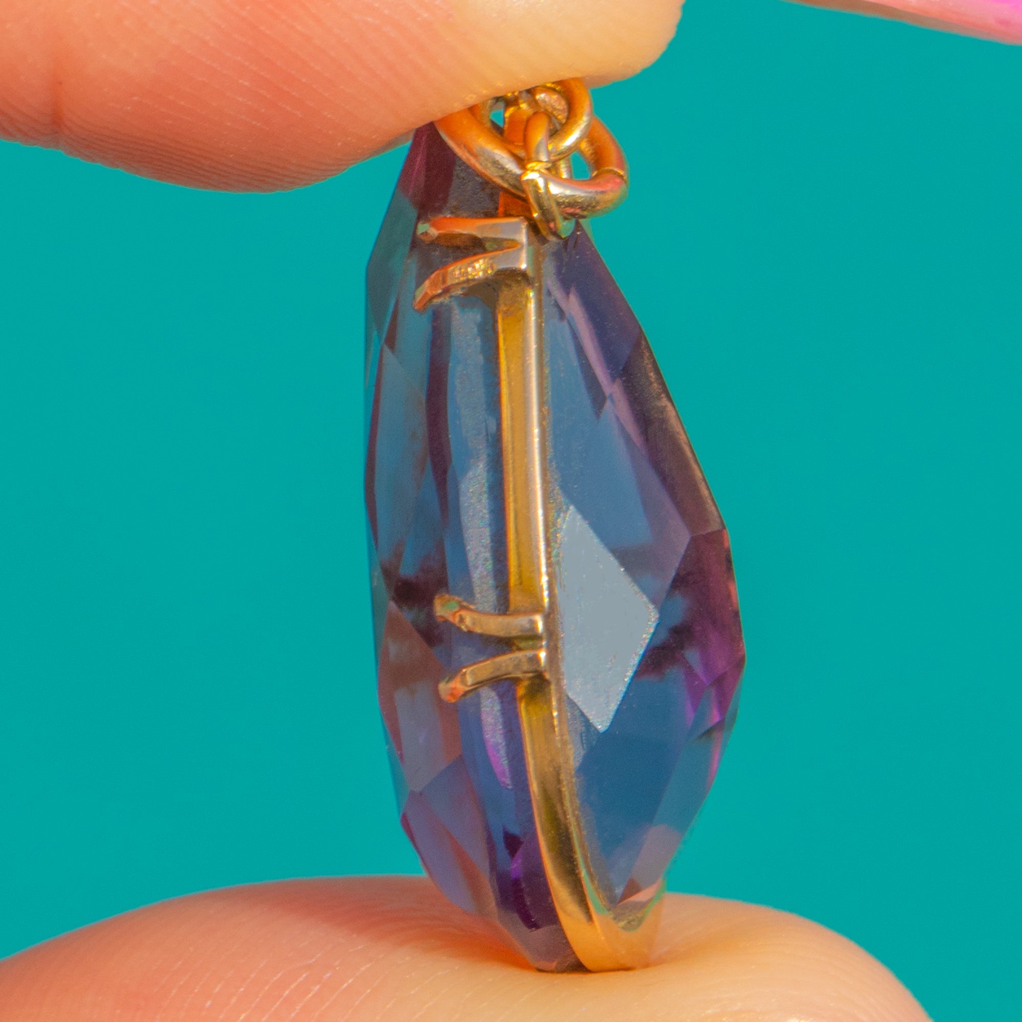 Bathed in a rich, velvety purple, this Victorian 9ct Gold pendant showcases a substantial 7.80ct Amethyst in a timeless teardrop design. The elegant pear-cut is framed by a slim Gold mount with secure claws and a neat jump-ring bail, allowing the gemstone’s colour to take centre stage.