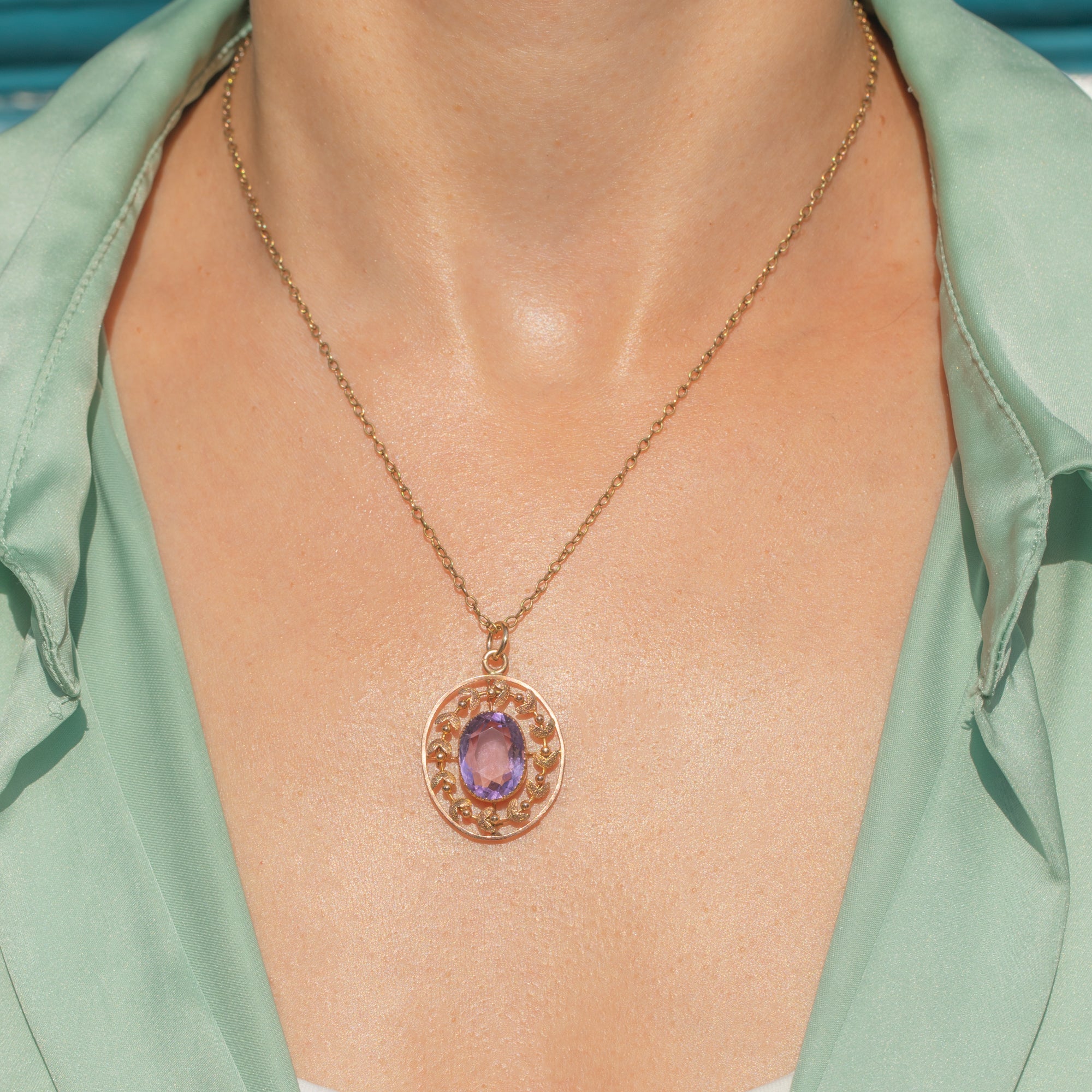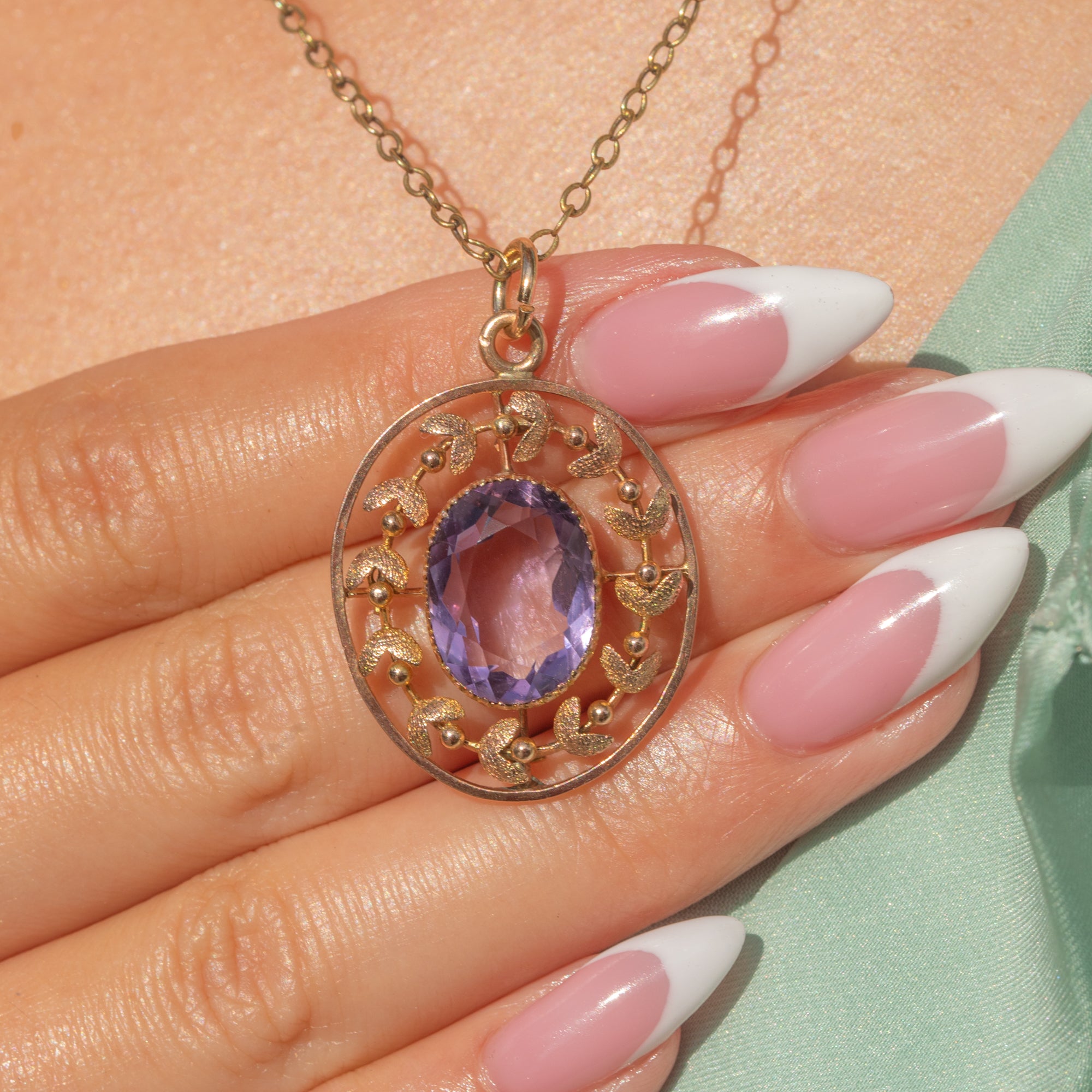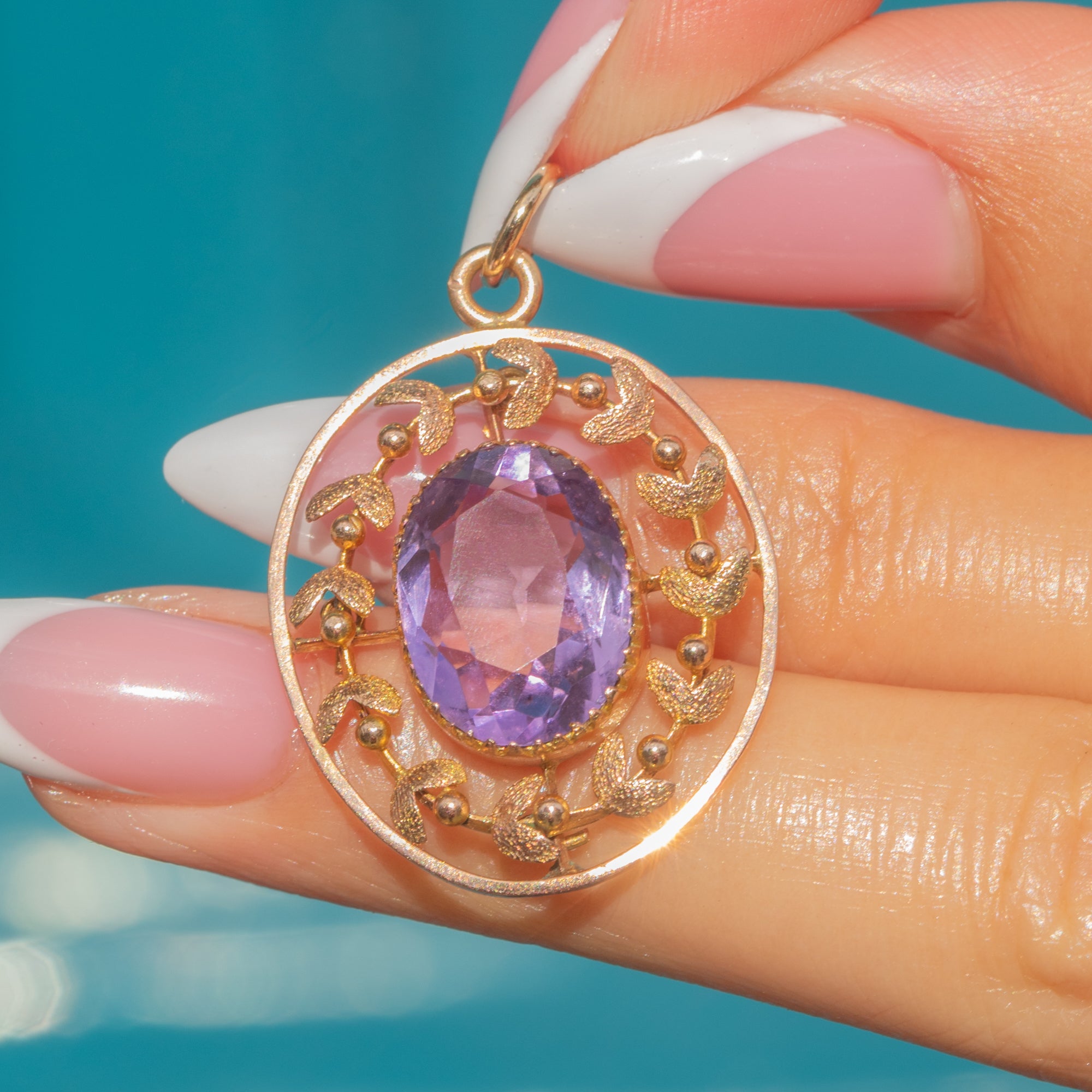 This Edwardian pendant is centred by a plump oval 3.35ct Amethyst, radiating vibrant lilac and lavender hues from its crisp facets as it catches the light. Crafted from rosy 9ct Gold, the gemstone is encircled by a decorative mistletoe leaf border - a common Edwardian motif synonymous with the romance of the era.