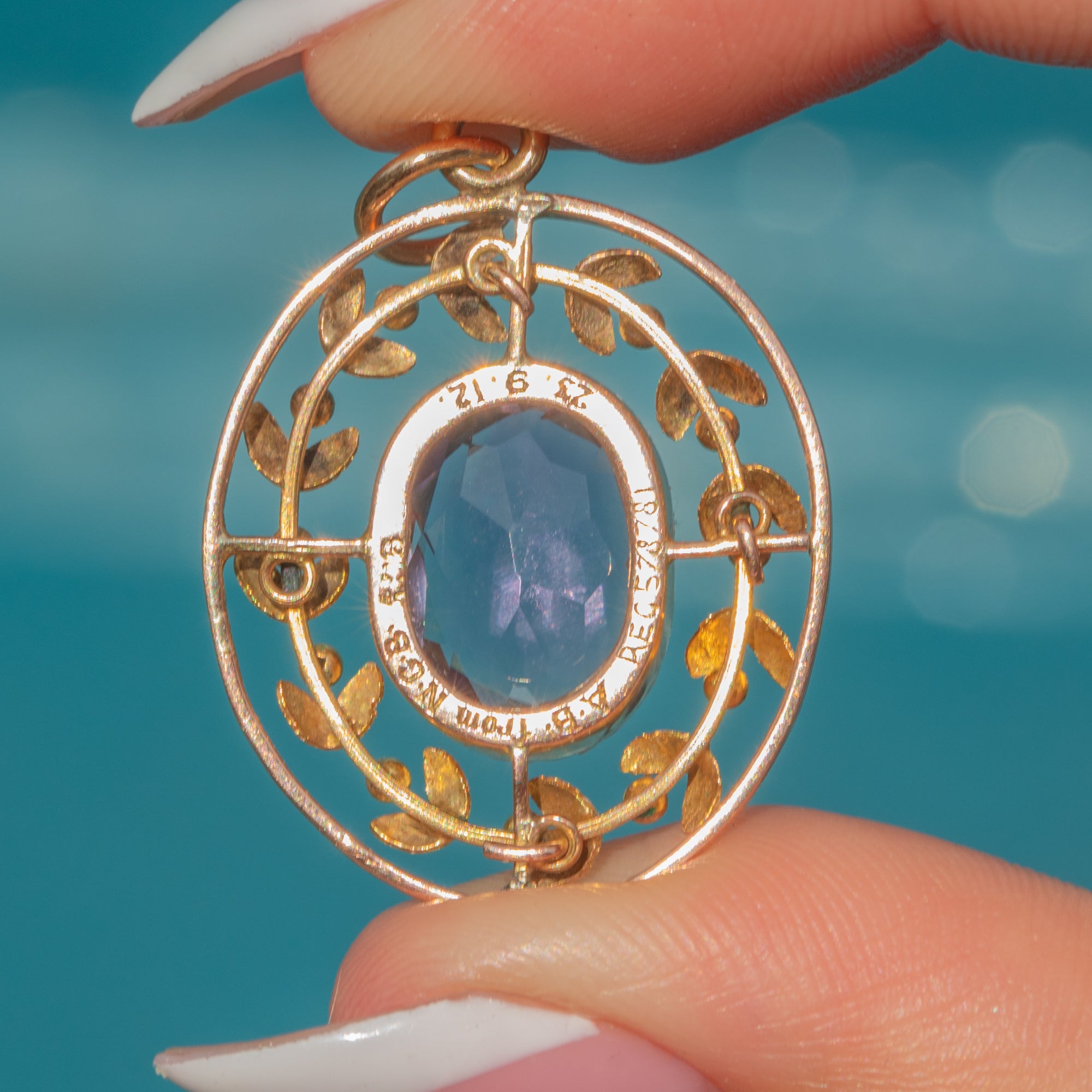 STAMPS: 9CT, 'A.B. from N.G.B. 23.9.12.' on pendant back.