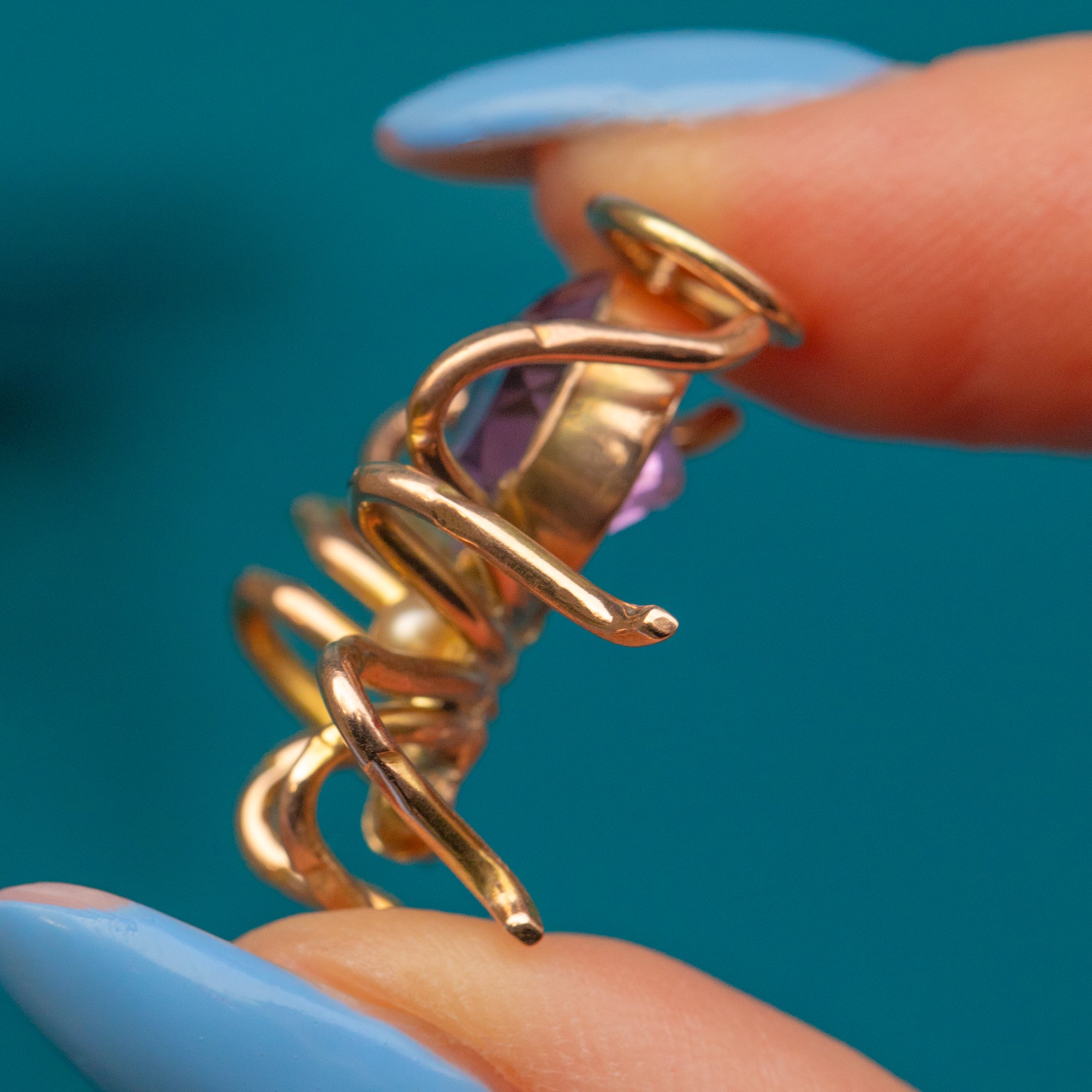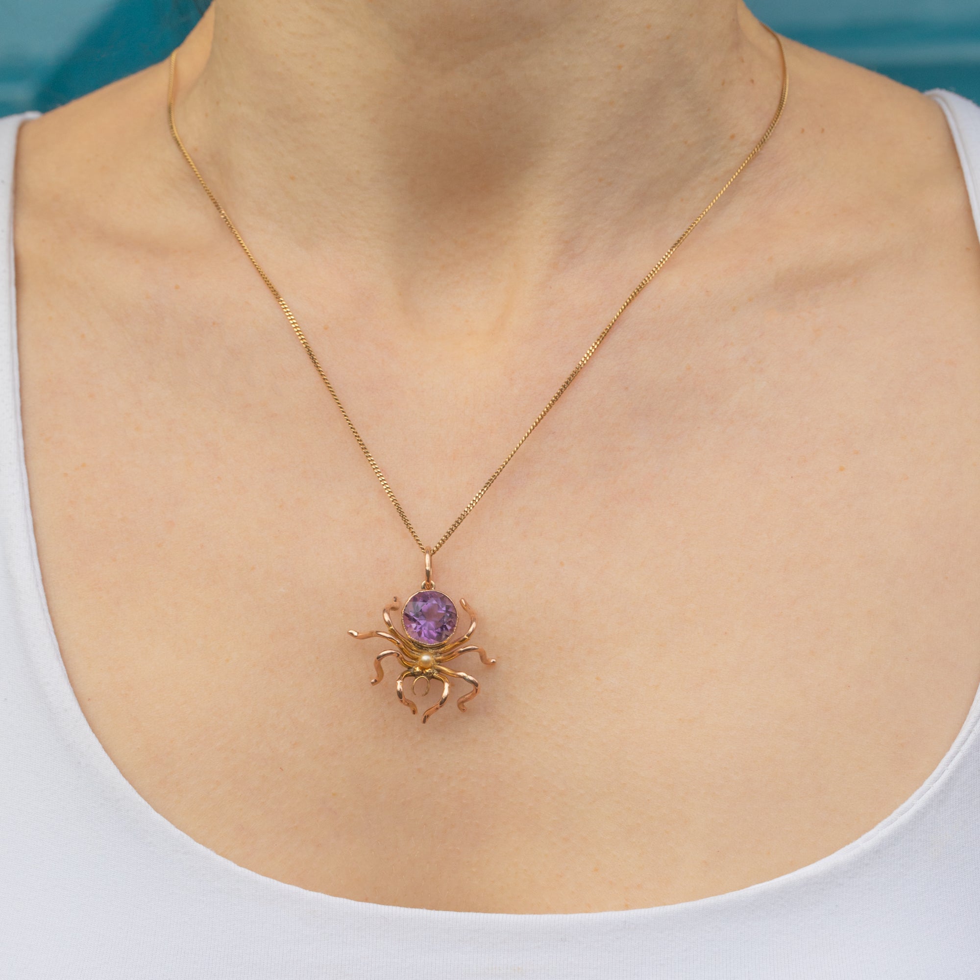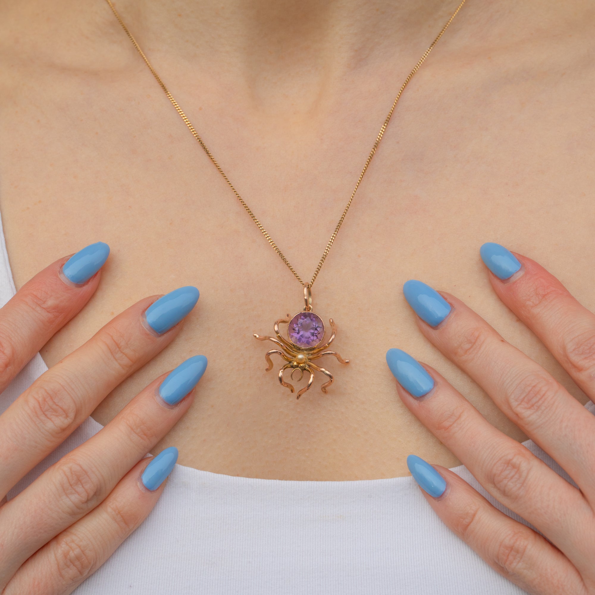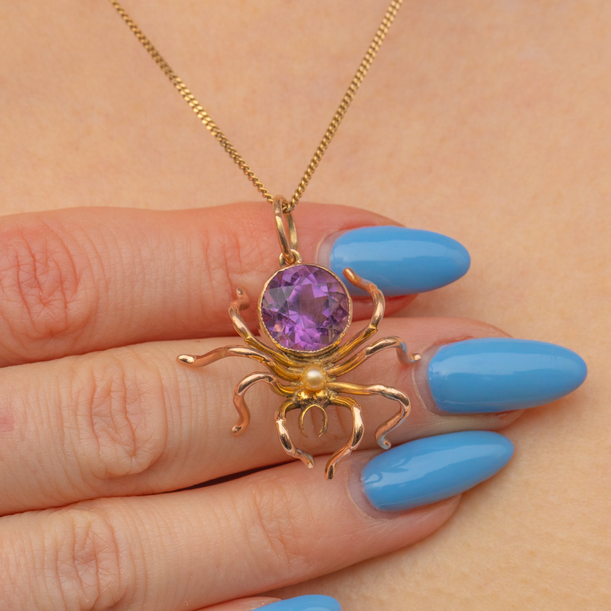 Add a unique flare to your collection with this characterful antique 9ct Gold Amethyst spider pendant! Crafted from solid 9ct Gold, the spider's body has been intricately formed and set with a glimmering 3.39ct Amethyst giving it bundles of personality.