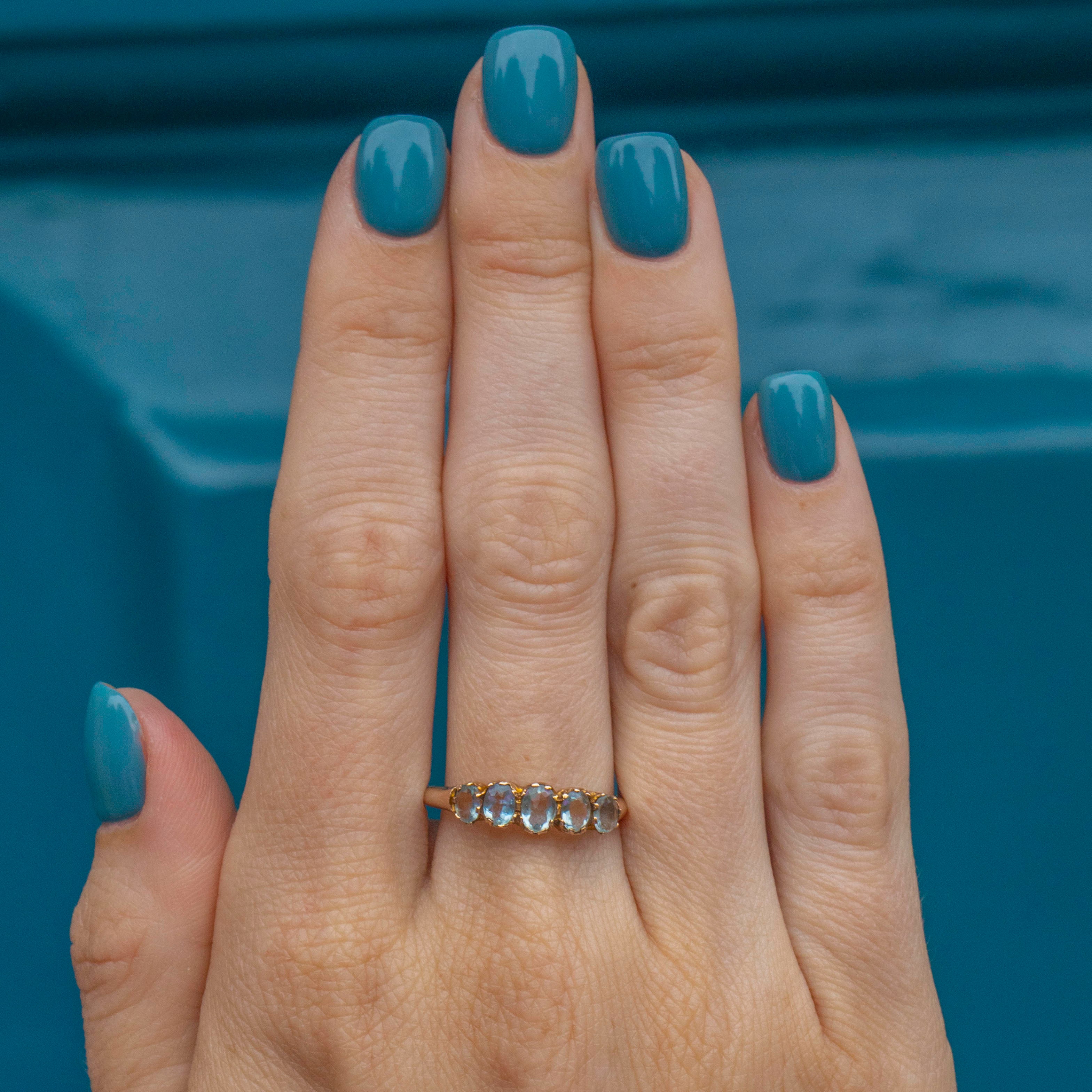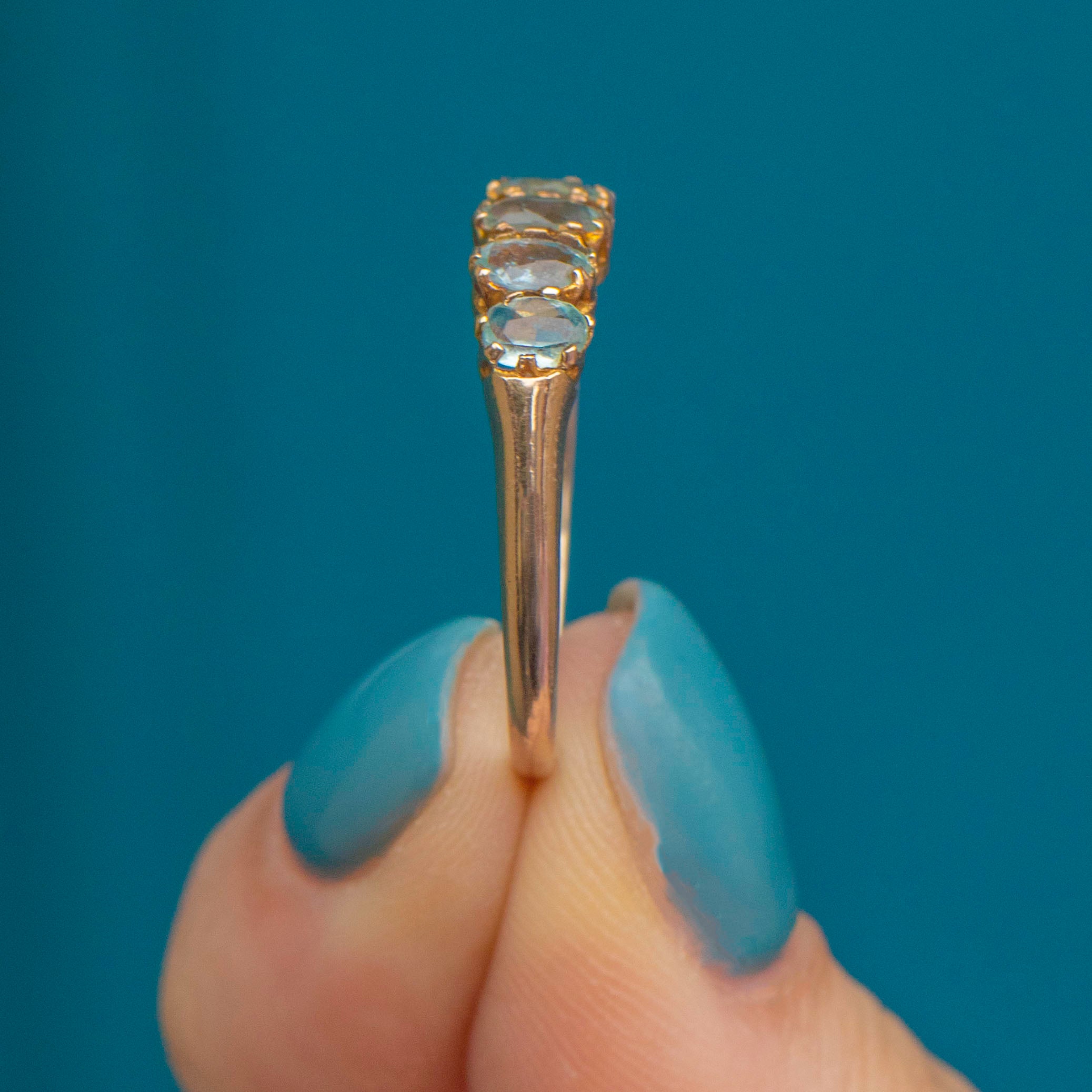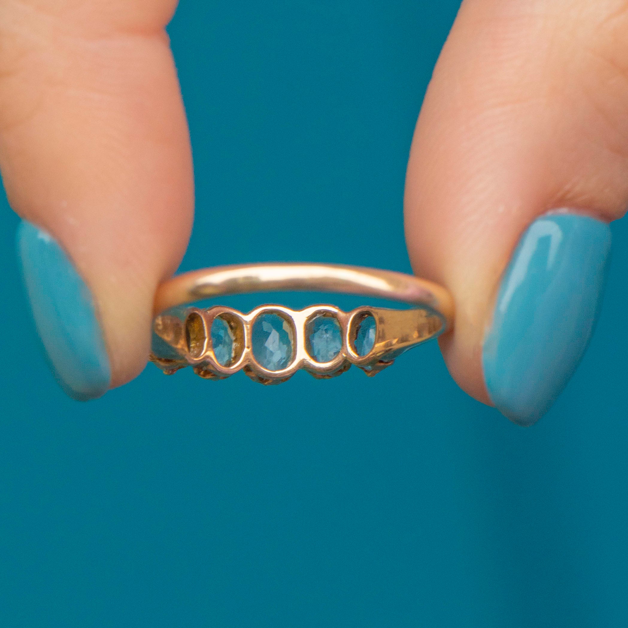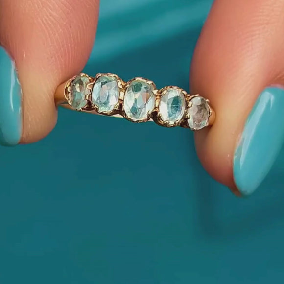 VERY GOOD-EXCELLENT. This antique 9ct Gold Aquamarine five stone ring is in wonderful condition! The Aquamarines sit securely, with all claws present and no damage to their facets. There is some subtle wear on the inside of the band, commensurate with age, but the outside has remained glossy and smooth. This Aquamarine Gold ring is the perfect piece for your summer collection!