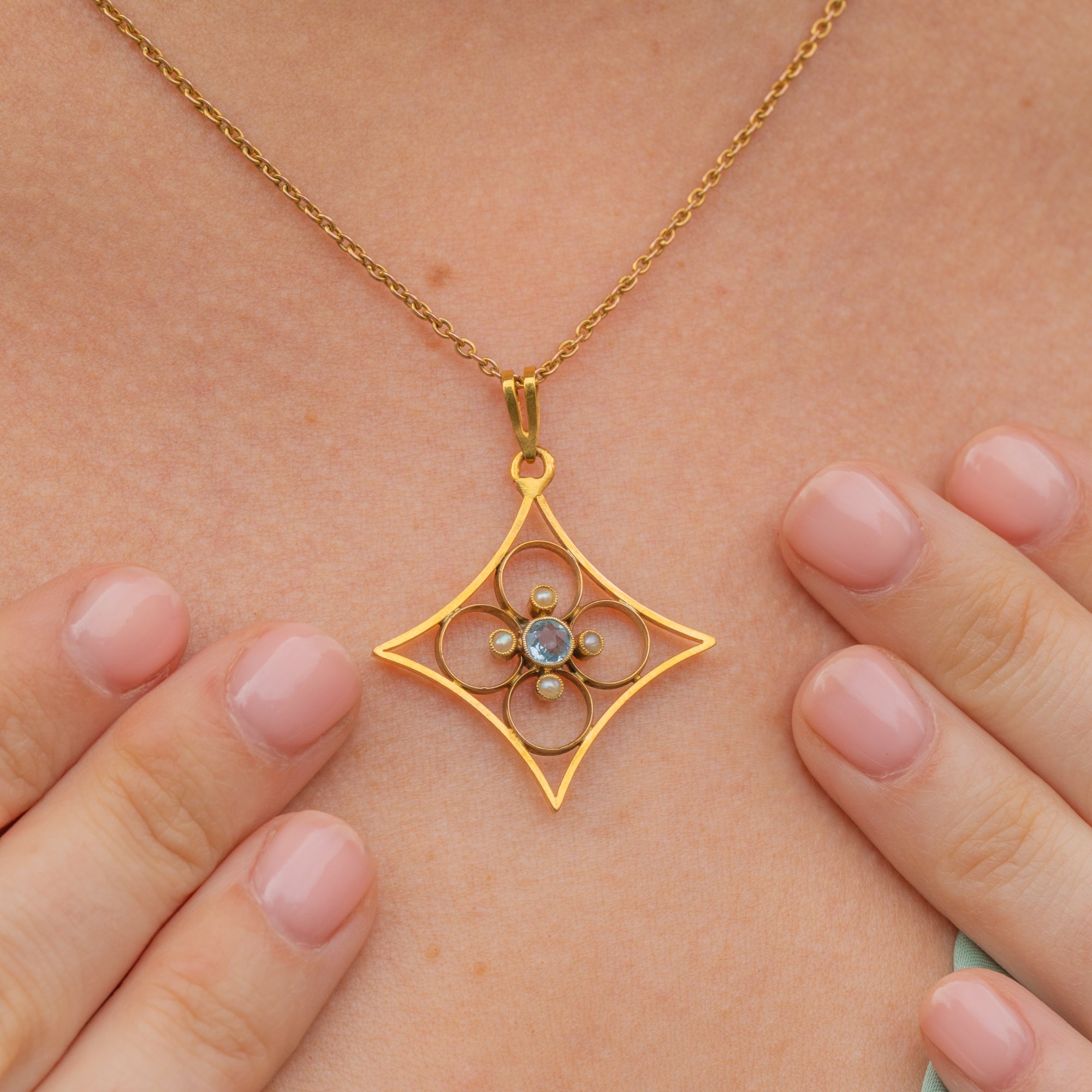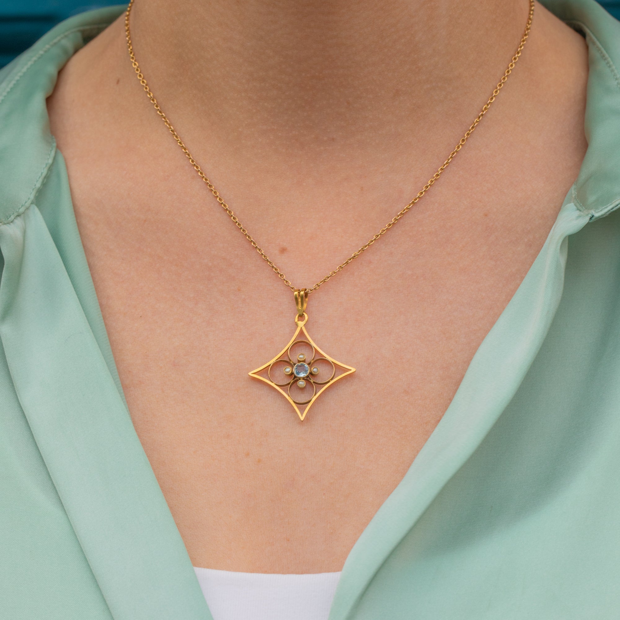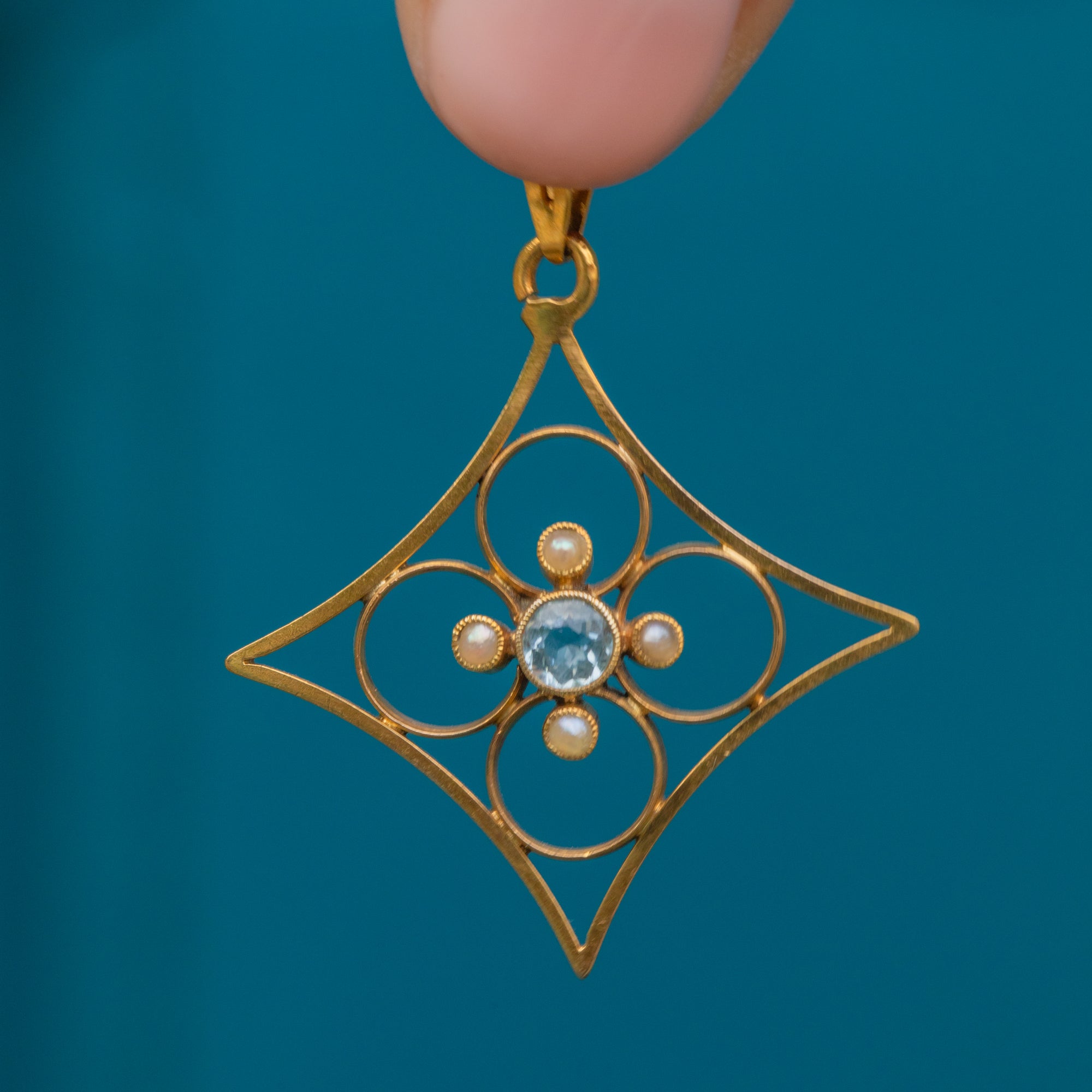 Admire the splendour of this antique 9ct Gold Aquamarine Pearl pendant! This whimsical pendant is quintessentially Edwardian, with elegant flowing lines, floral details and clever use of negative space throughout.