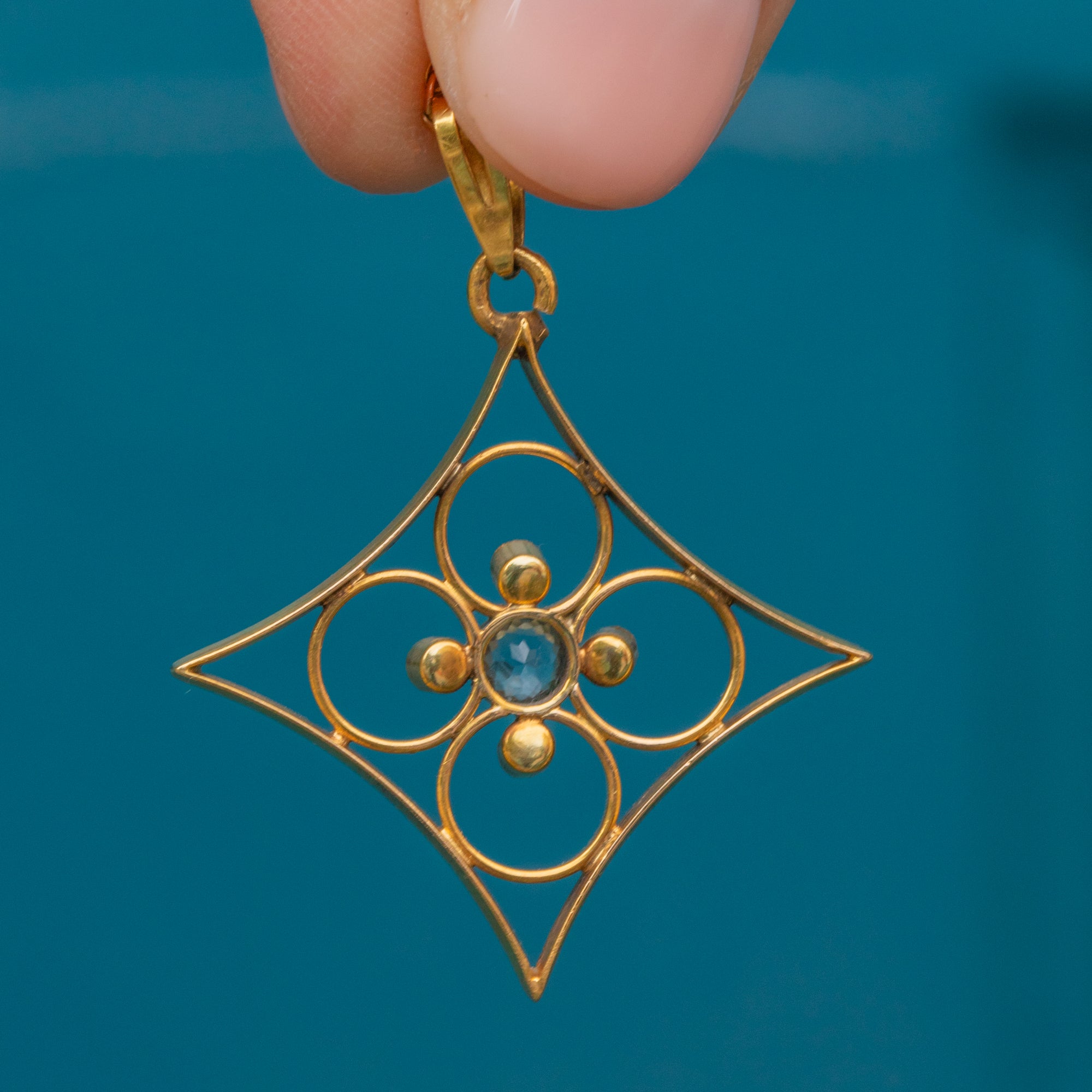 Crafted from honey-hued 9ct Gold, she has an icy blue natural Aquamarine at her centre. Complete with a sprinkling of precious Pearls, this Edwardian pendant will be the prettiest piece in your antique jewellery box!