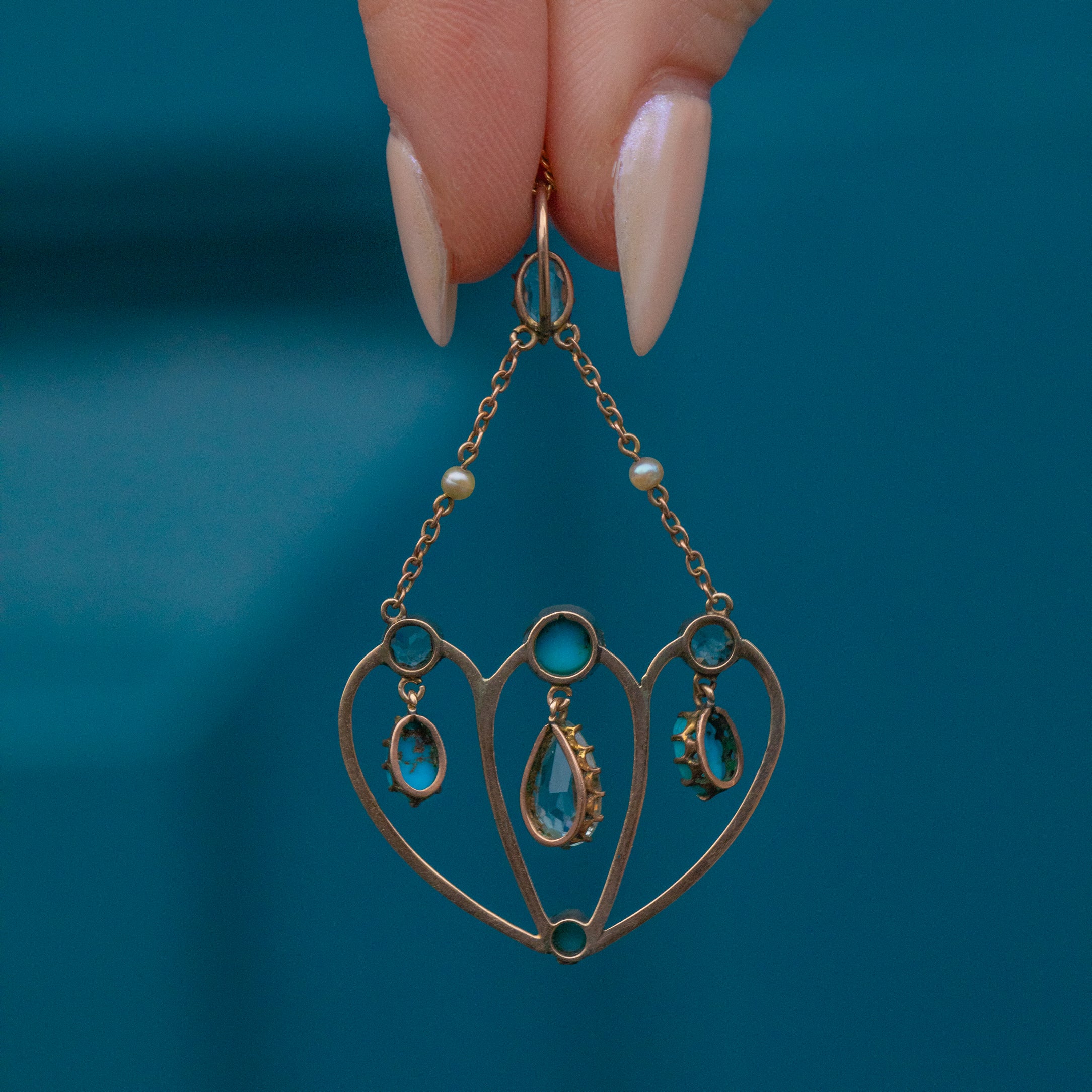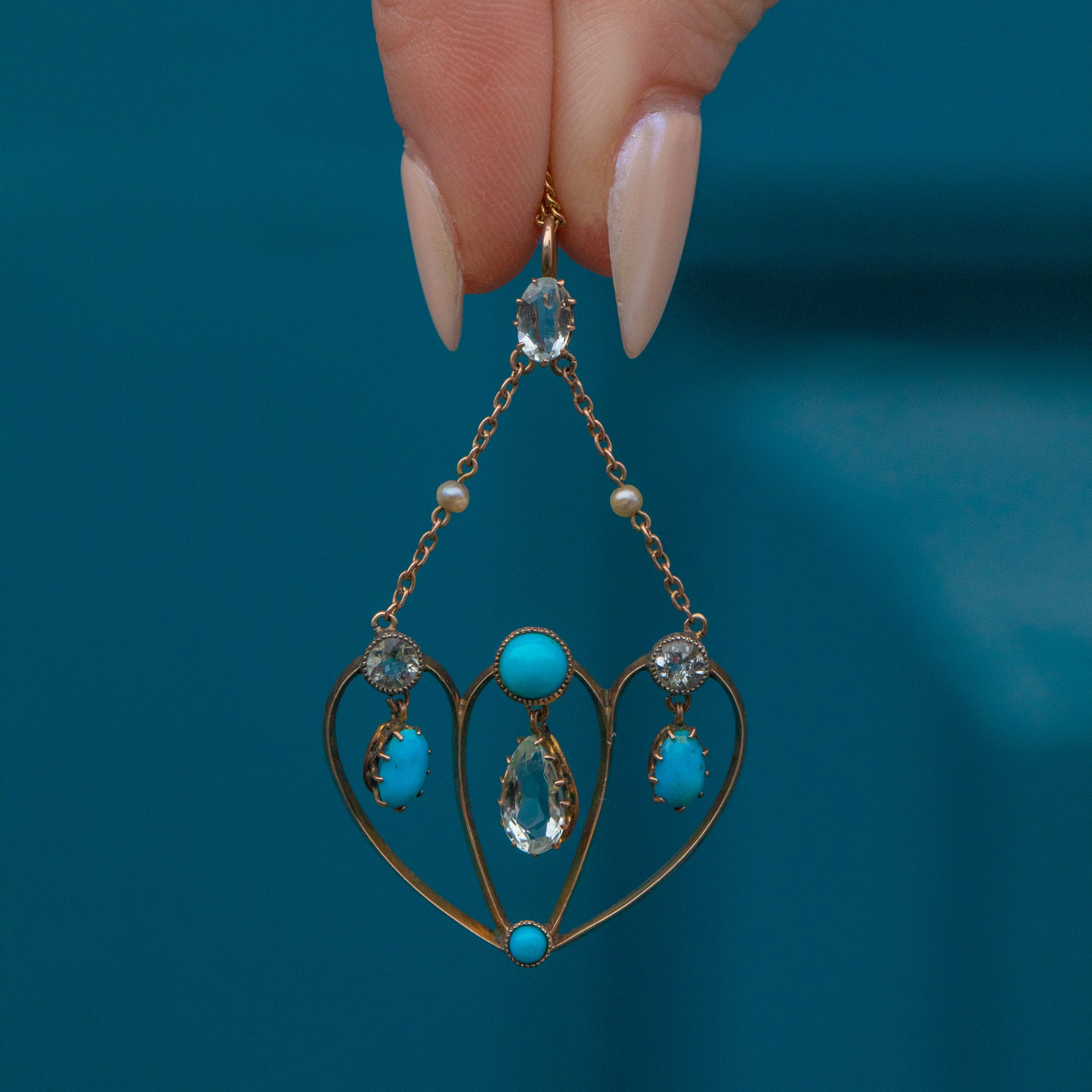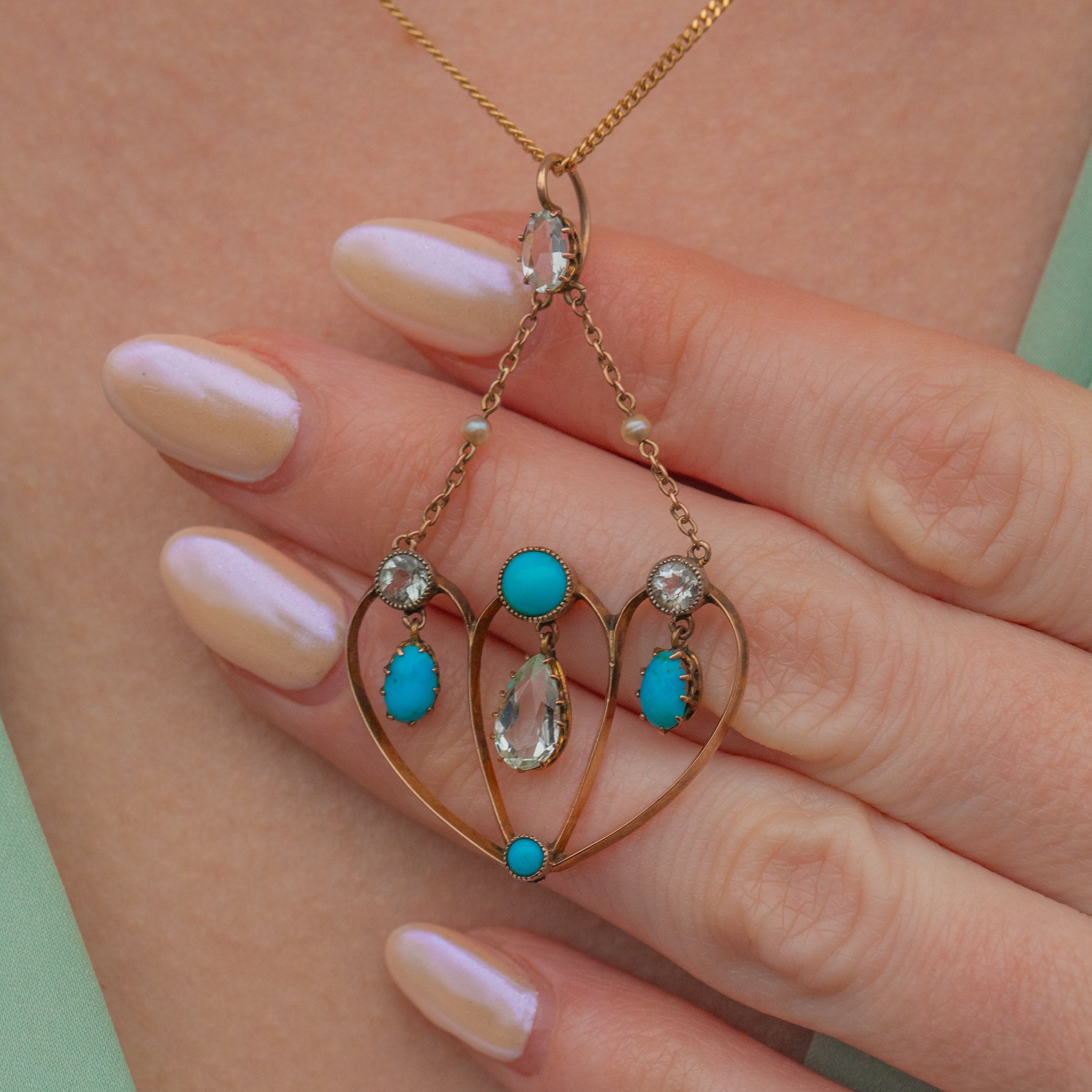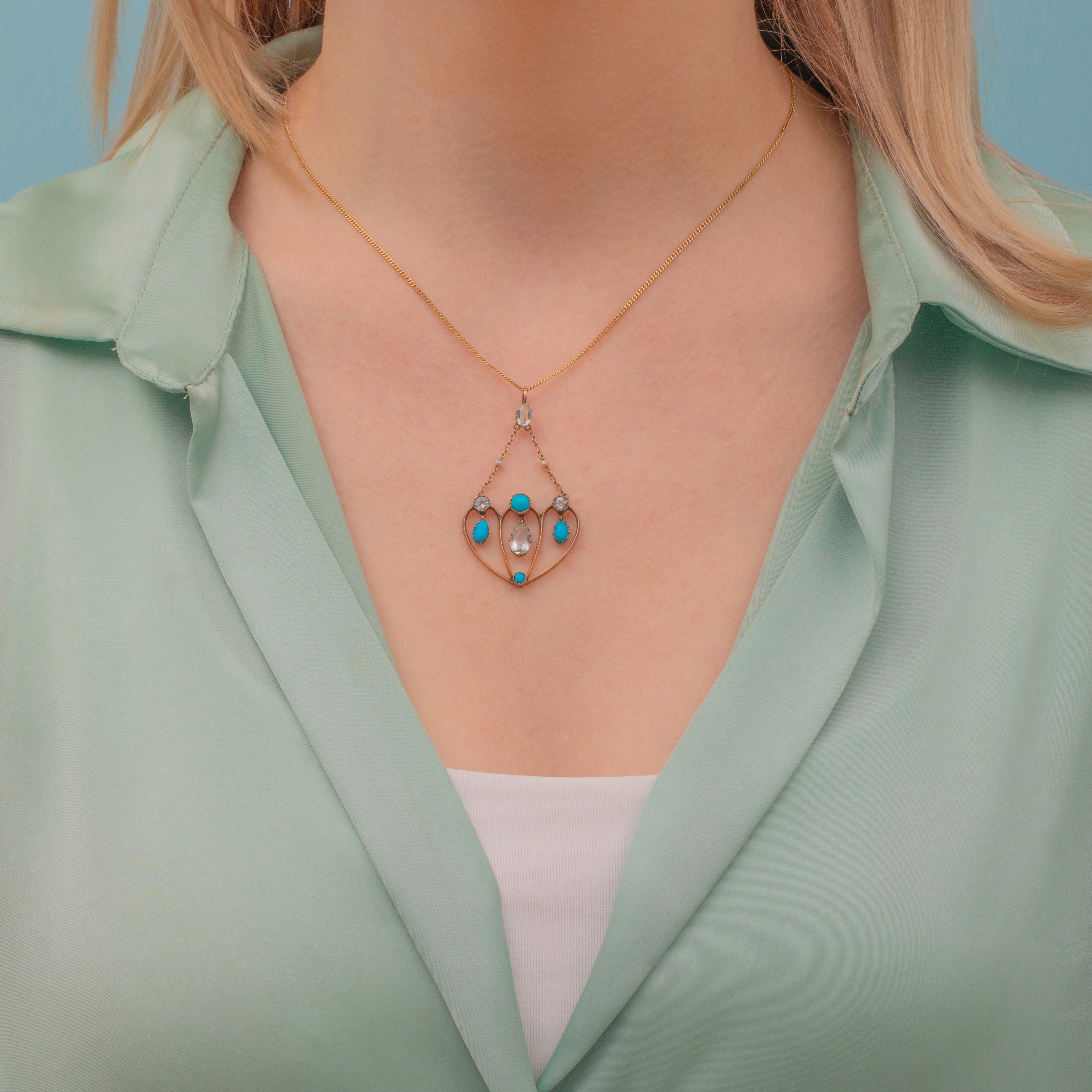 This enchanting antique 9ct Gold Aquamarine Turquoise pendant looks as though she's been plucked from a fairytale! The ornately formed 9ct Gold carries with it a lovely selection of gemstones, akin to tiny dew droplets on a frosty morning.
