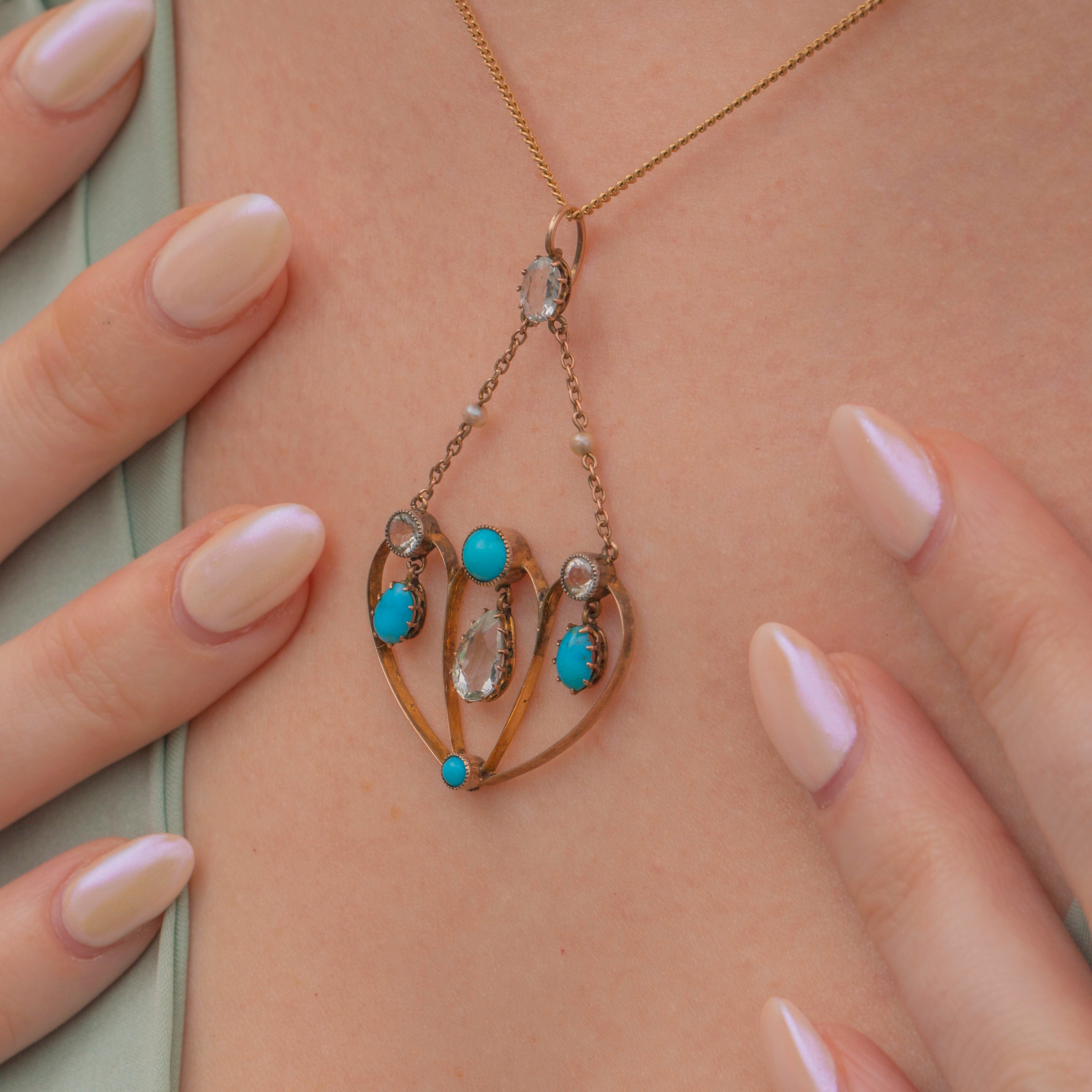VERY GOOD. This antique 9ct Gold Aquamarine Turquoise pendant is in very good condition. The Gold has a lovely buttery hue with only minor age-related surface wear and has remained structurally sound. The Turquoise are smoothly domed and securely set, with no chips or scuffs visible. There is a minor scuff on one of the Aquamarines, but the remaining three are pristine and they have all remained secure within their settings. The trace links are firmly connected and the Pearls are pristine. Promising many more years of wear, this Victorian pendant will make a superb addition to your collection!