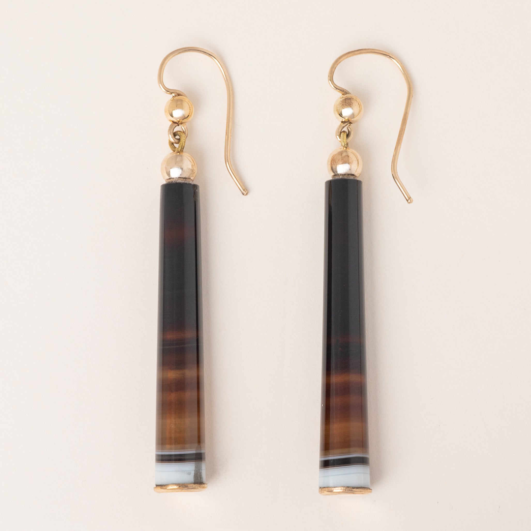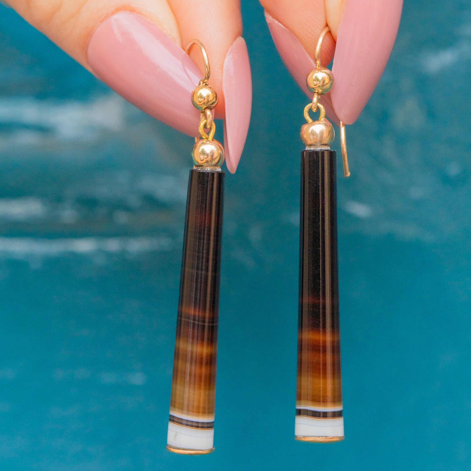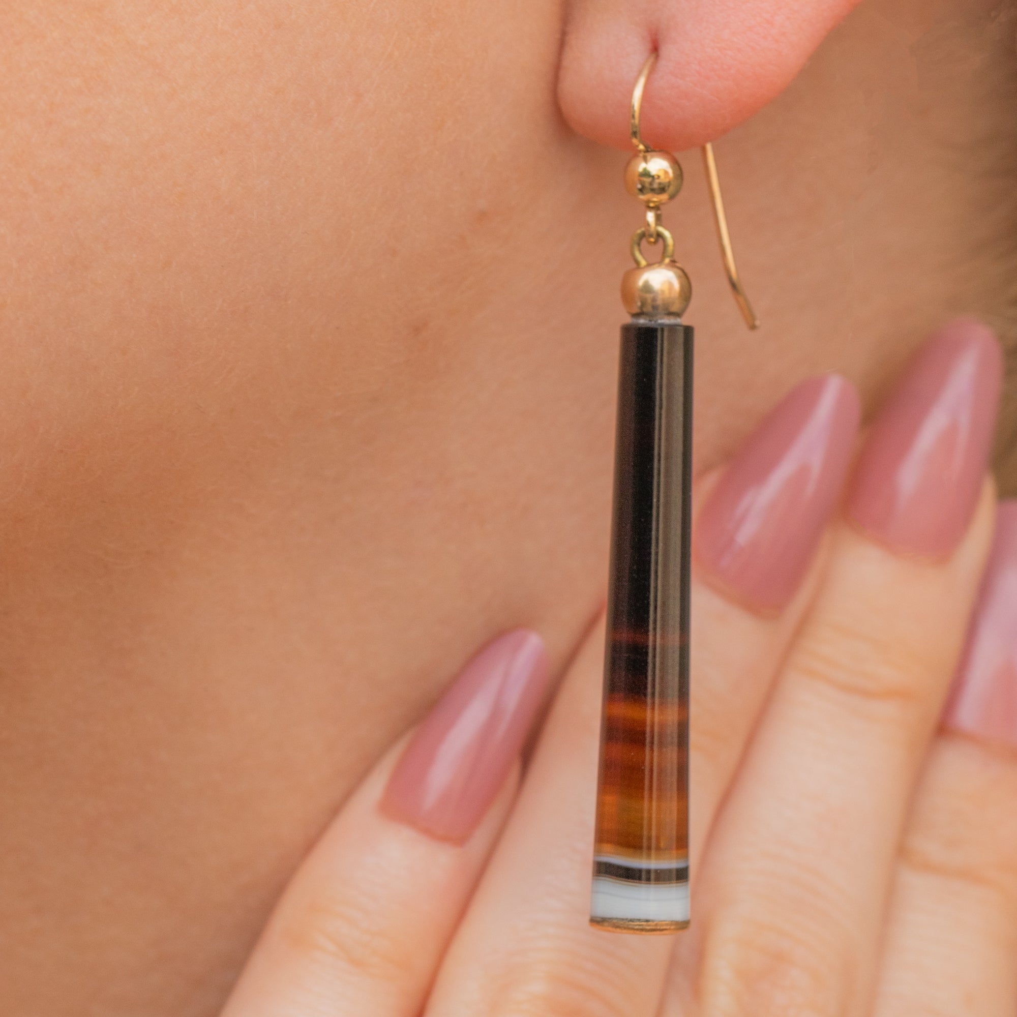 These striking antique 9ct Gold banded Agate drop earrings will add a unique flare to your lobes! This eye-catching pair frames the face beautifully, with their elongated forms bringing refinement and movement to any outfit.