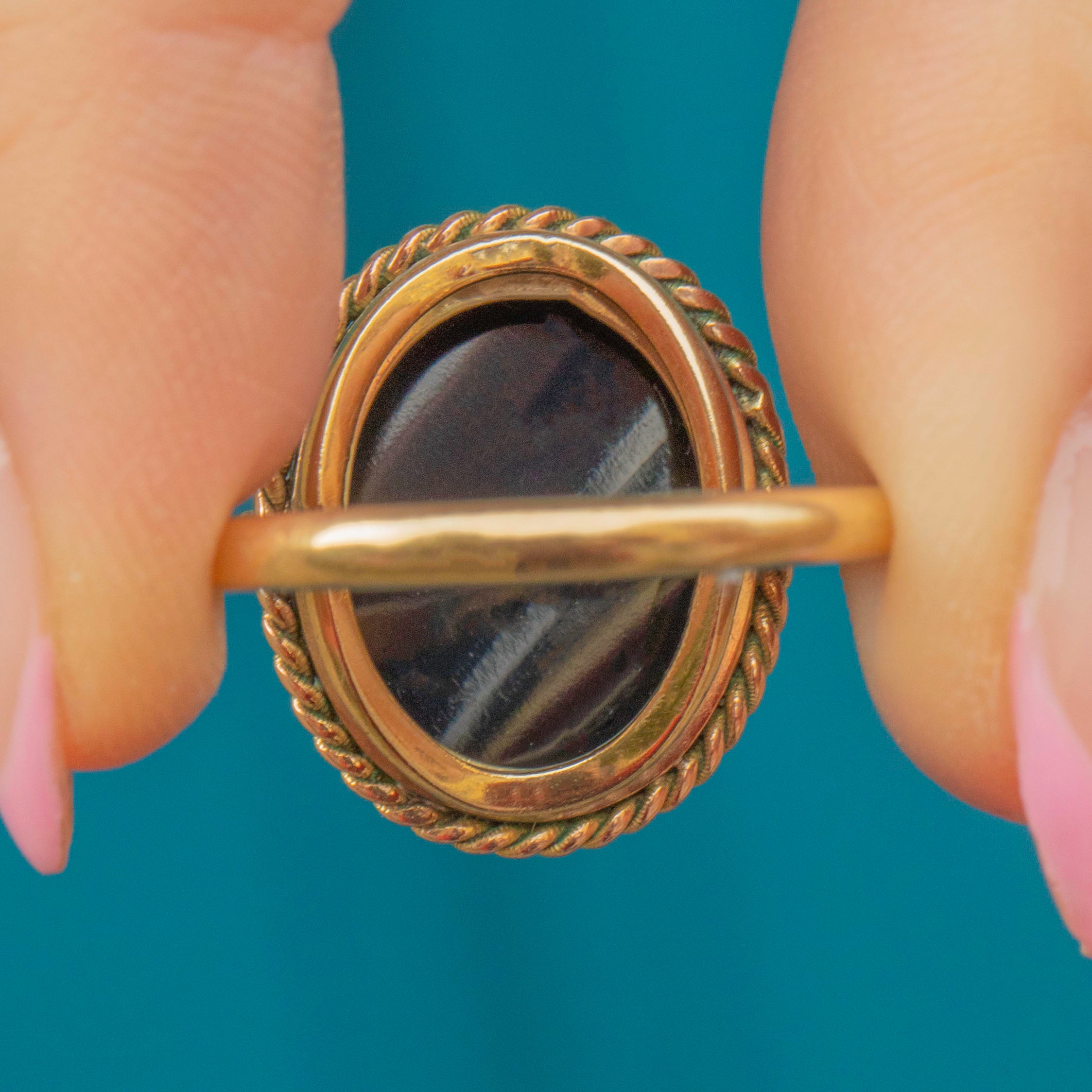 EXCELLENT. This antique 9ct Gold Banded Agate ring is in excellent condition. The ring is a gorgeous yellow Gold and has retained its shape well over the years. The smooth cut of Agate is smooth and securely held within its bezel setting. There is very minimal wear to the piece as a whole, she is a gorgeous piece overall.