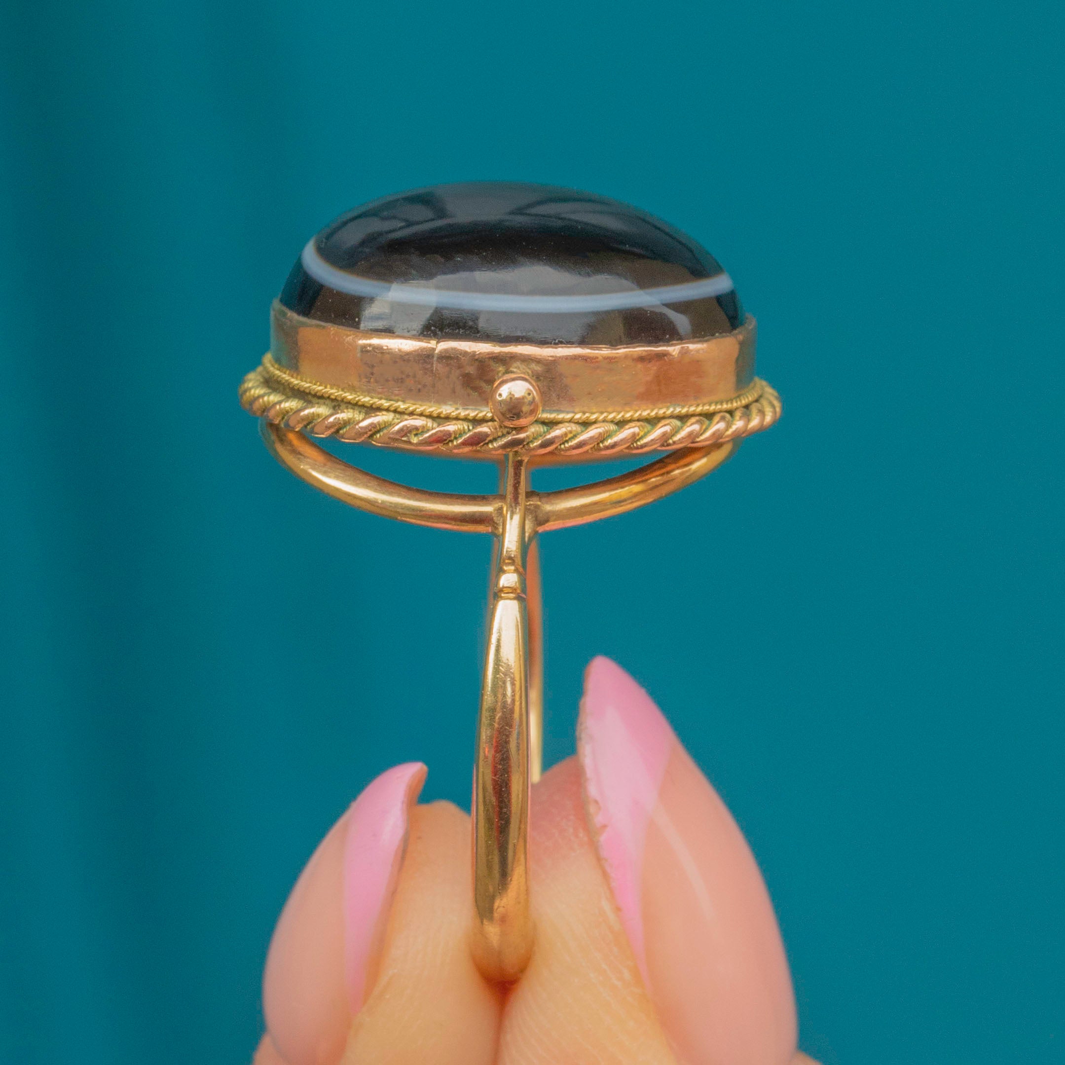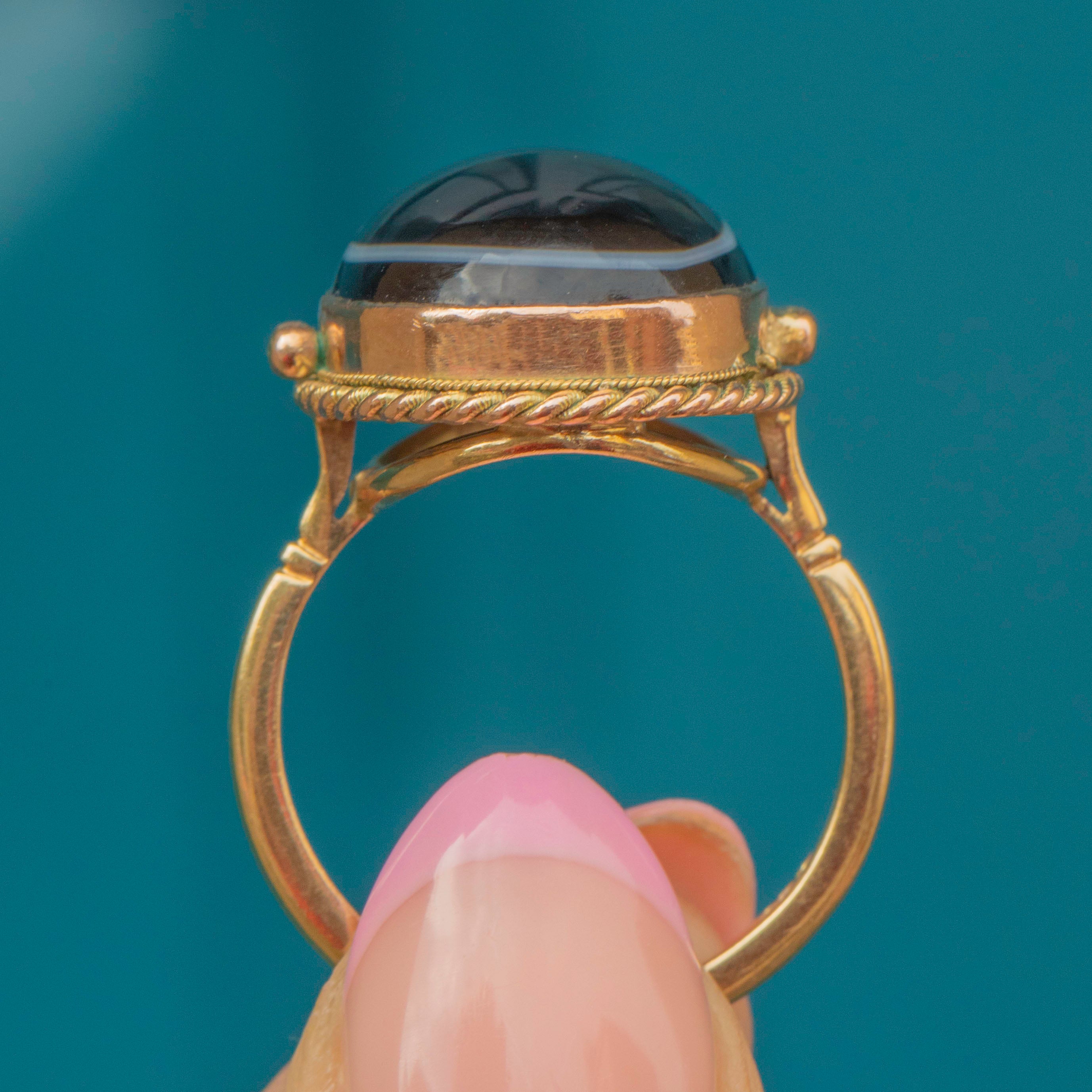 Here we have a striking, large antique 9ct Gold Banded Agate ring! The piece boasts a impressive banded Agate cabochon! Smooth to the touch and with crisp pleasing lines of crisp white and black Agate, resting on a gorgeous buttery 9ct Gold band.