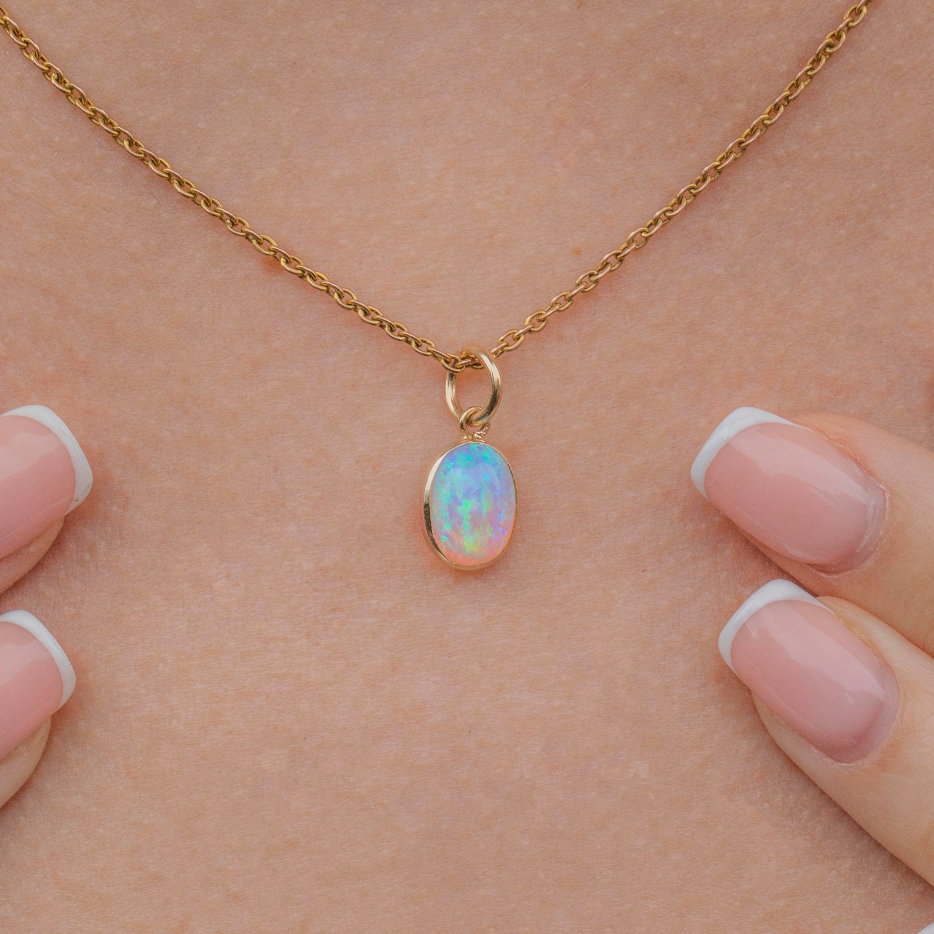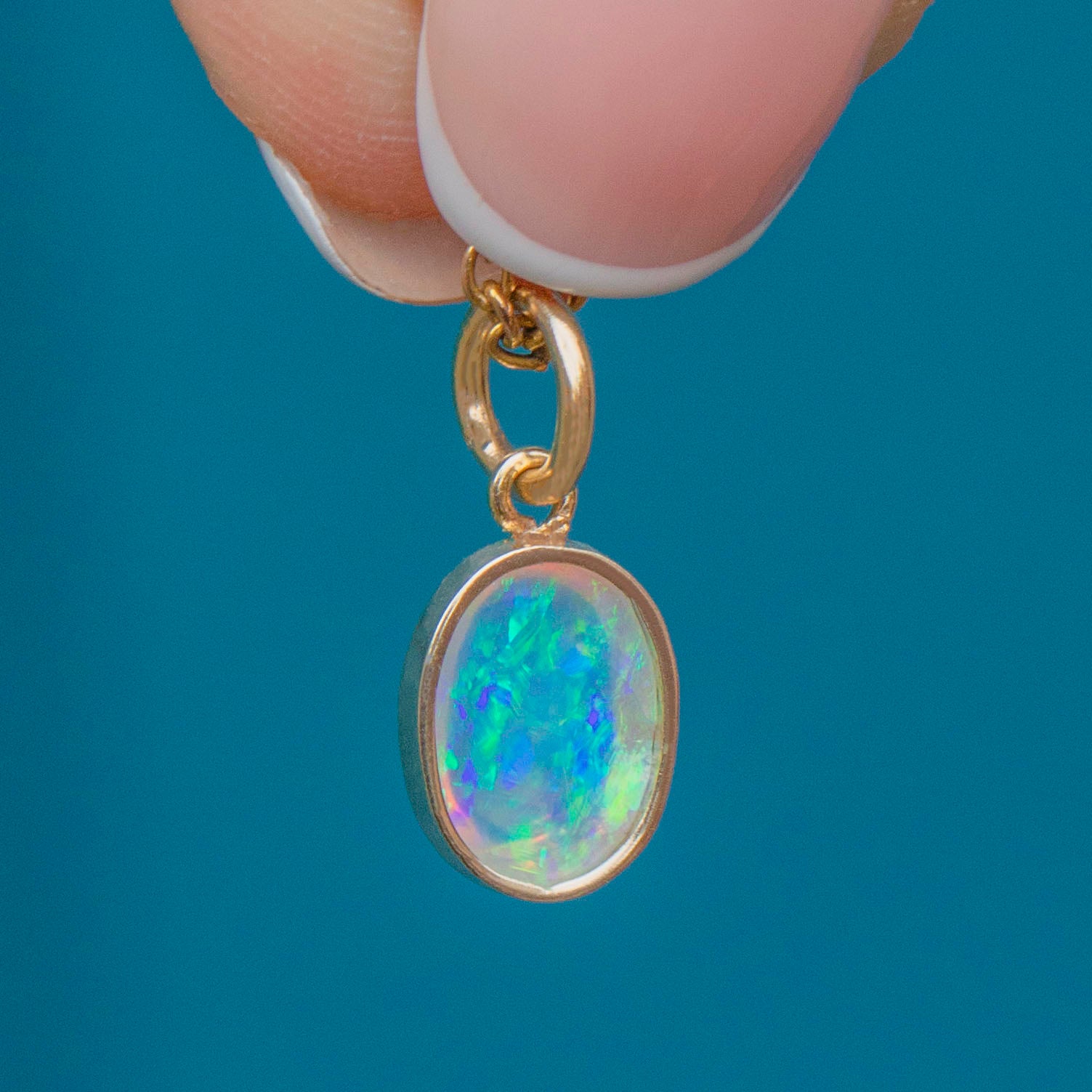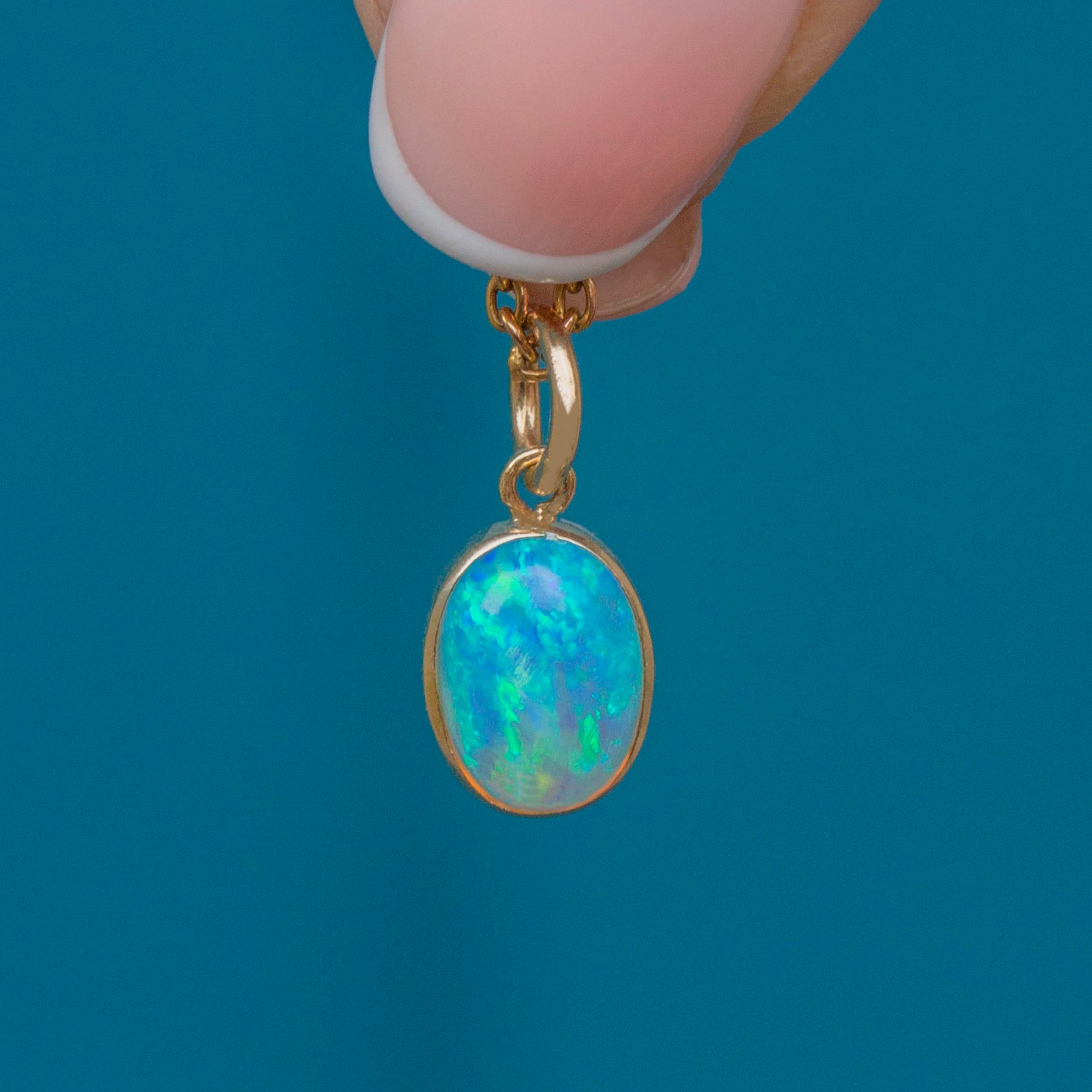 EXCELLENT. This 9ct Gold bezel-set Opal charm is offered in excellent condition. The Opal is smooth and free from any signs of wear, securely held within its bezel setting. The Gold is lustrous and the generously sized jump ring will allow you to suspend this Victorian Opal pendant from a chain of your choice!