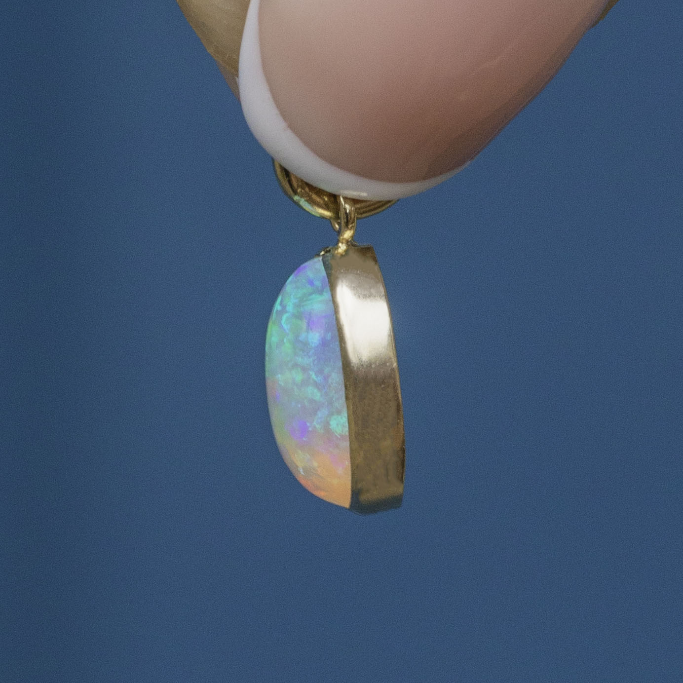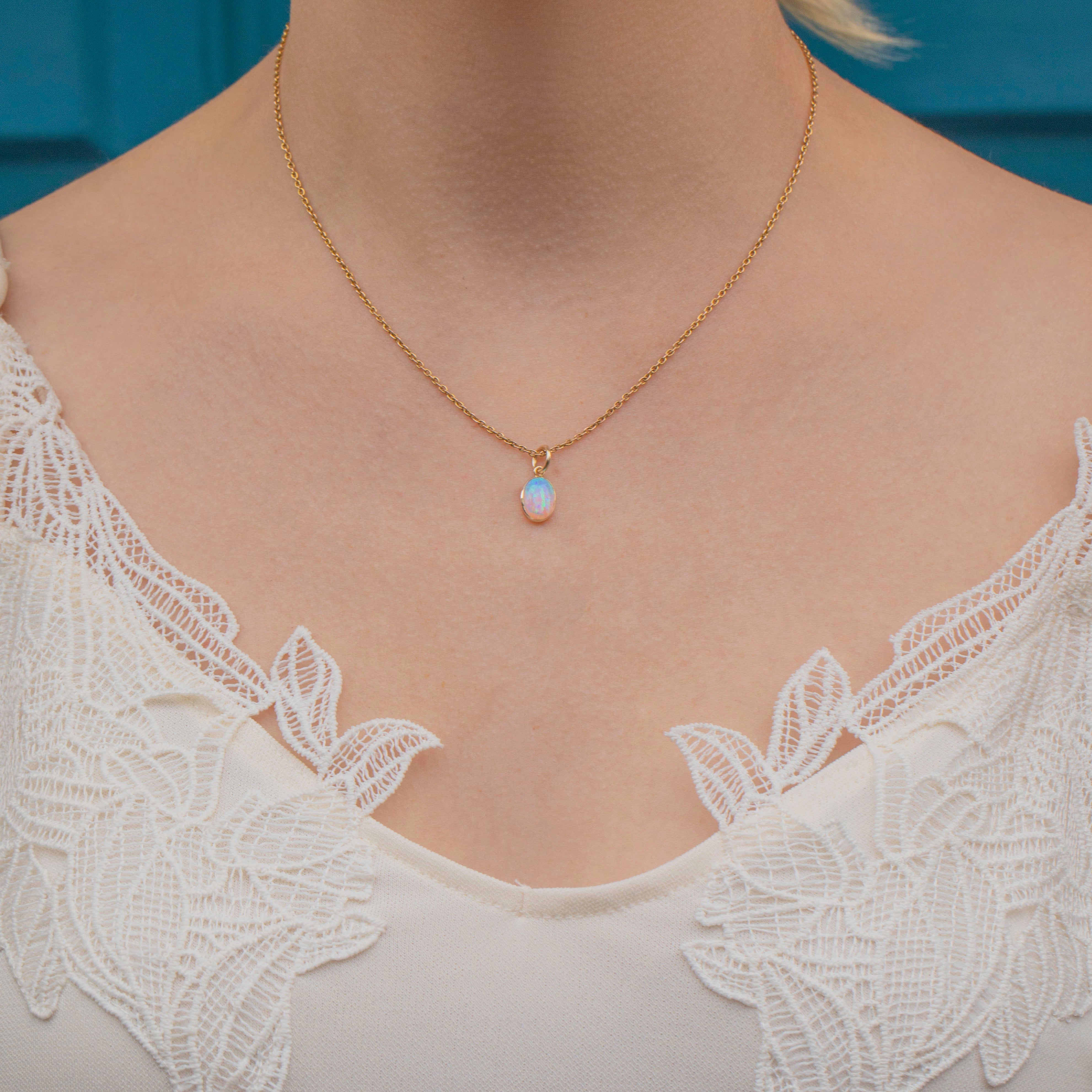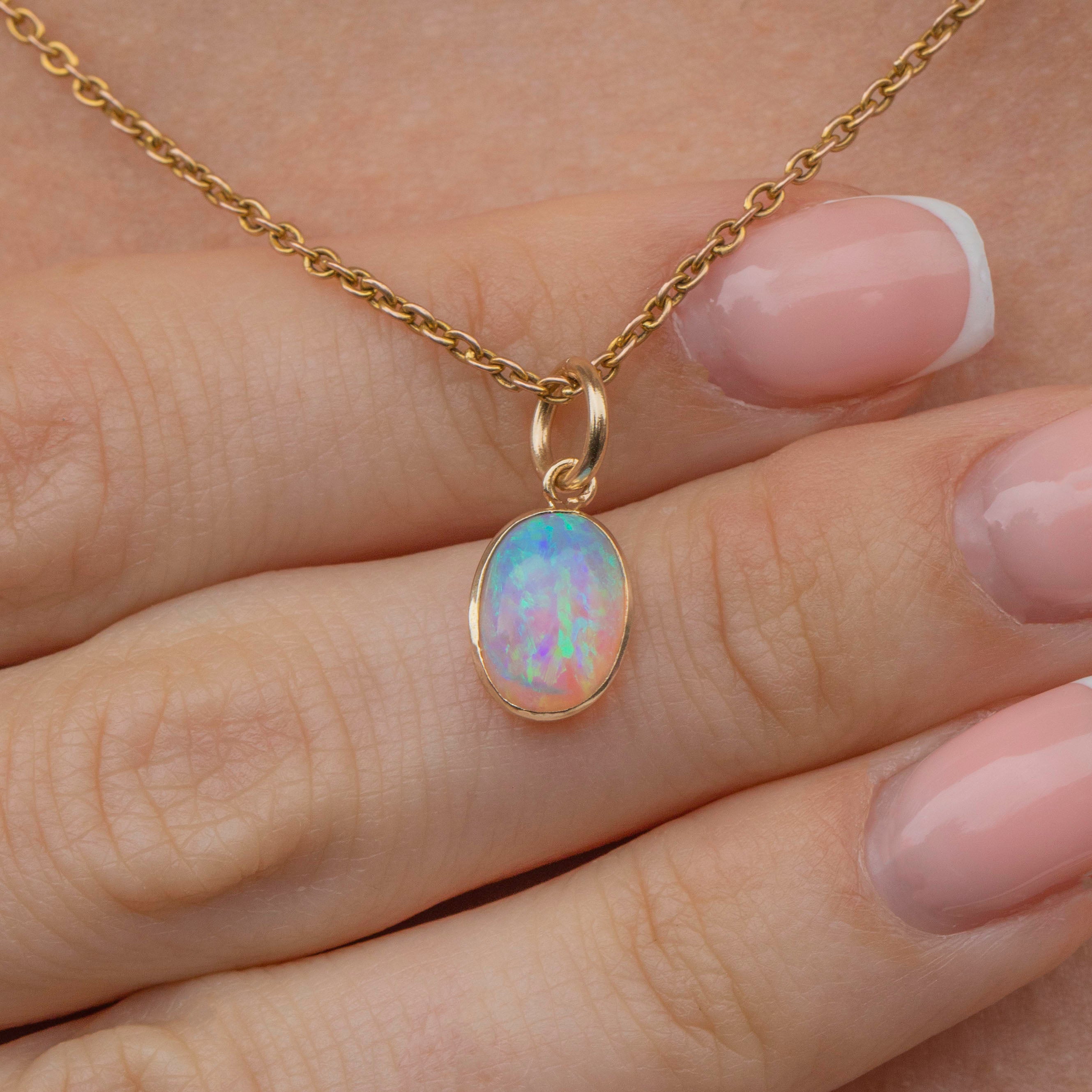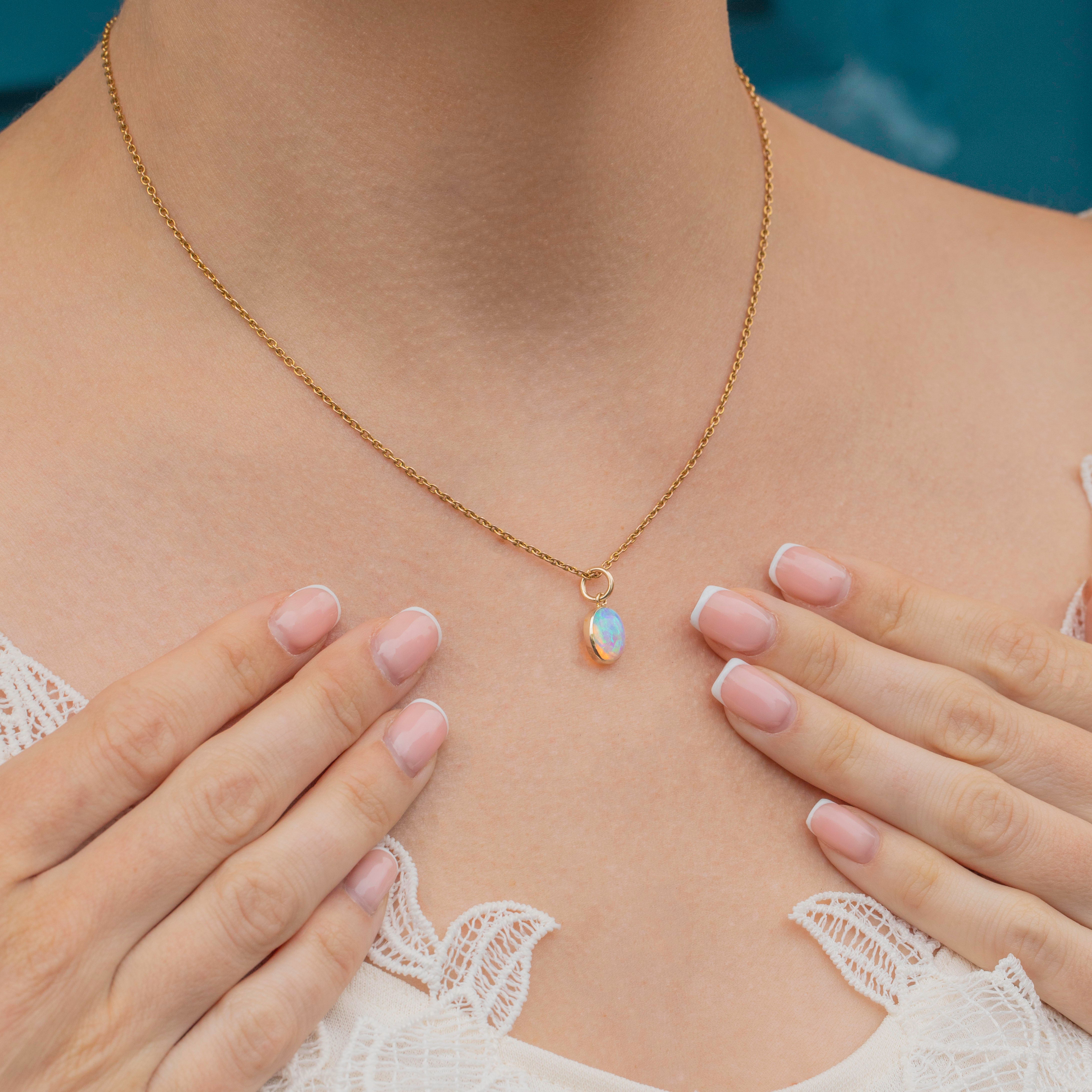 EXCELLENT. This 9ct Gold bezel-set Opal charm is offered in excellent condition. The Opal is smooth and free from any signs of wear, securely held within its bezel setting. The Gold is lustrous and the generously sized jump ring will allow you to suspend this Victorian Opal pendant from a chain of your choice!