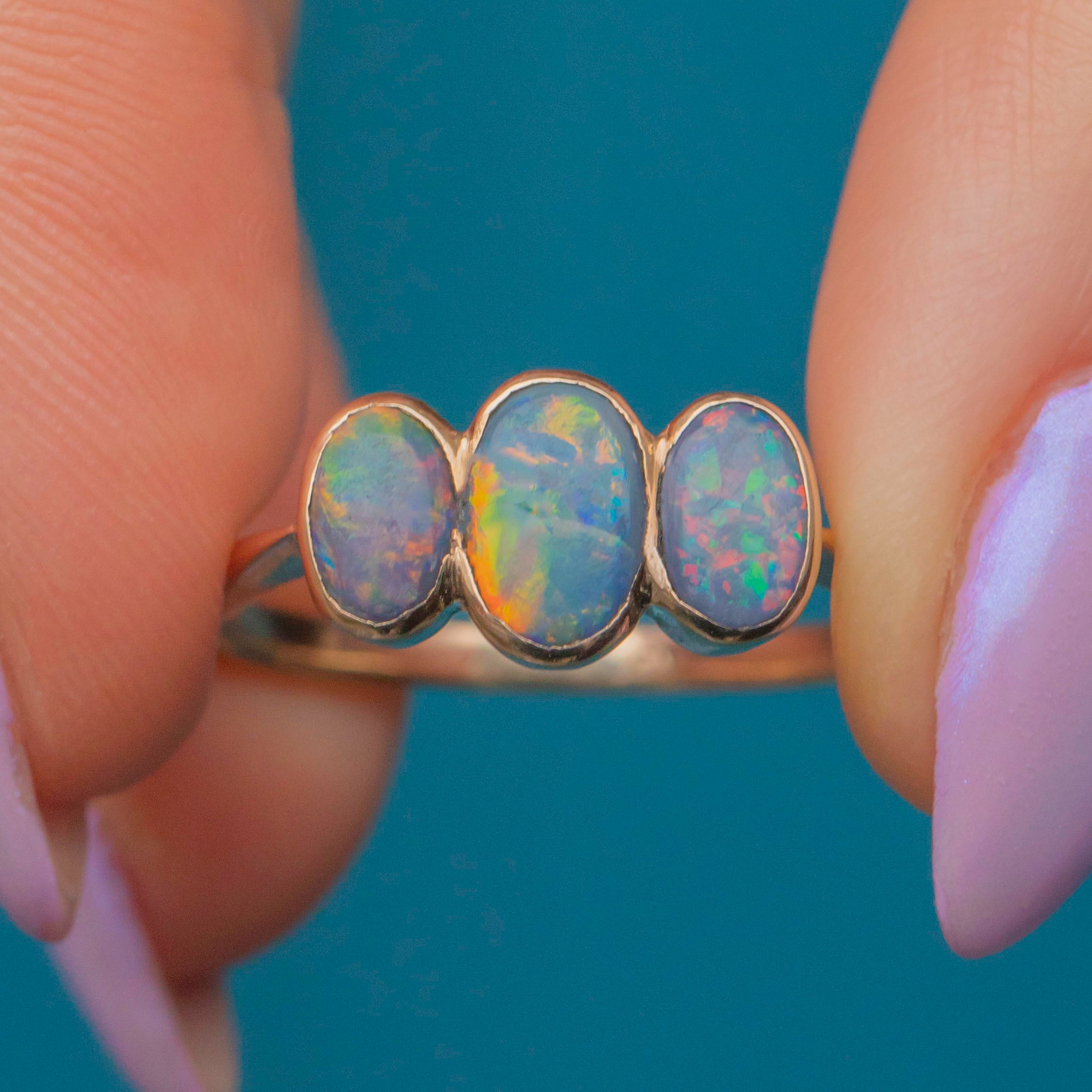 FAIR - GOOD This antique 9ct Gold Black Opal three stone ring is in fair condition, with signs of age and wear consistent with her history. The central Opal has suffered an impact, resulting in a split, while another Opal bears surface scratches, however this does not impact the colour or vibrancy of the stones which still sparkle with vibrant hues. The Gold settings have worn with time but the stones remain securely set. Her band shows evidence of resizing, with a slight variation in the Gold's hue at the join. Despite these imperfections, the ring remains structurally sound, and the Opals still display their mesmerising play of colour, making it a charming and wearable antique piece!