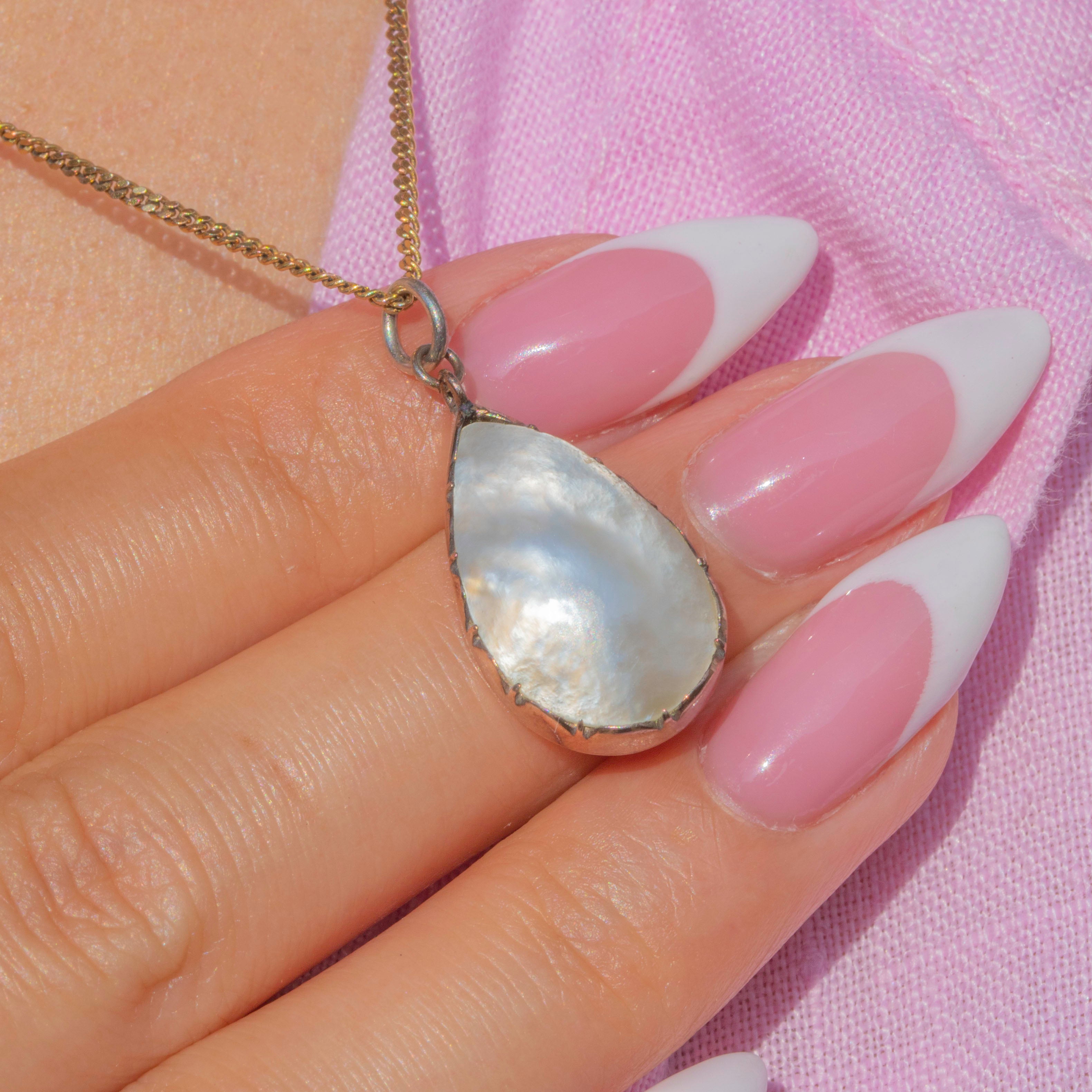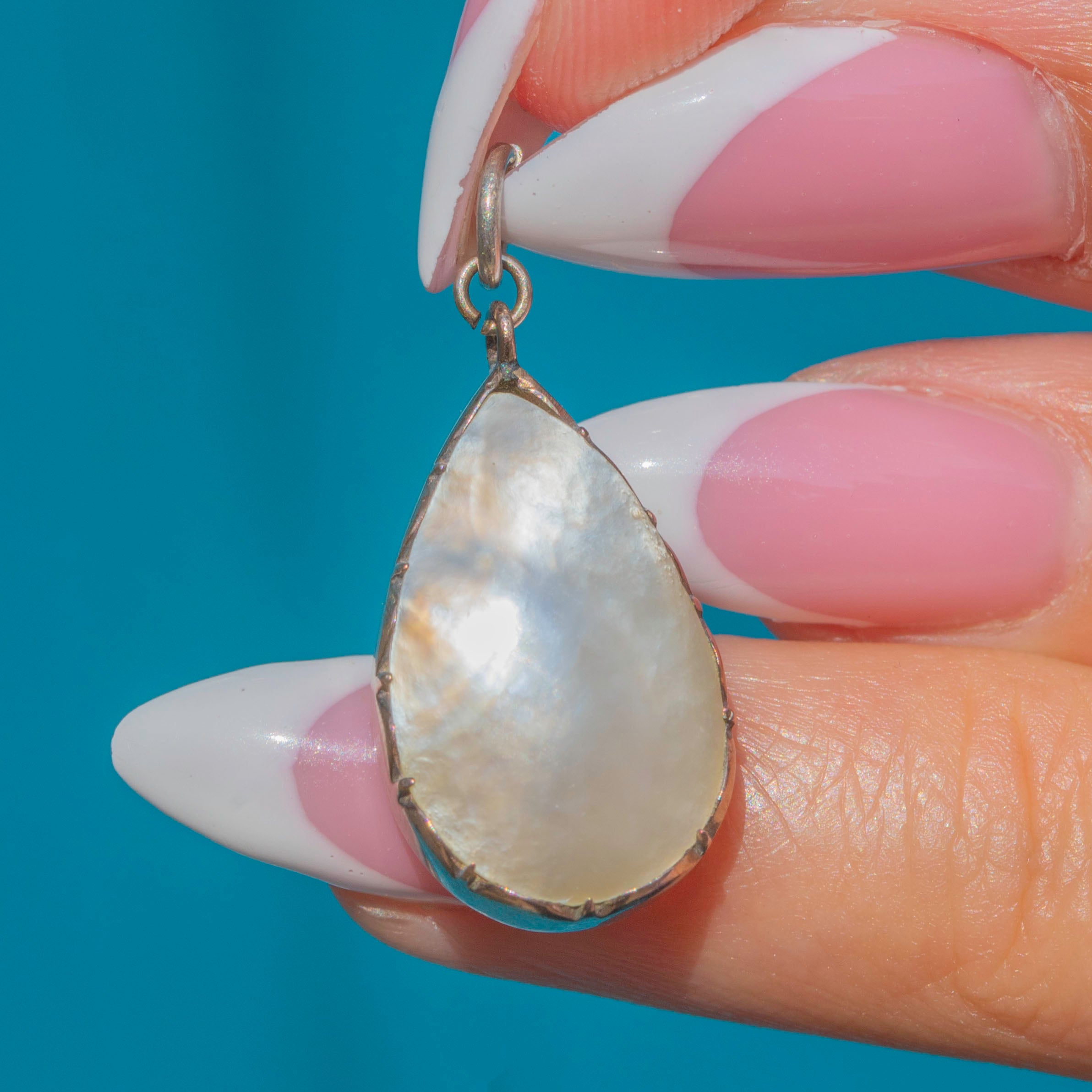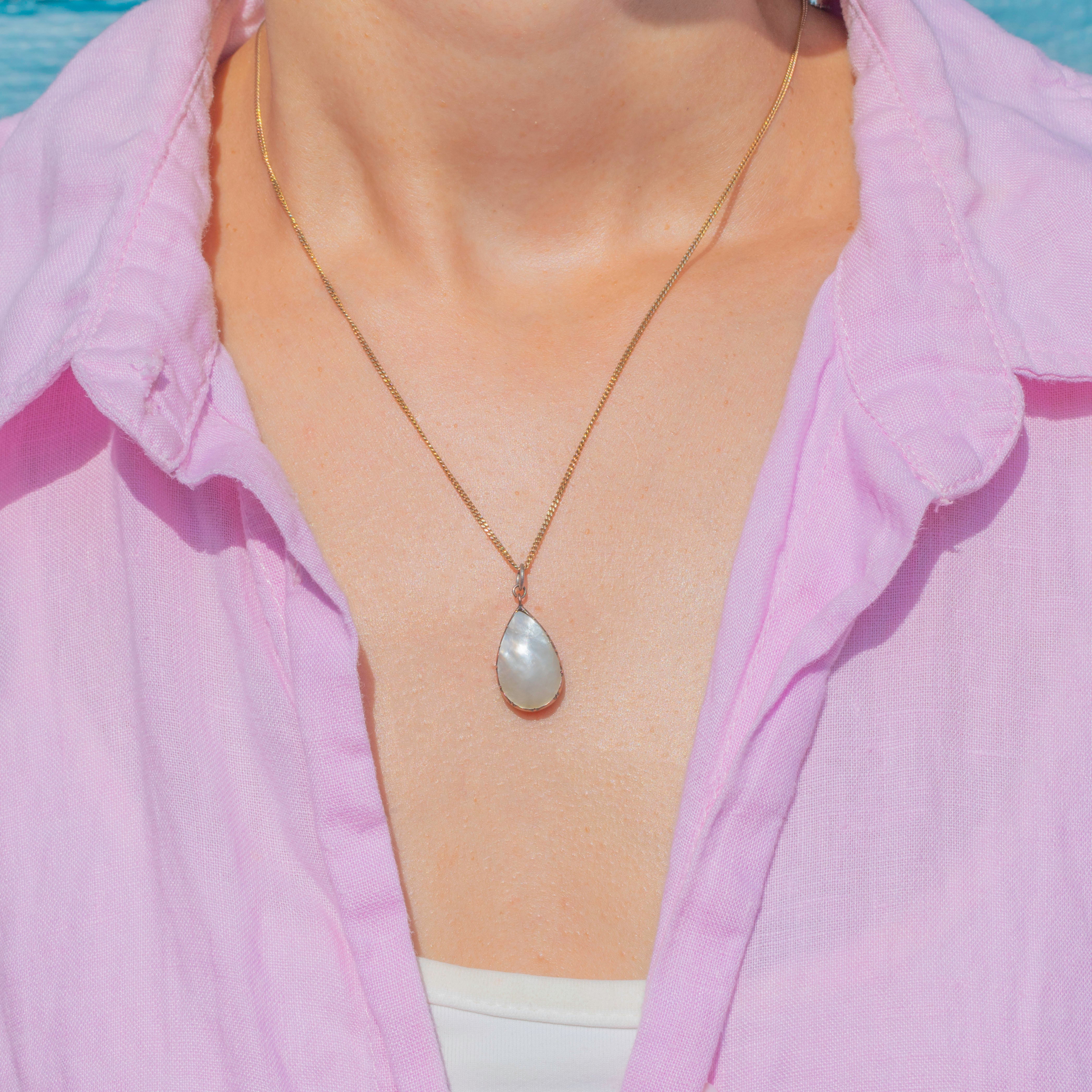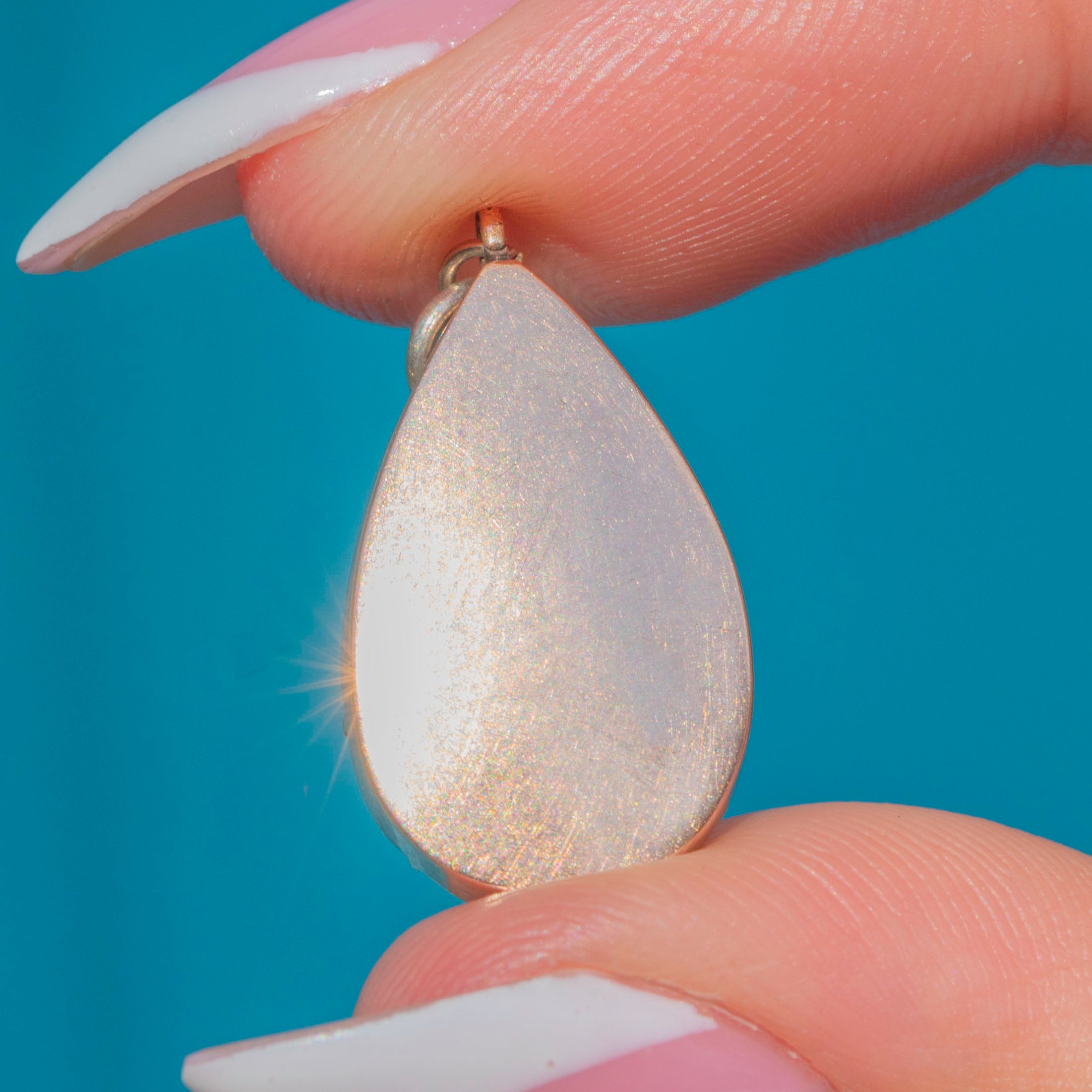 With a striking iridescence, this charming Georgian pendant suspends a whimsical pear-shaped blister Pearl which reflects the light beautifully from its lustrous, iridescent surface.
