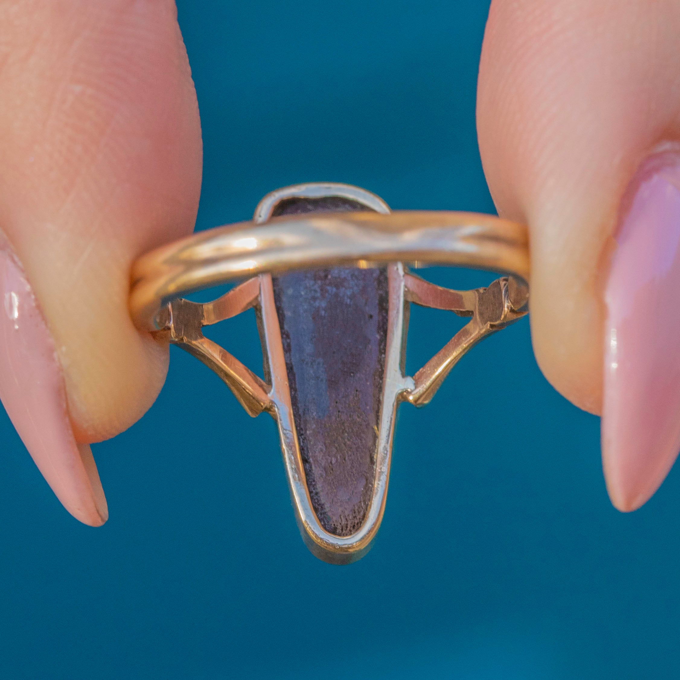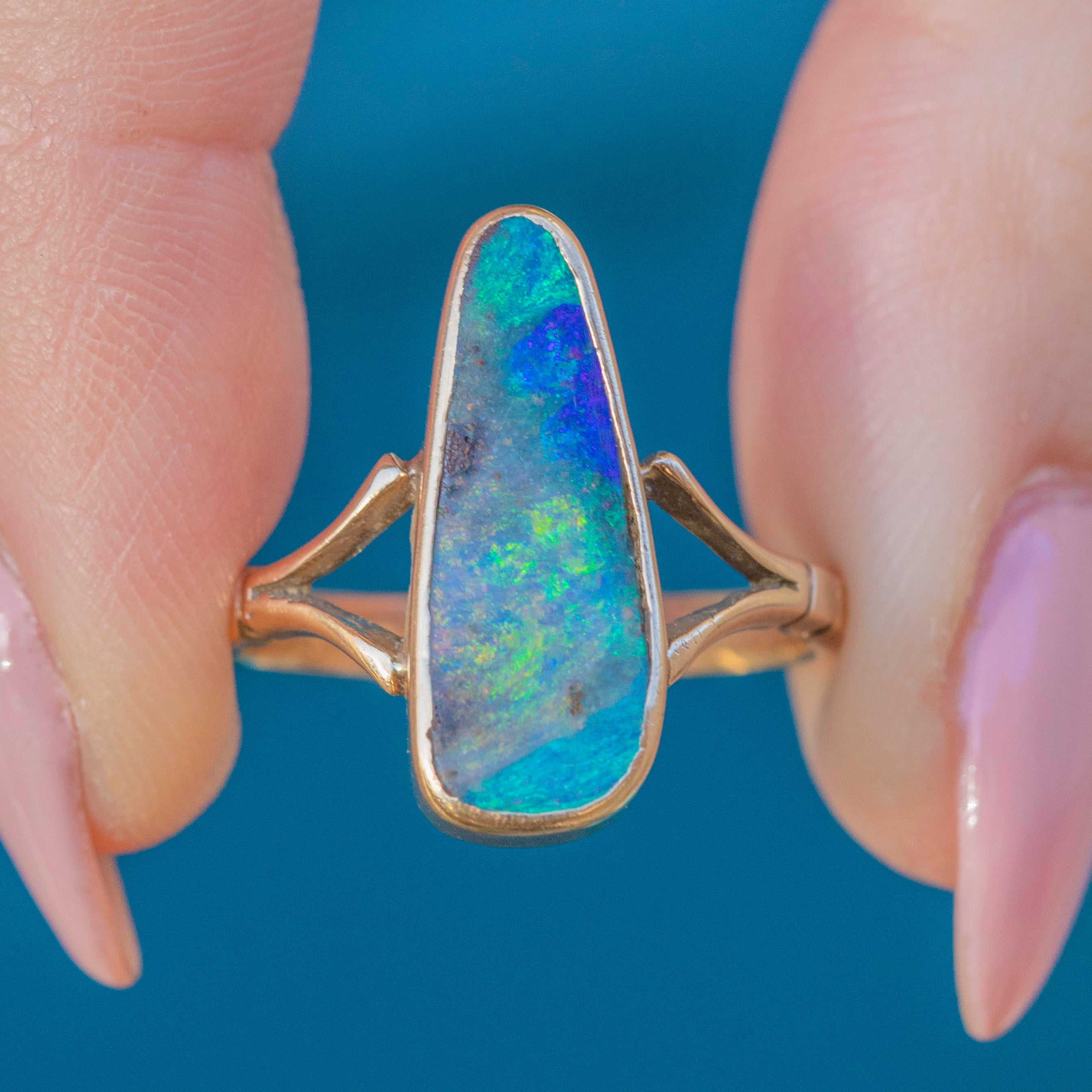 This antique 9ct Gold boulder Opal ring is absolutely divine! Homing an exceptional Opal, known as a gem boulder Opal, mined in the depths of Australia, this Victorian ring is a unique treasure.