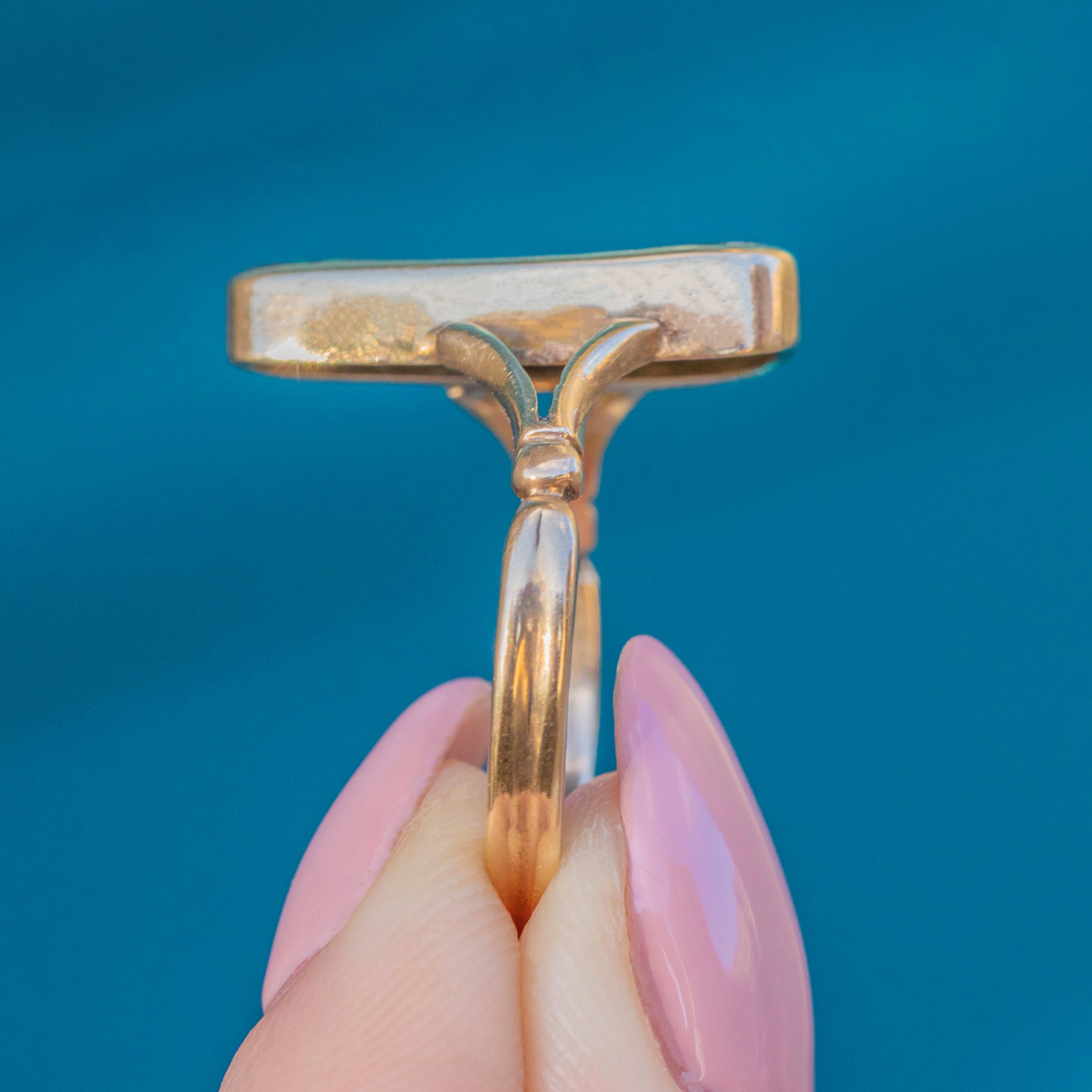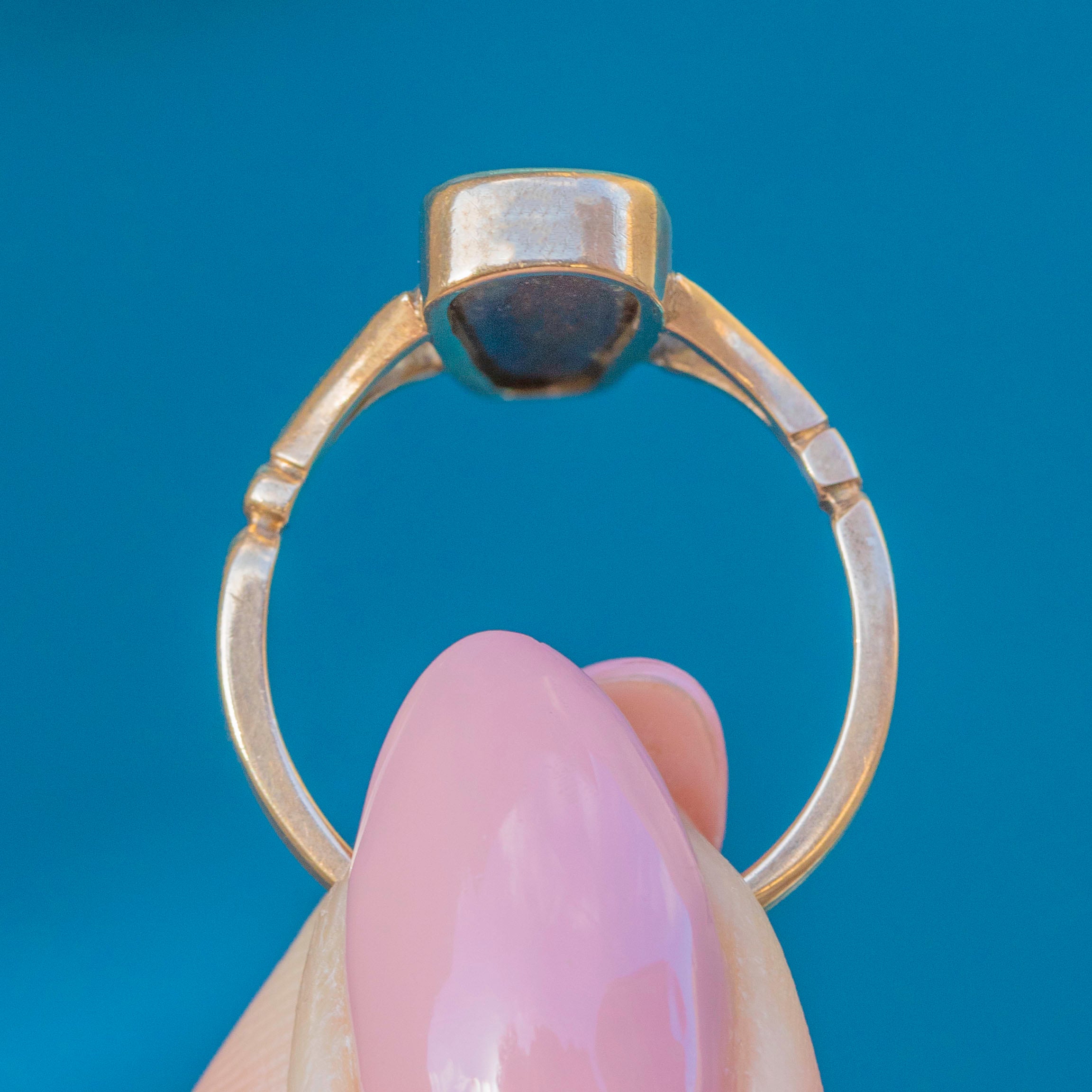 Flaunting a darker colour palette with a charcoal core, her Opal is blessed with shimmers of electric blue and lime greens. We love the organic design of this Victorian ring, with her buttery 18ct Gold bezel perfectly following the form of her Opal, embracing her natural beauty. The chunky design of this antique Gold ring will bring the drama you have been looking for to your ring stack!