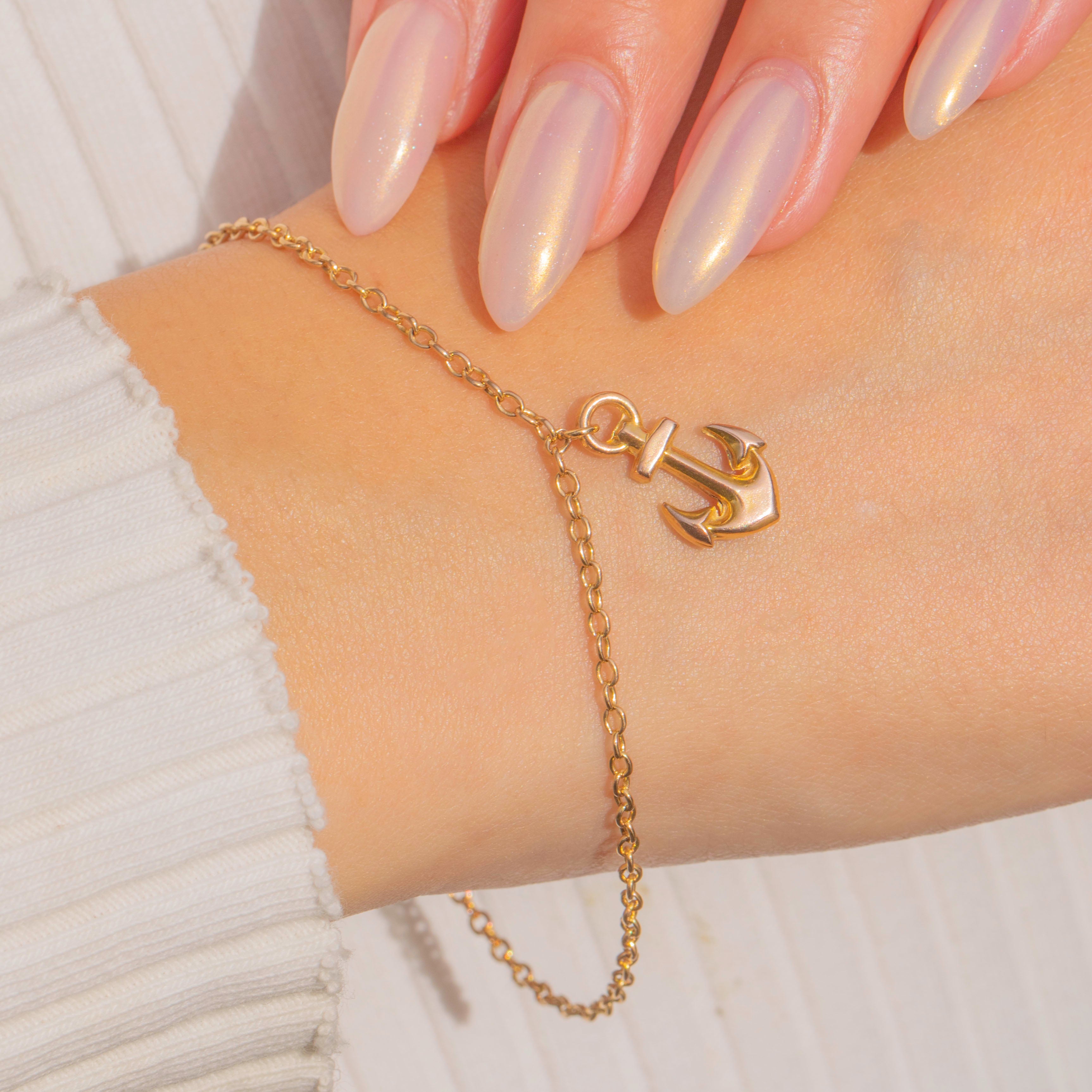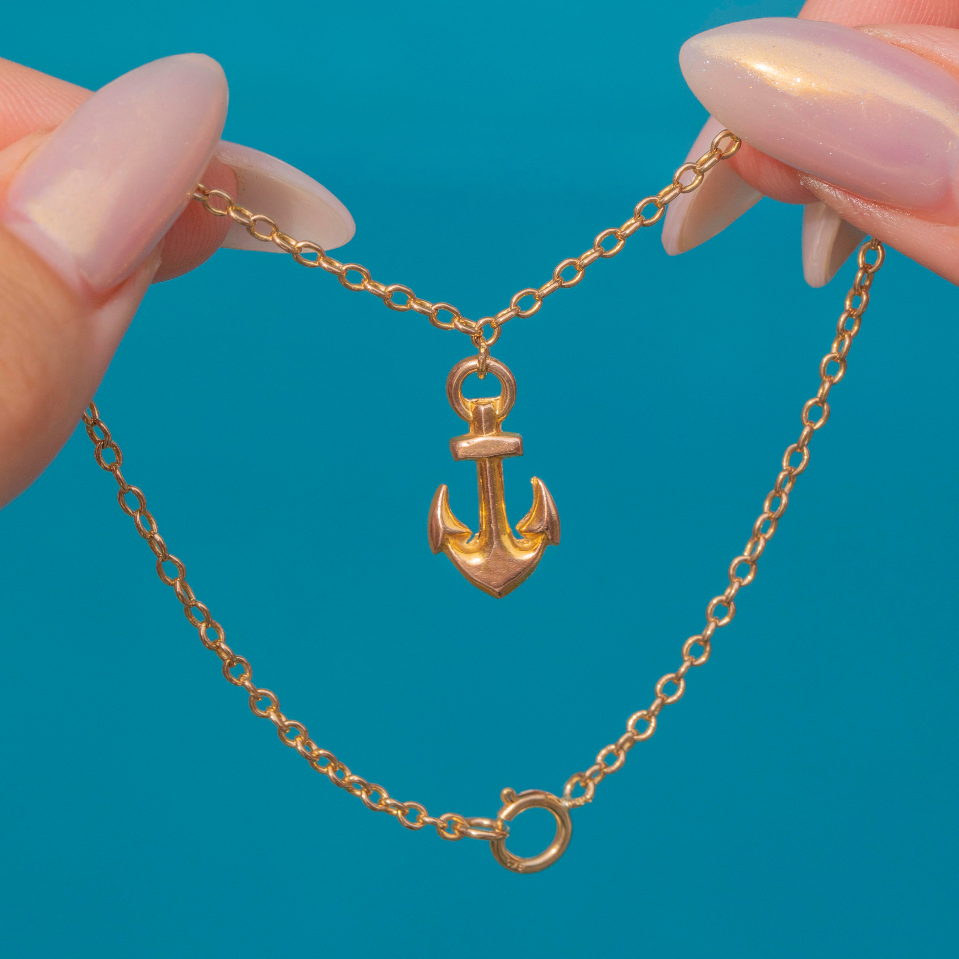 A delightful Antique 9ct Gold bracelet featuring a symbolic anchor charm. The anchor, a historic emblem of hope and steadfastness, hangs gracefully from a fine Gold chain, creating a piece that is both elegant and meaningful. Its lightweight design makes it perfect for daily wear while still holding plenty of antique charm.