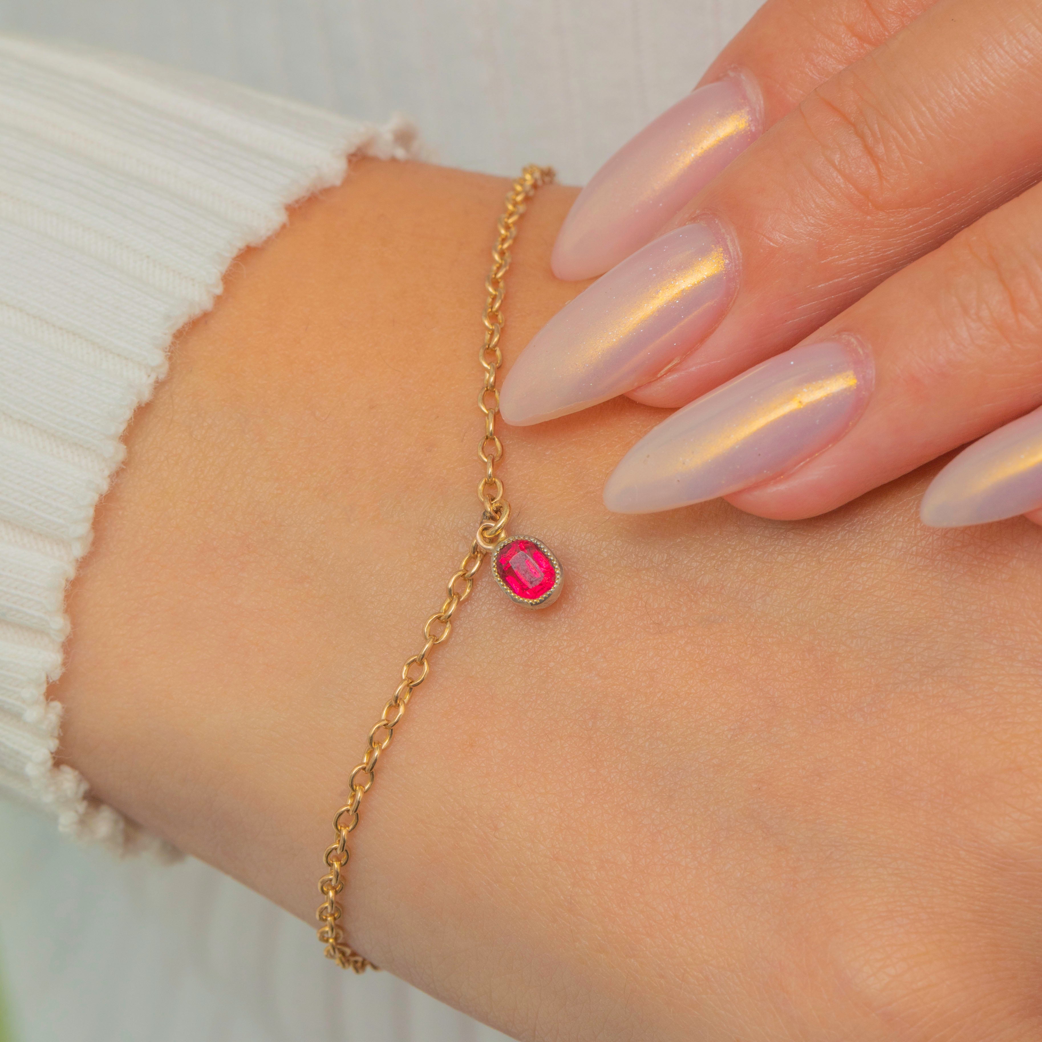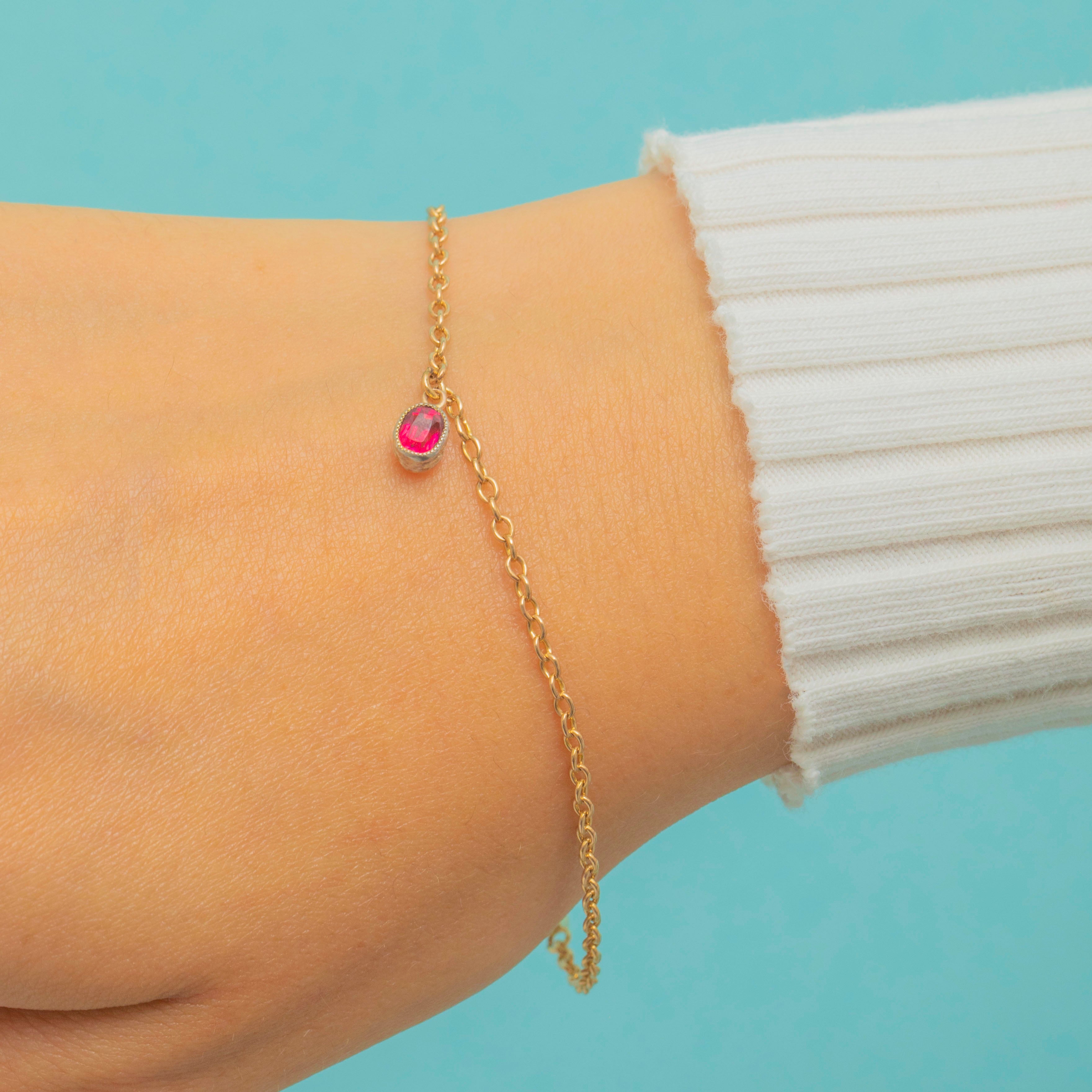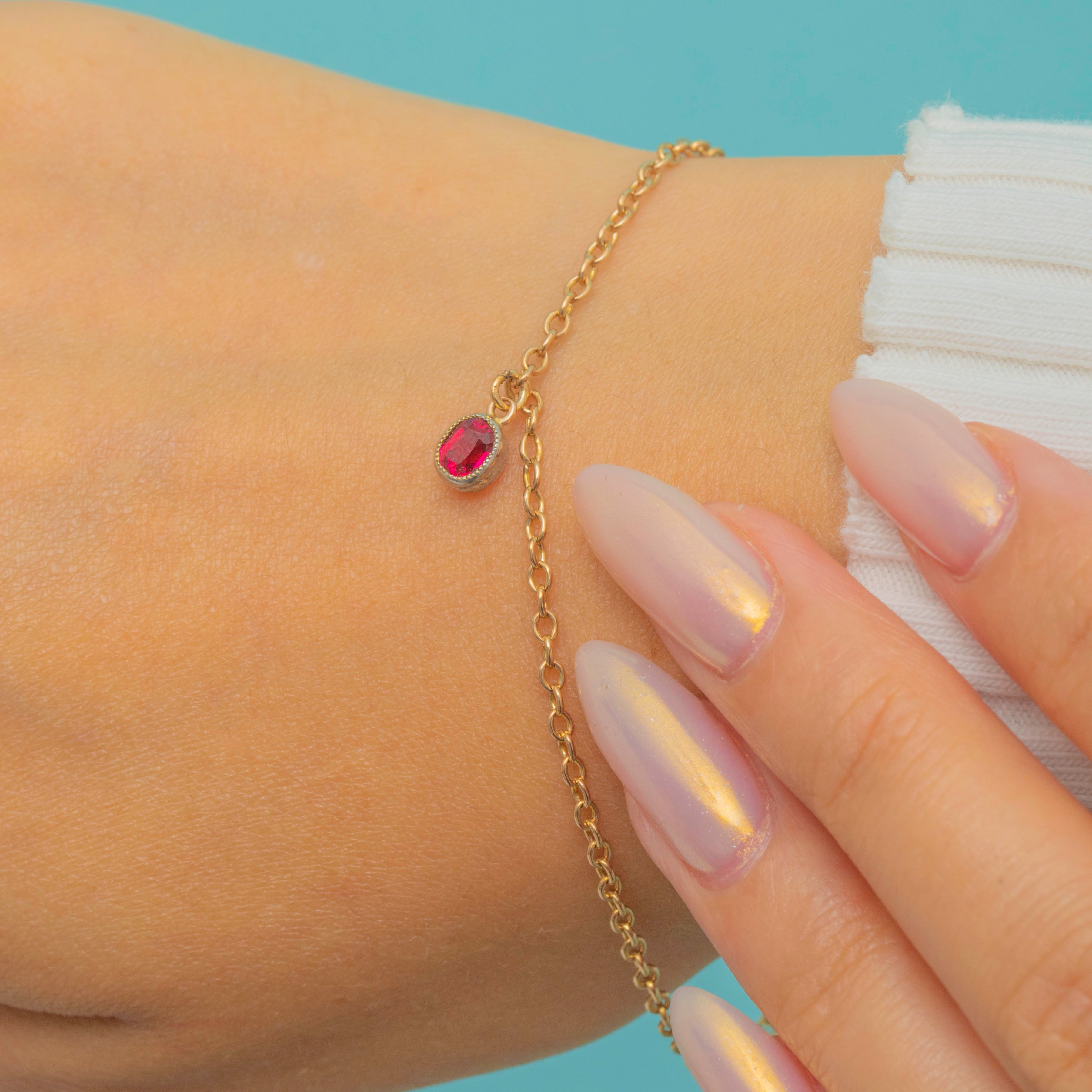 This antique 9ct Gold bracelet is a refined and elegant piece, finished with a bright red early 1900's flame-fusion synthetic Ruby charm in a smooth bezel setting. The Ruby offering a vivid splash of colour against the warm Gold links.