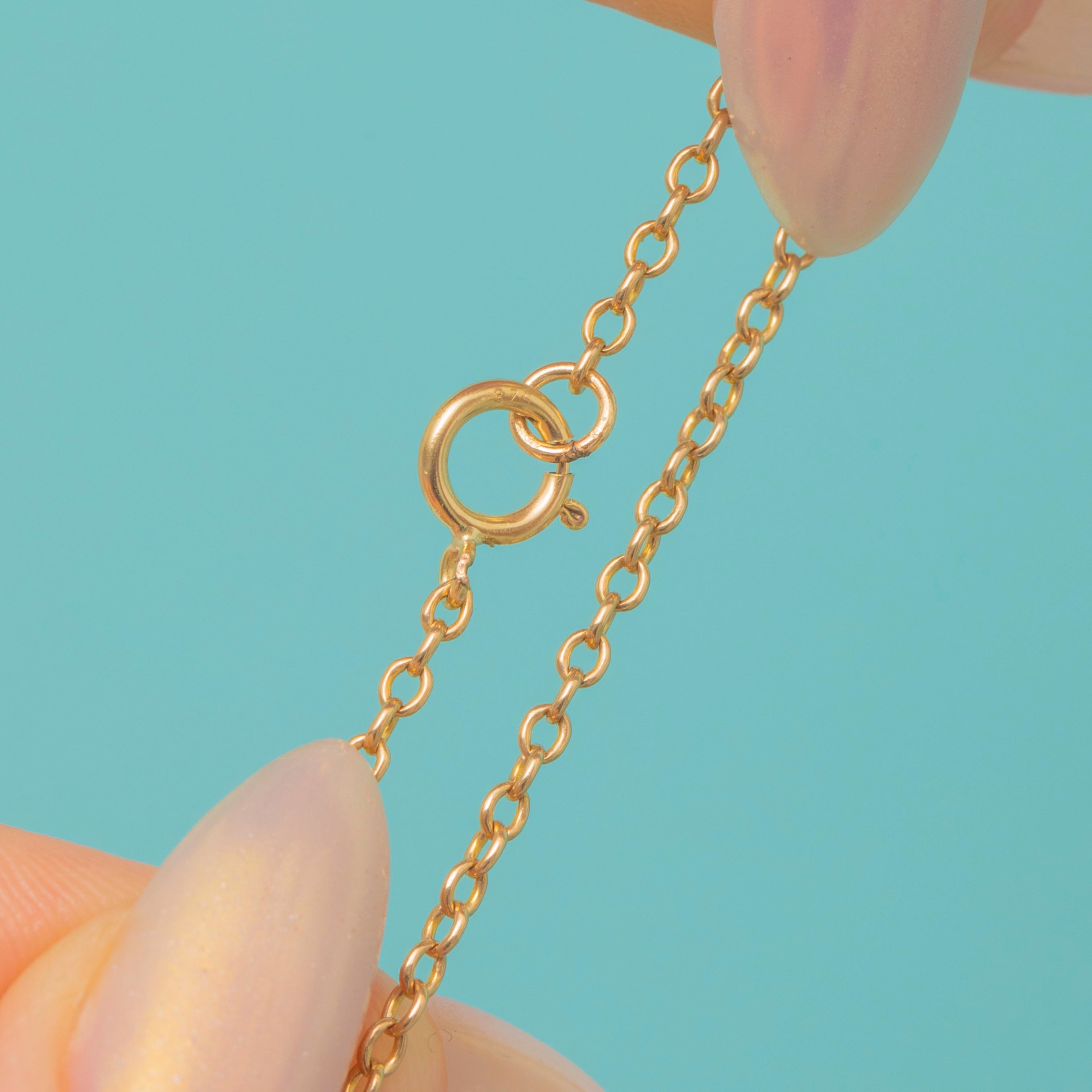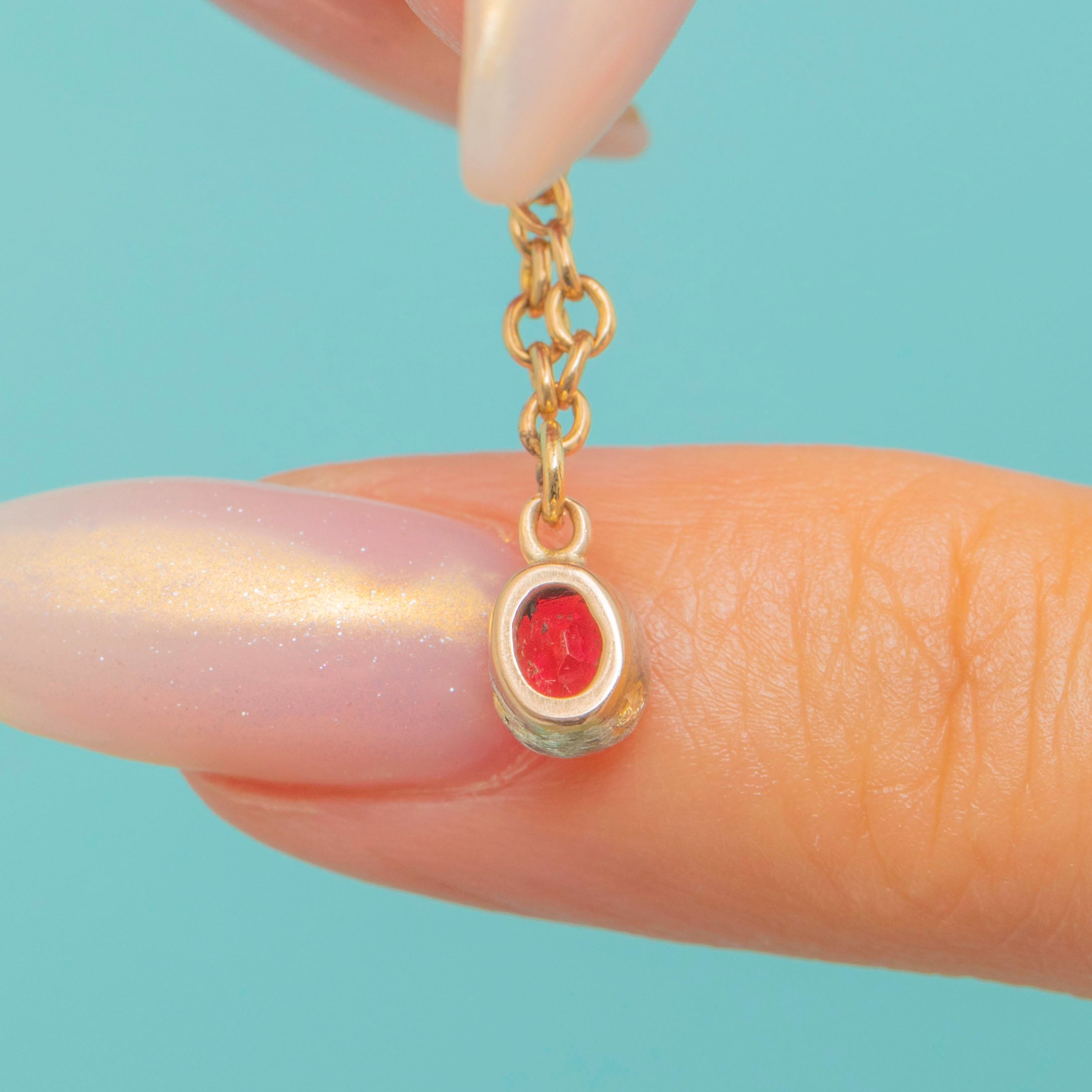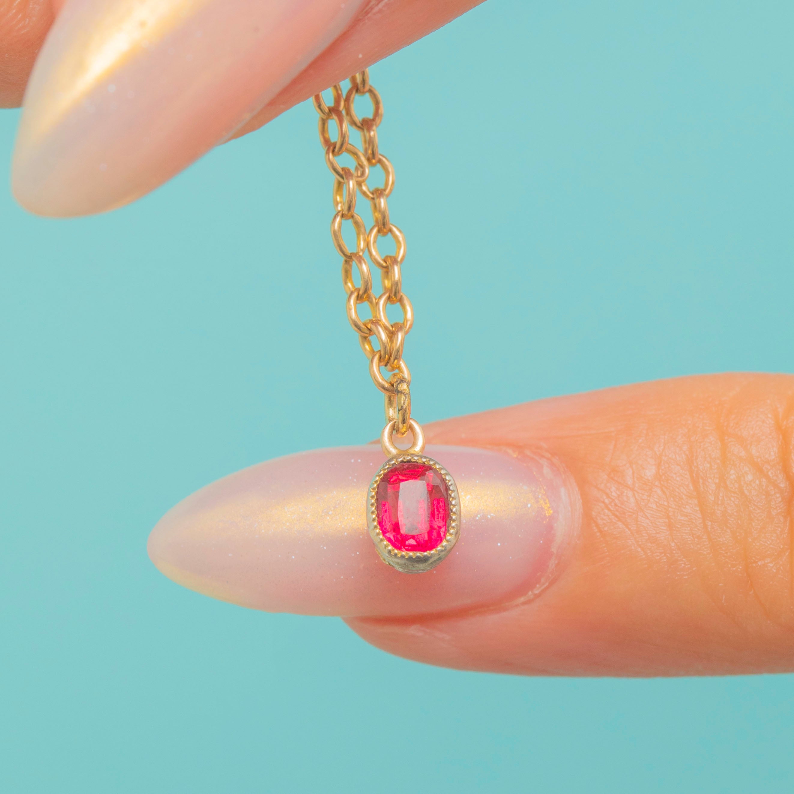 This antique 9ct Gold bracelet is a refined and elegant piece, finished with a bright red early 1900's flame-fusion synthetic Ruby charm in a smooth bezel setting. The Ruby offering a vivid splash of colour against the warm Gold links.