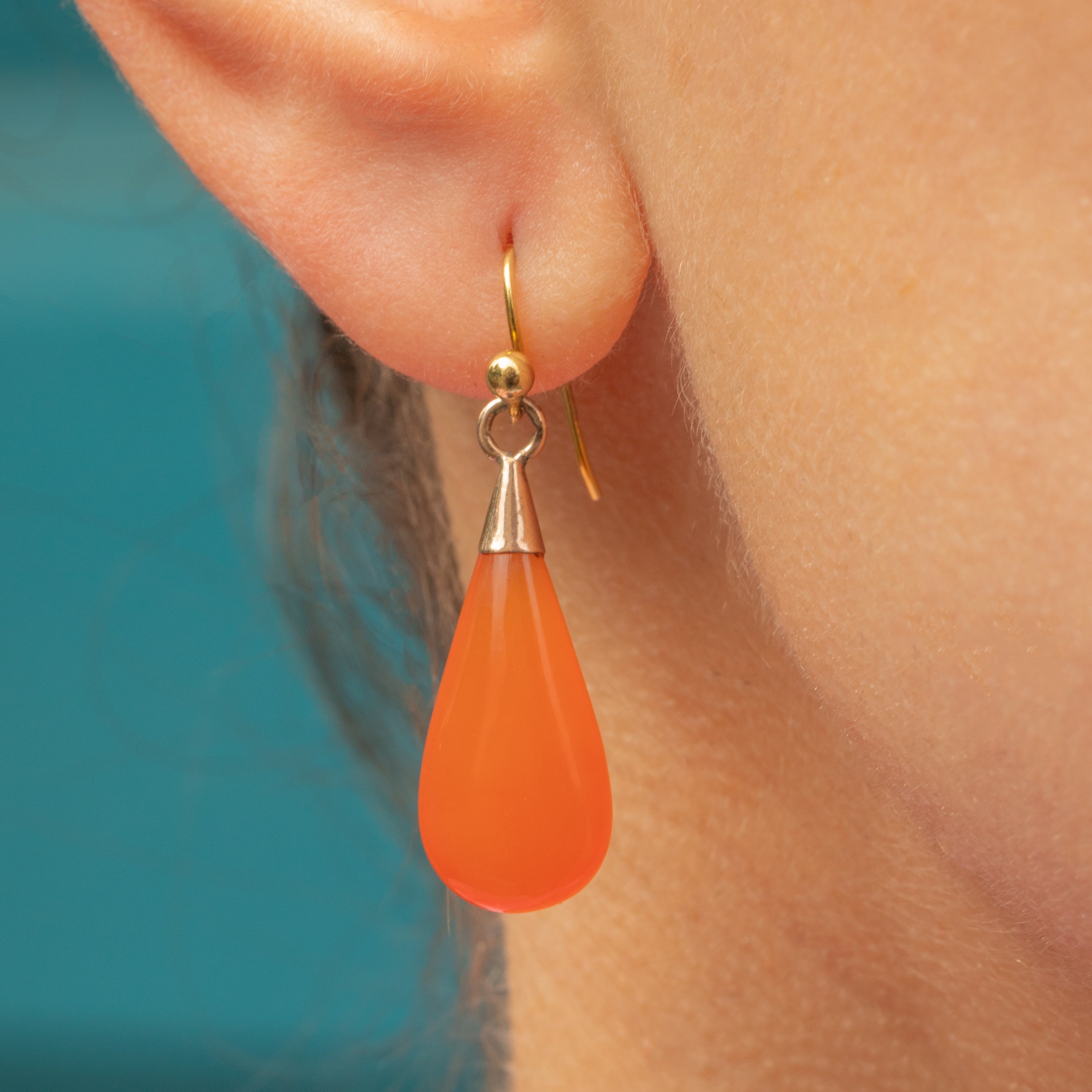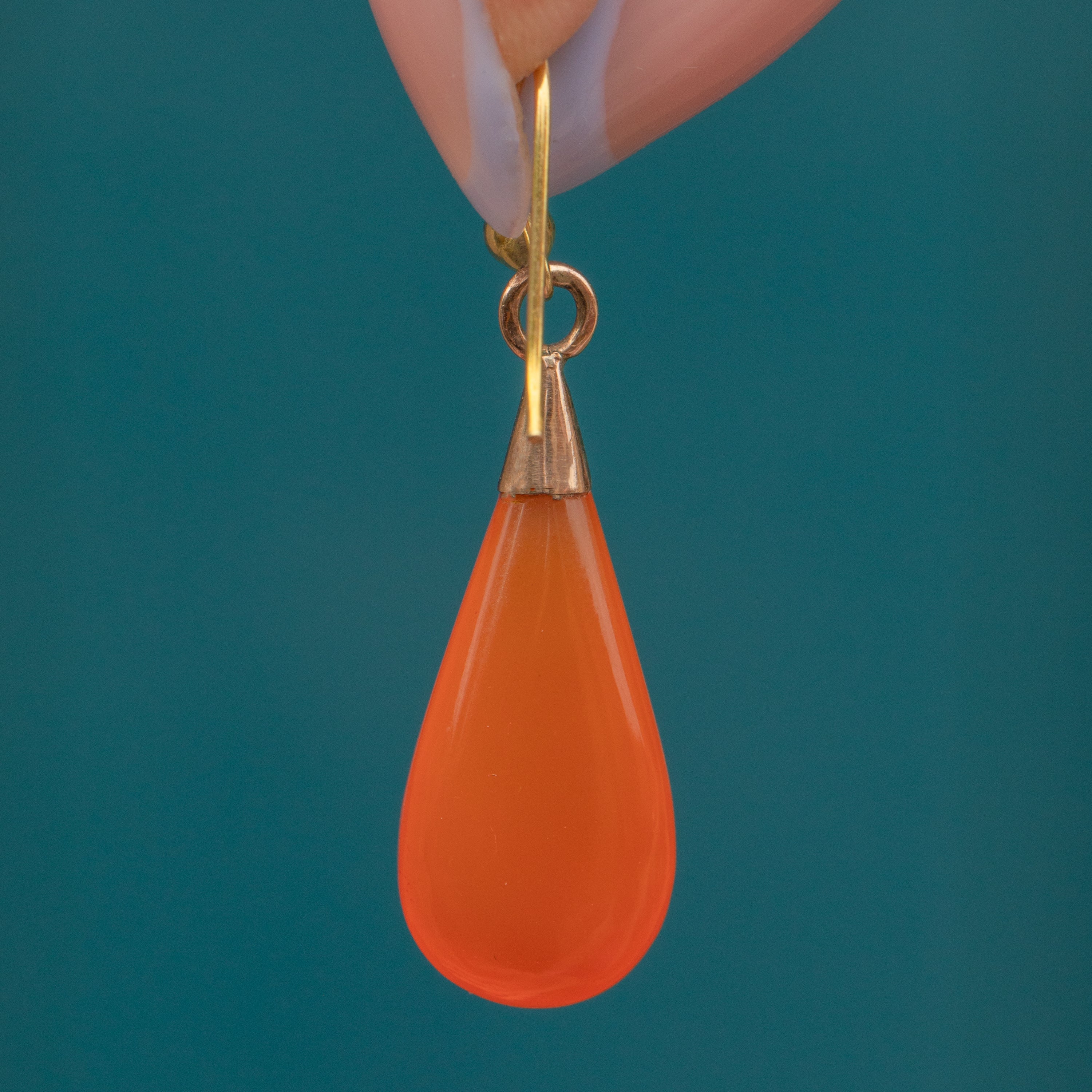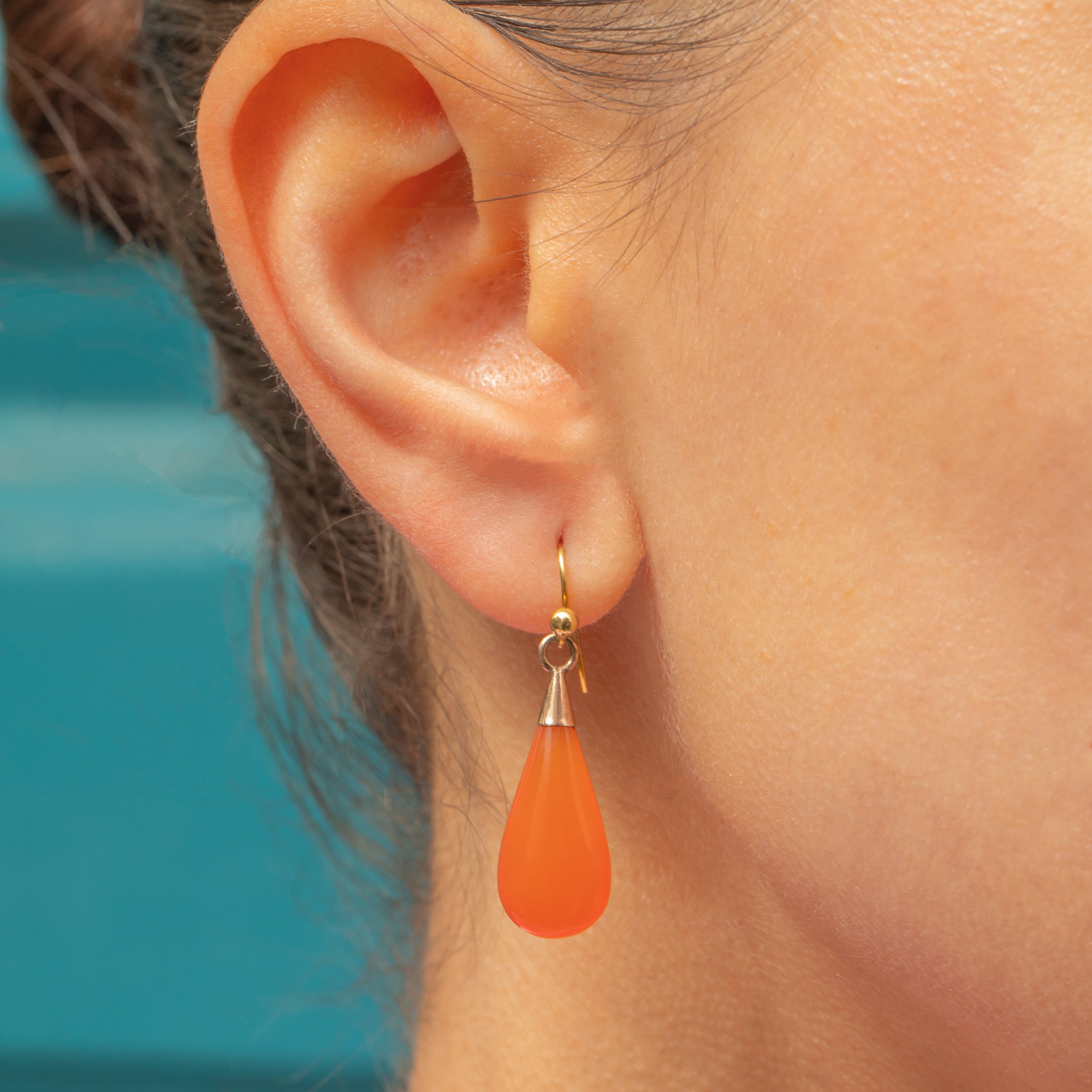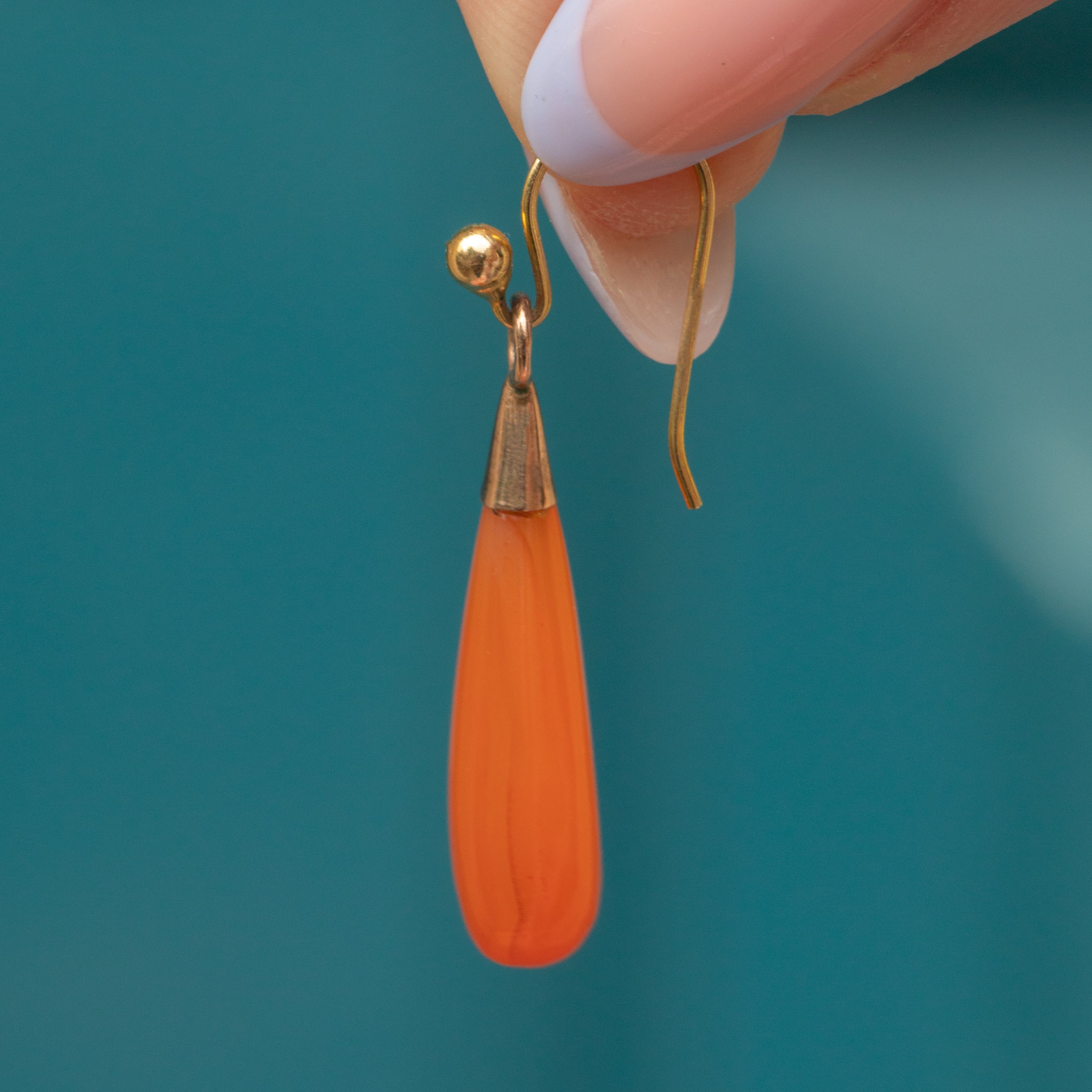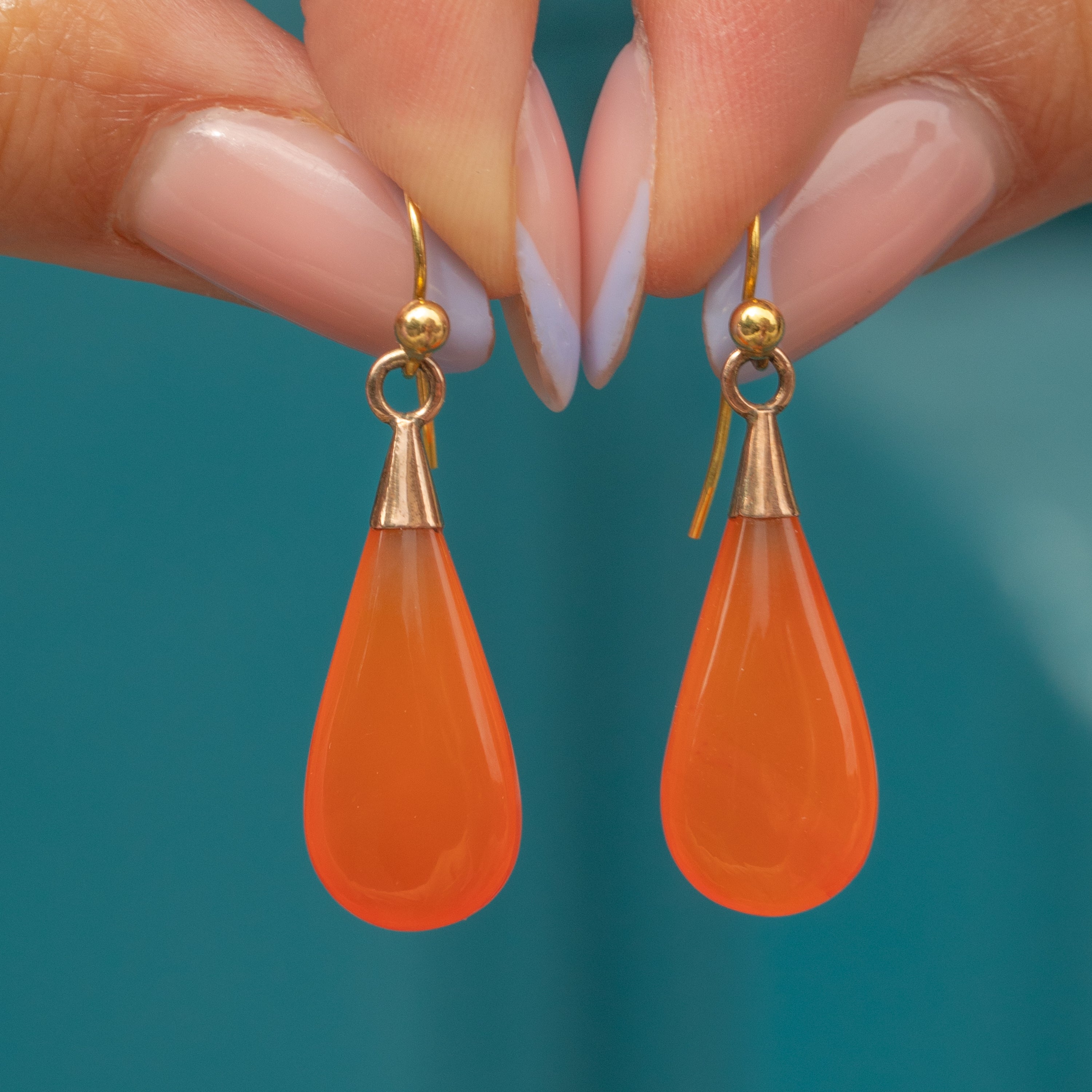A splendid pair of antique 9ct Gold Carnelian drop earrings! The perfect pair to brighten up your attire this summer, this splendid pair have been crafted from smooth cuts of Carnelian and come complete with solid 9ct Gold hooks, radiating warmth and vibrancy.