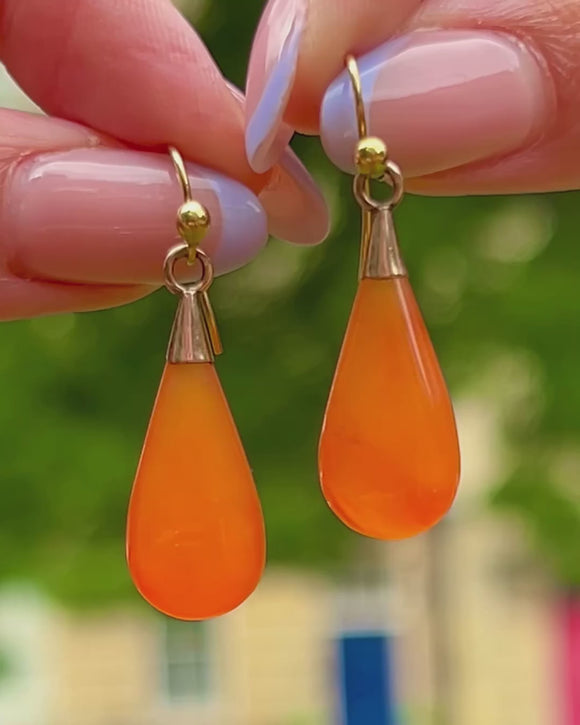 VERY GOOD-EXCELLENT: These antique 9ct Gold Carnelian drop earrings are in great condition. The Carnelians are each vibrant and brightly saturated, and are securely attached to their 9ct Gold hooks. There are some minor spots of discolouration to the Gold hooks, though this is expected with age. In wonderful condition, you can wear them with confidence!