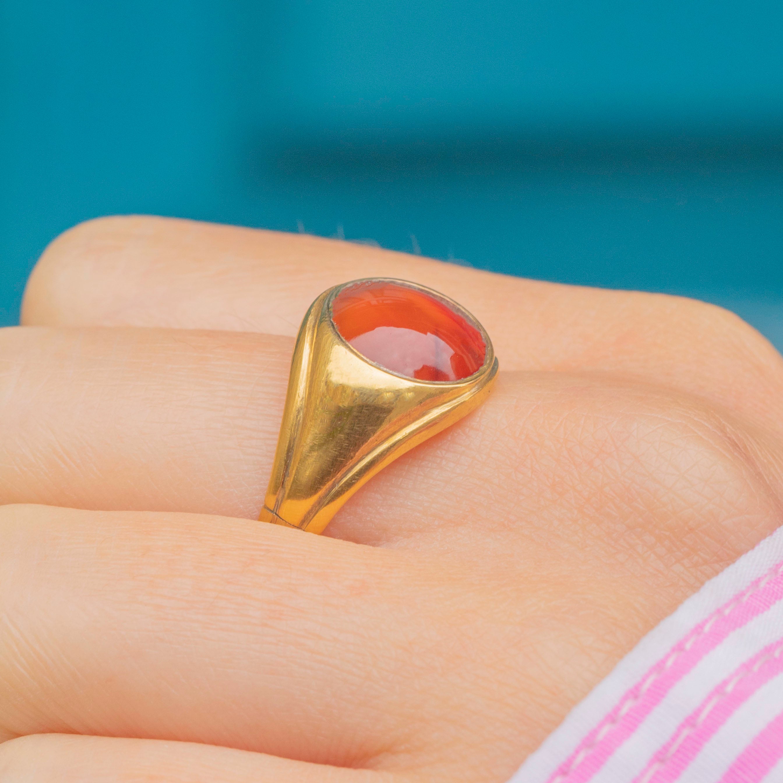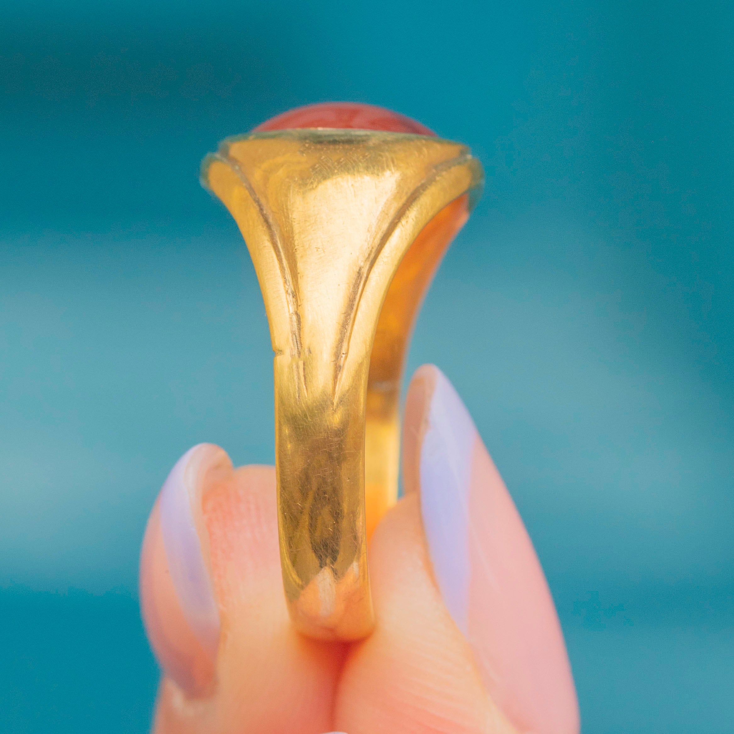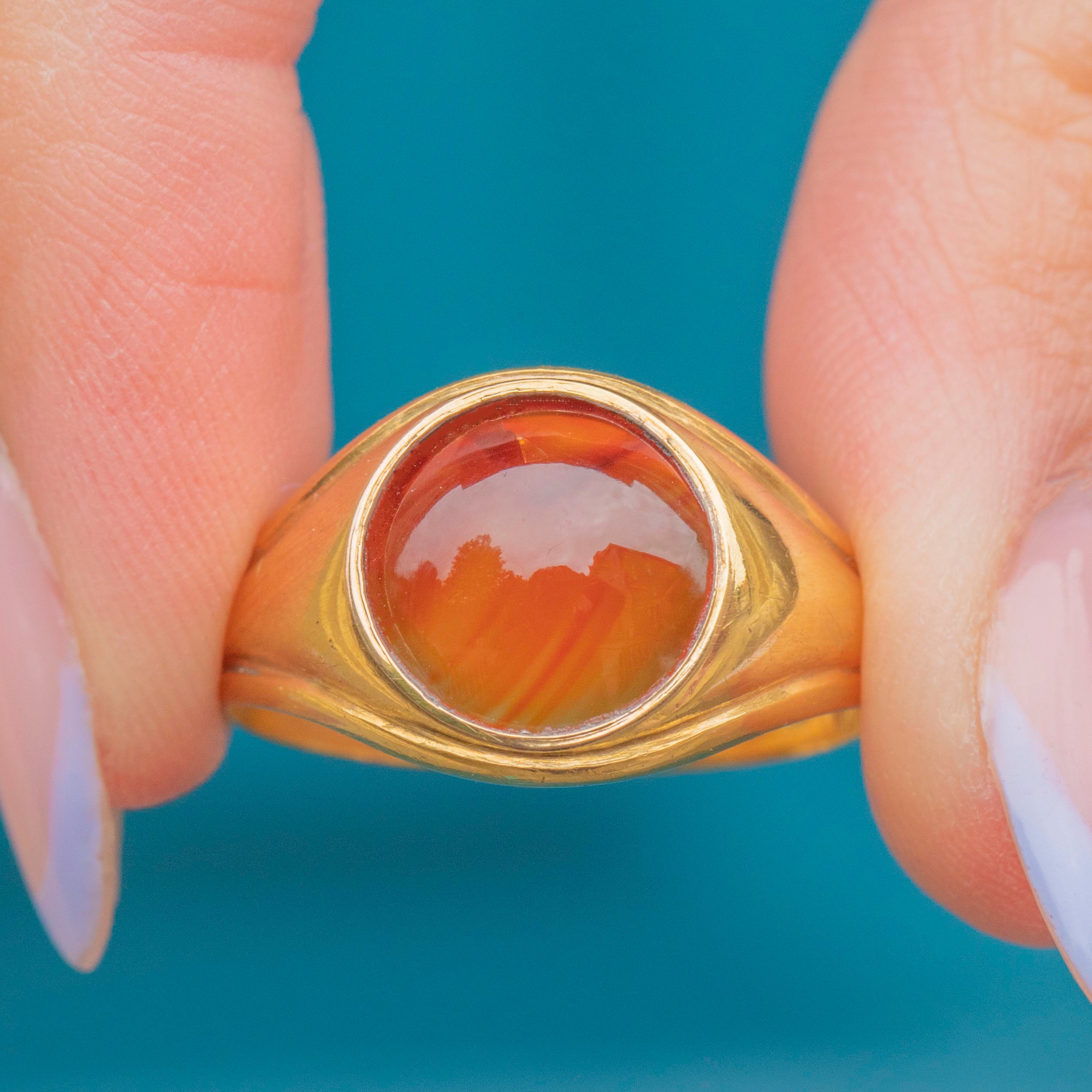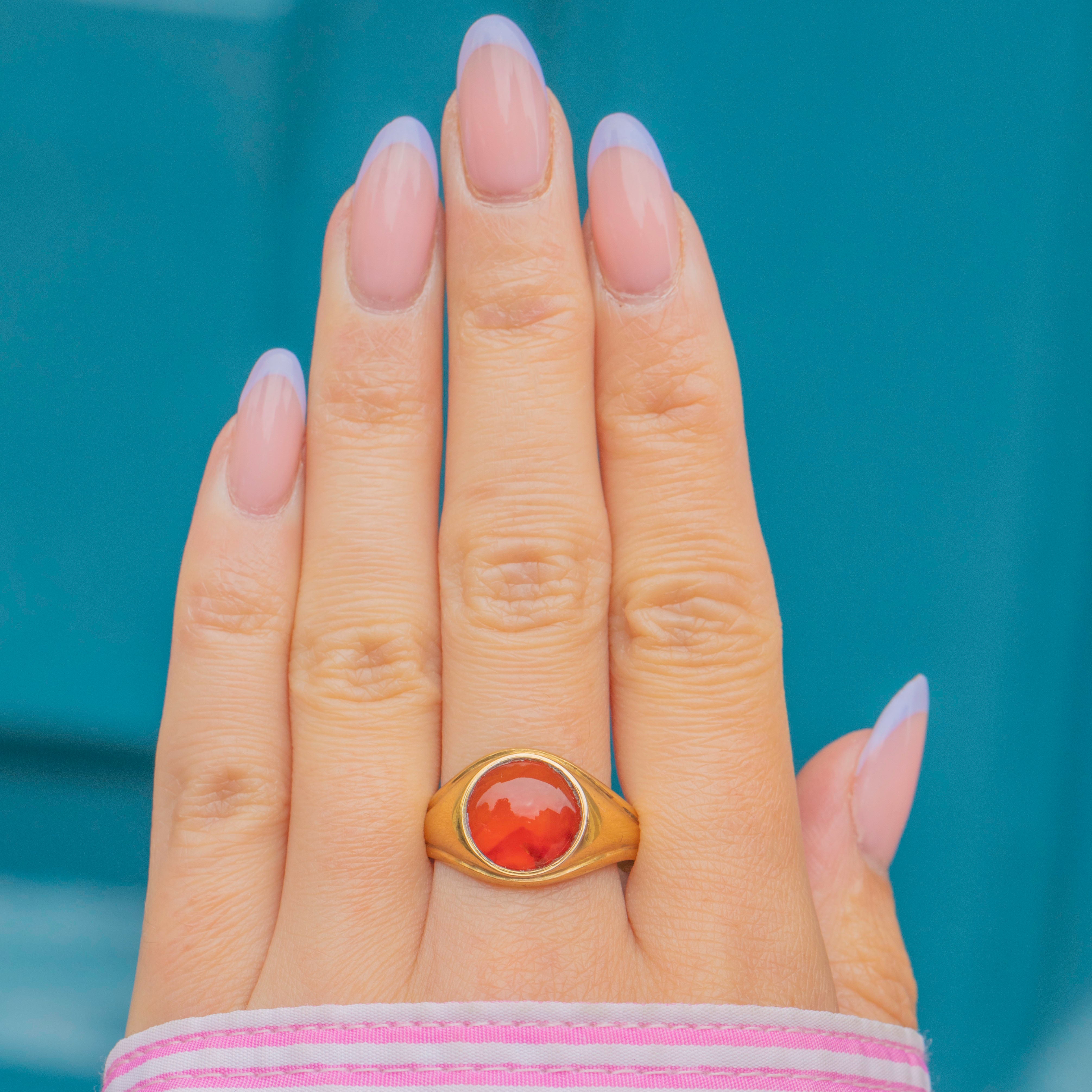 The inside of the band boasts a full set of hallmarks, dating to 1902! We love how the smooth buttery Gold complements to deep burnt orange hue of the Carnelian. Wear this antique Gold signet ring alone for impact or with your other favourite vintage rings for the ultimate allure!