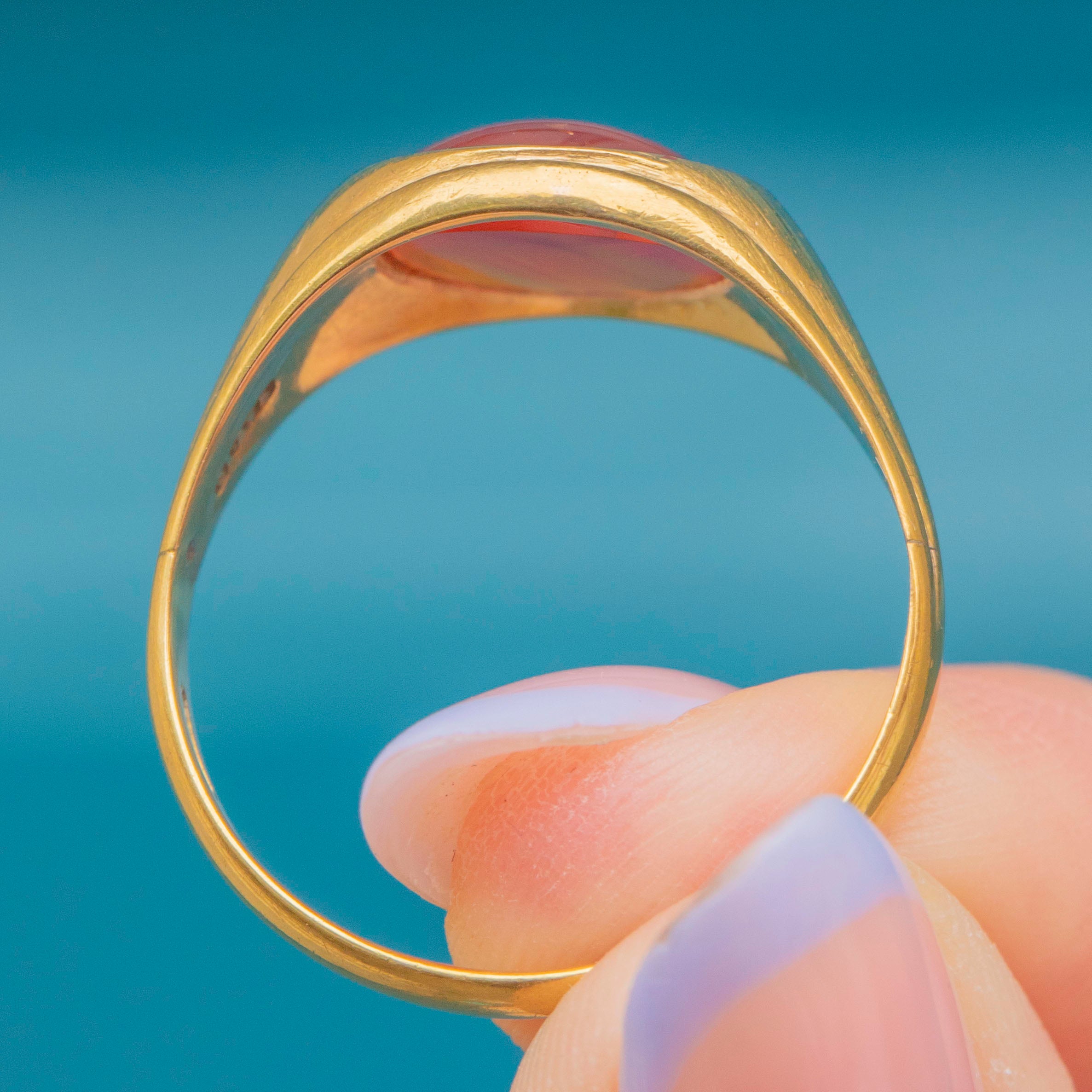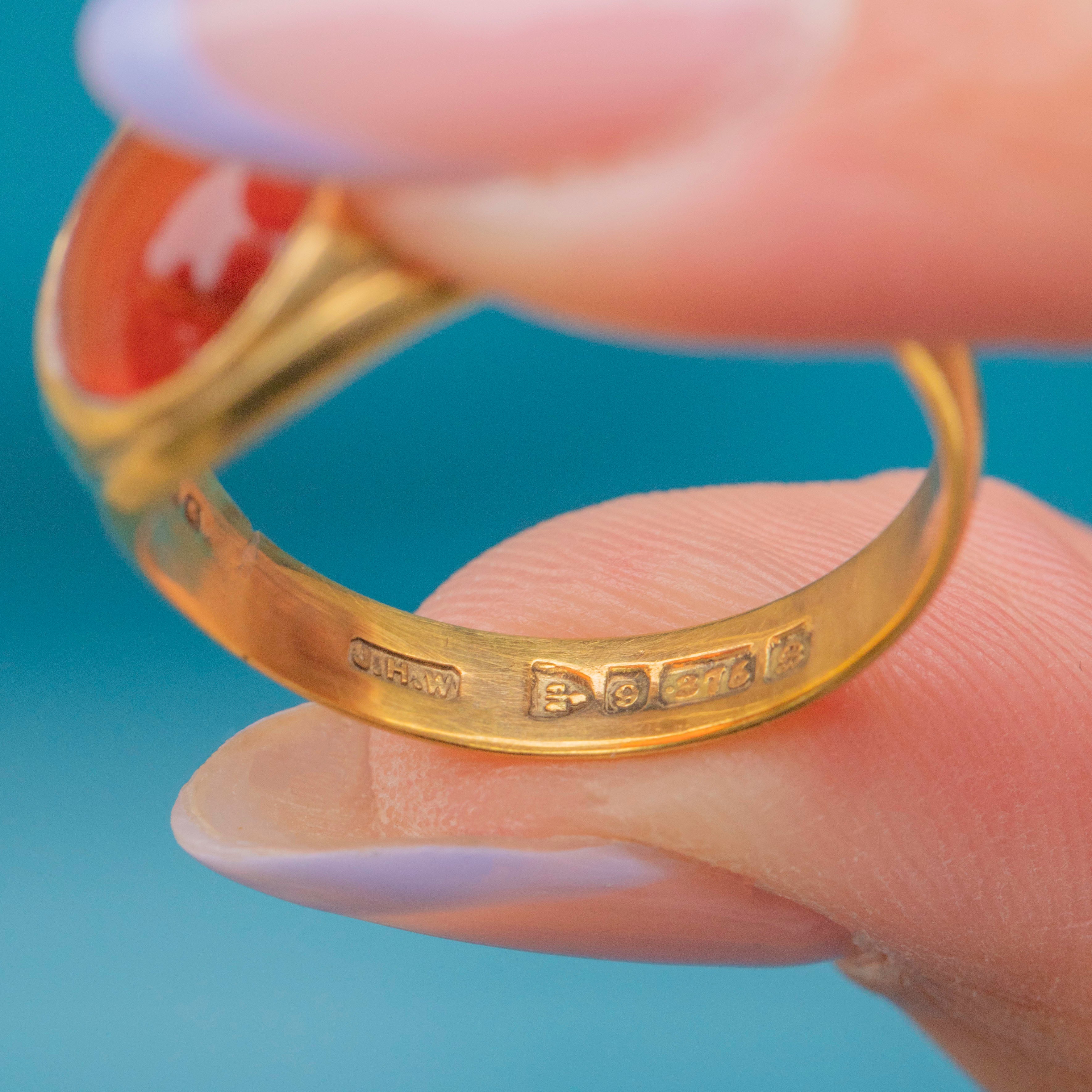 VERY GOOD: This antique 9ct Gold Carnelian signet ring is in very good condition. This glorious piece bears a large cut of Carnelian, securely set! Inside the band, you can see a full set of hallmarks which have allowed us to accurately date her, and outside, the band is smooth with only very subtle sign of wear! There is a resize mark, but this has been expertly done, so it blends in well with the rest of the band. The Carnelian is smooth and doesn't have any chips or scratches.