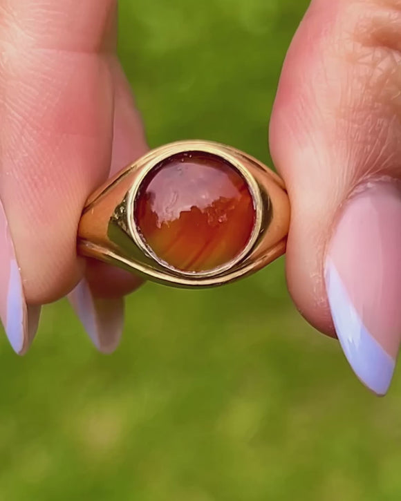 This is an impressive antique 9ct Gold Carnelian signet ring! Bright and fiery, this is a bold statement piece that will jazz up any outfit.