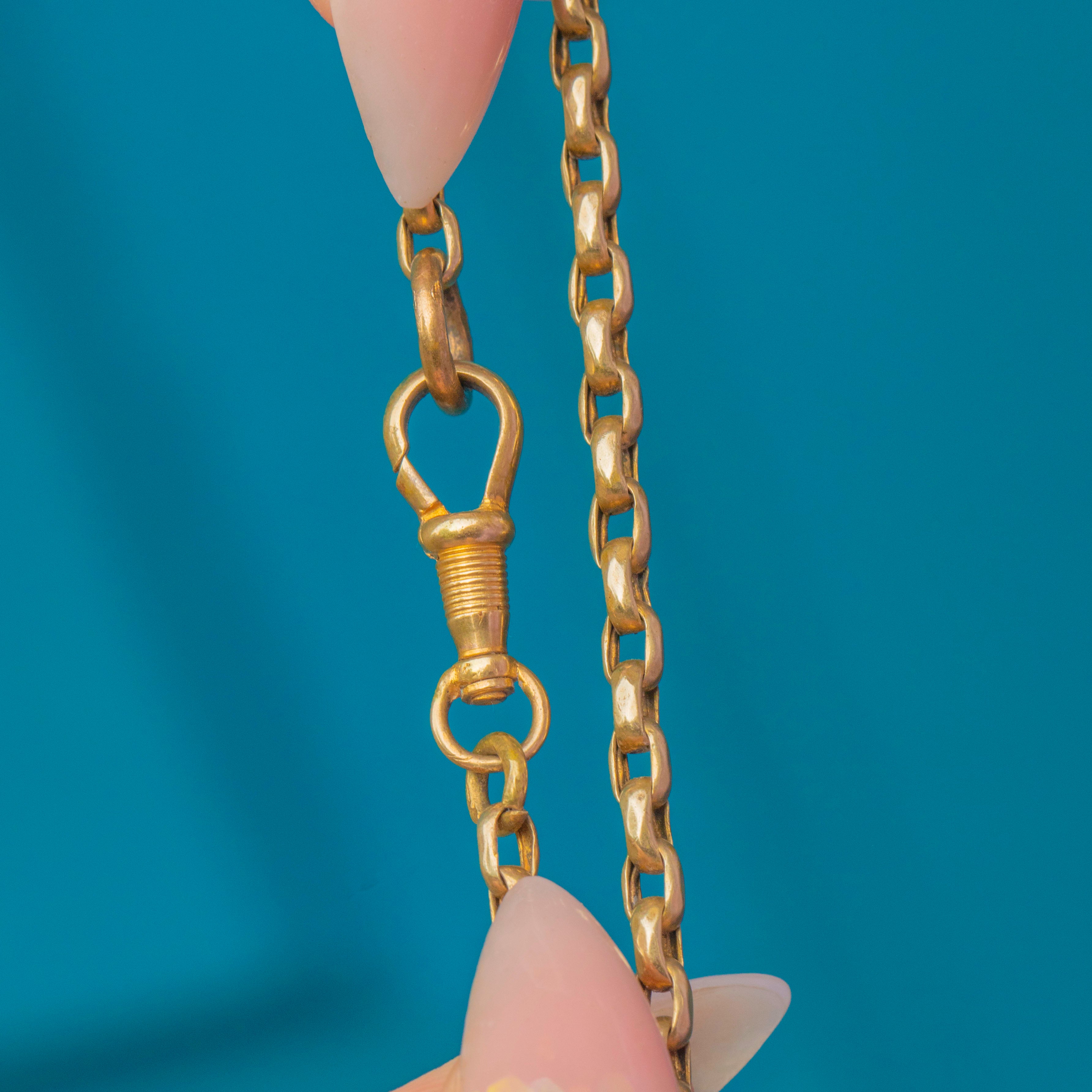 This long Victorian belcher chain is a superb antique example, crafted from 9ct Gold cased metal. The rounded 3mm wide belcher links are substantial and smooth, and the chain closes with its original dog-clip clasp.