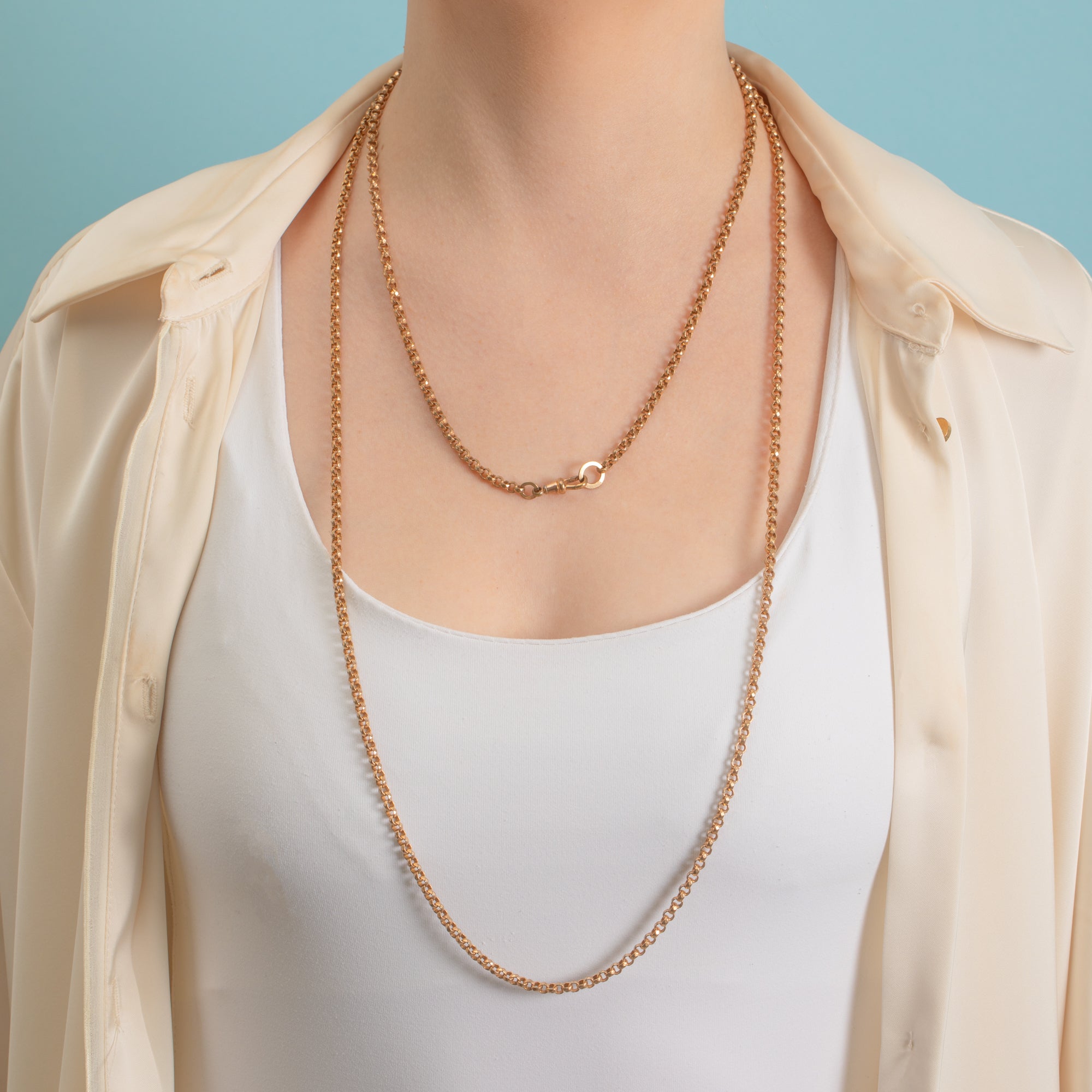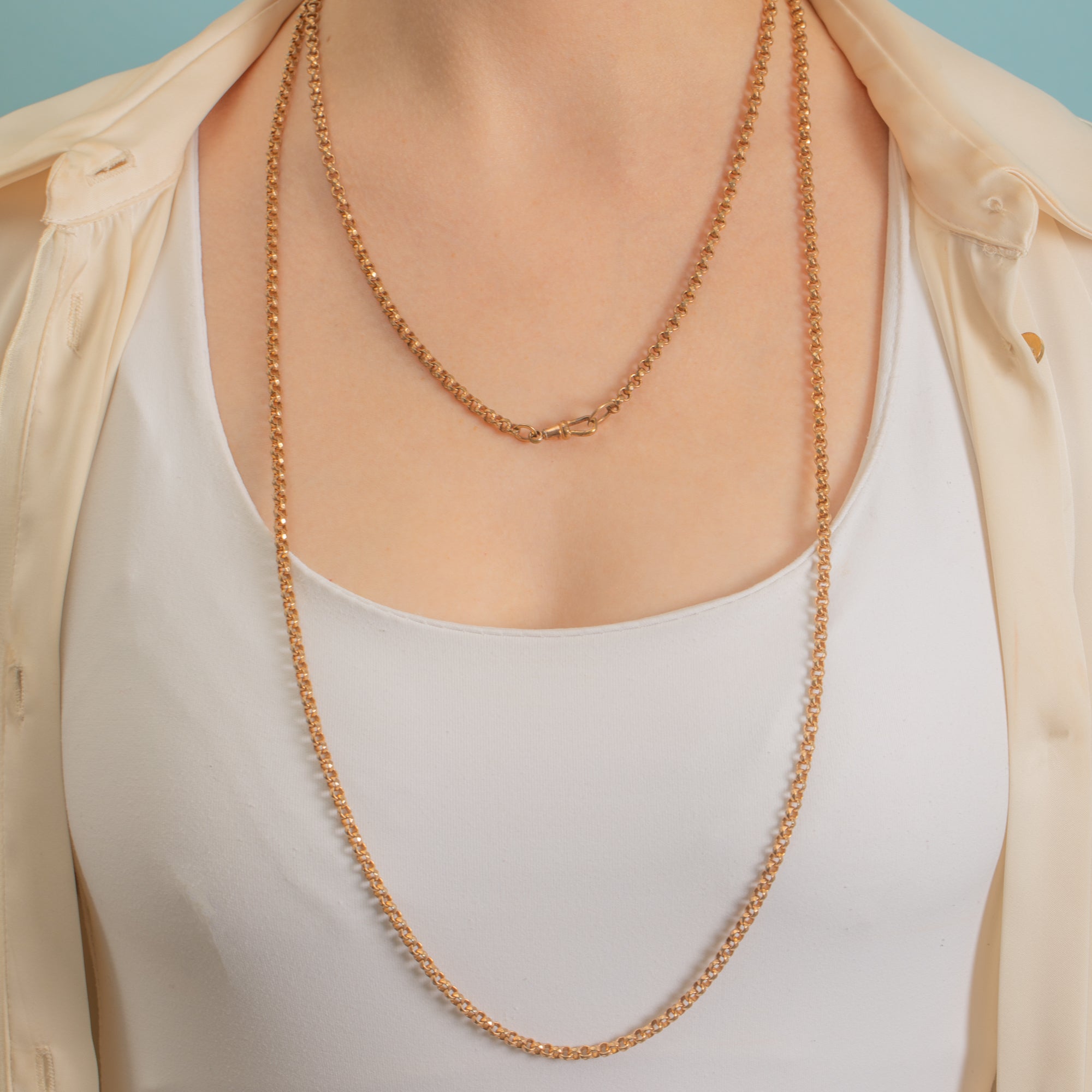 This antique Gold cased faceted belcher chain is wonderful! At a very generous 52" in length, this Victorian Gold cased chain is the perfect piece to add a flash of chunky Gold to your décolletage.