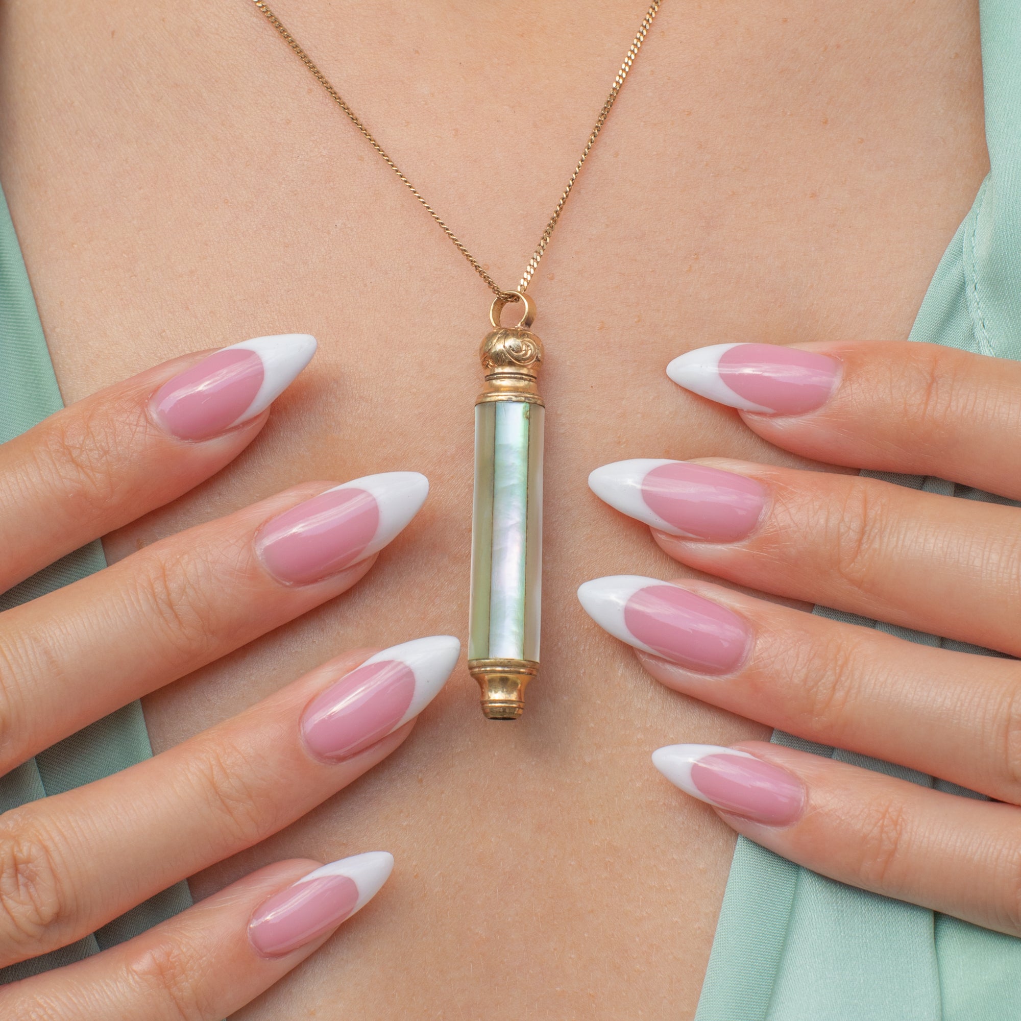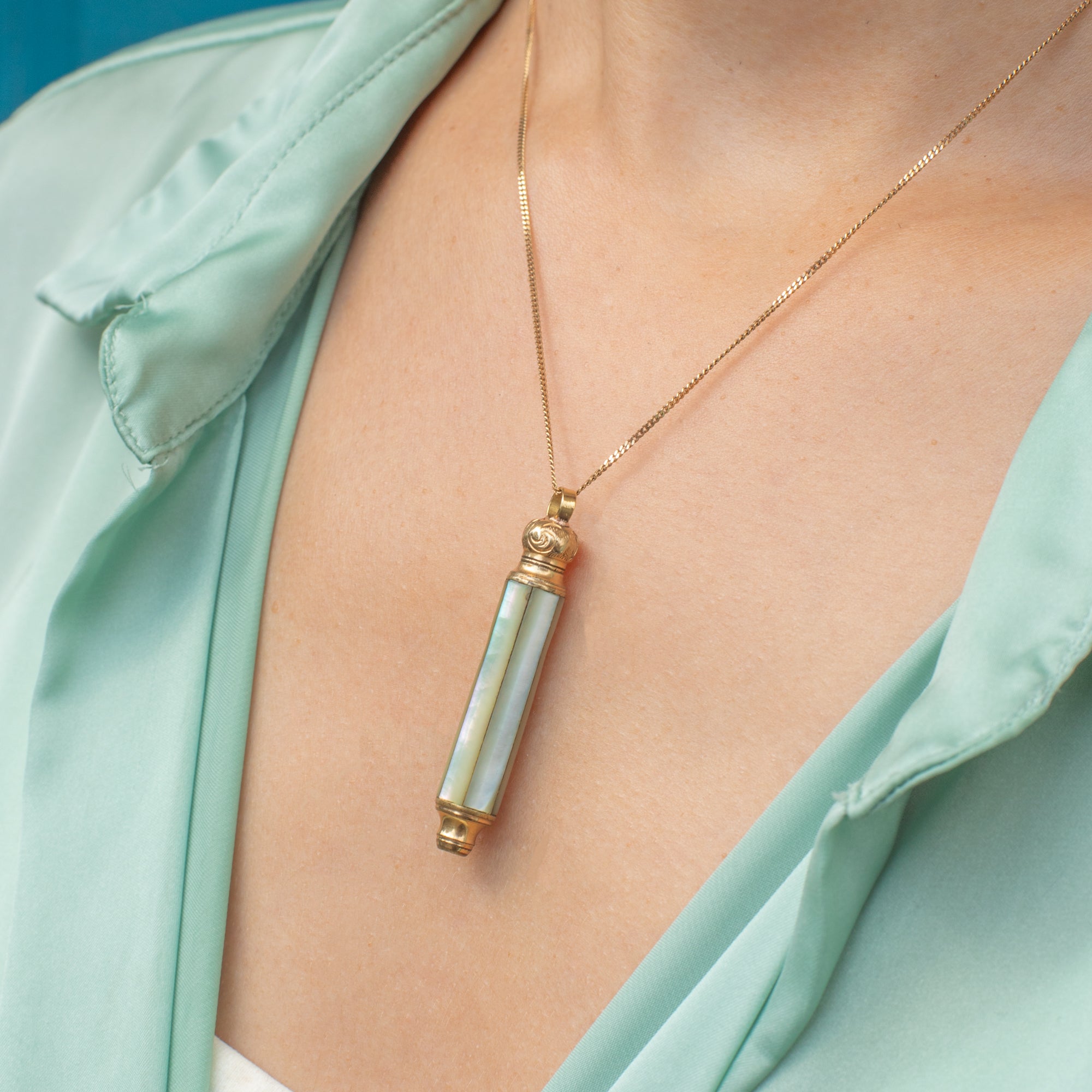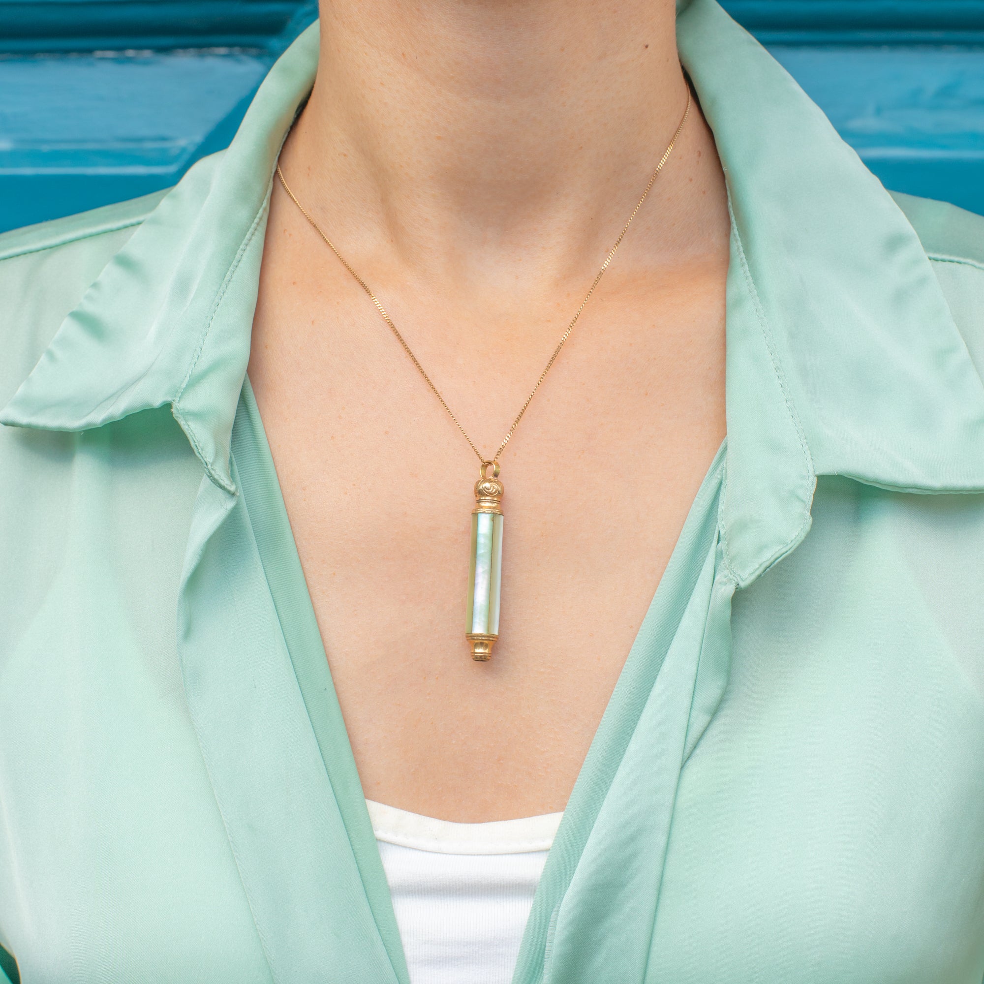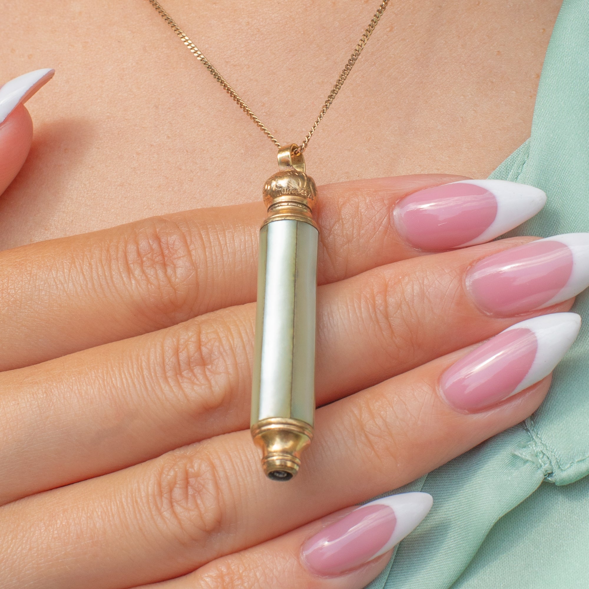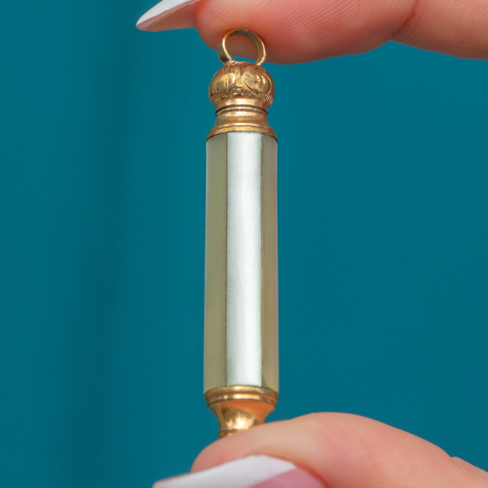 The shimmering Mother-of-Pearl columns and engraved domed top make this Victorian pencil pendant a must-have piece!