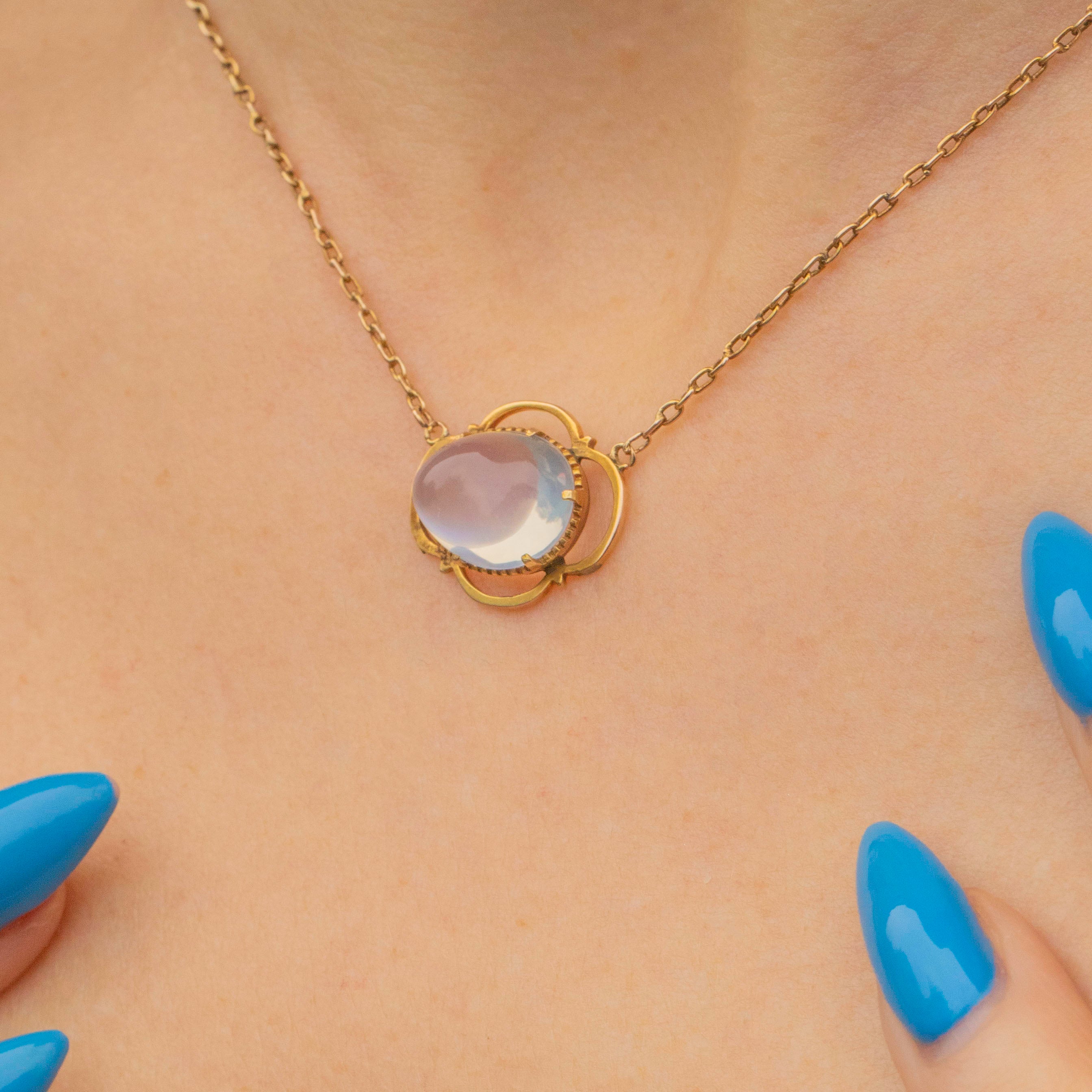 The Ceylon Moonstone is home to that desirable blue schiller, that billows across its cabochon surface. The Moonstone setting has a subtle floral nod, and at 15" long it will rest effortlessly just below the neck!