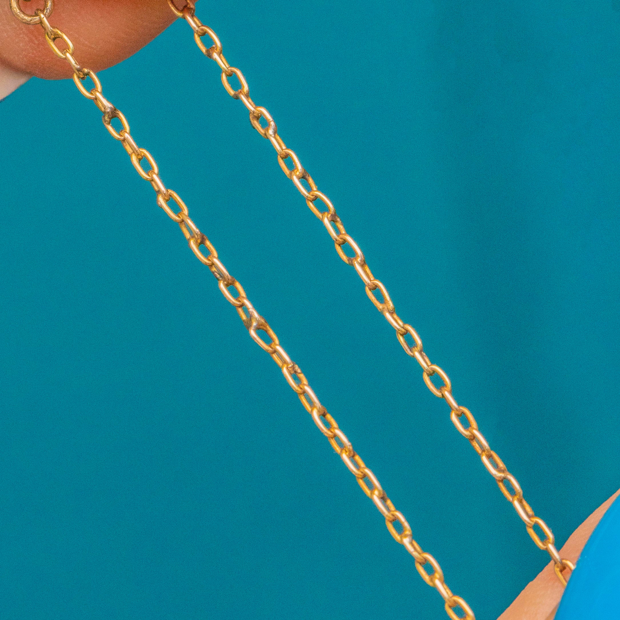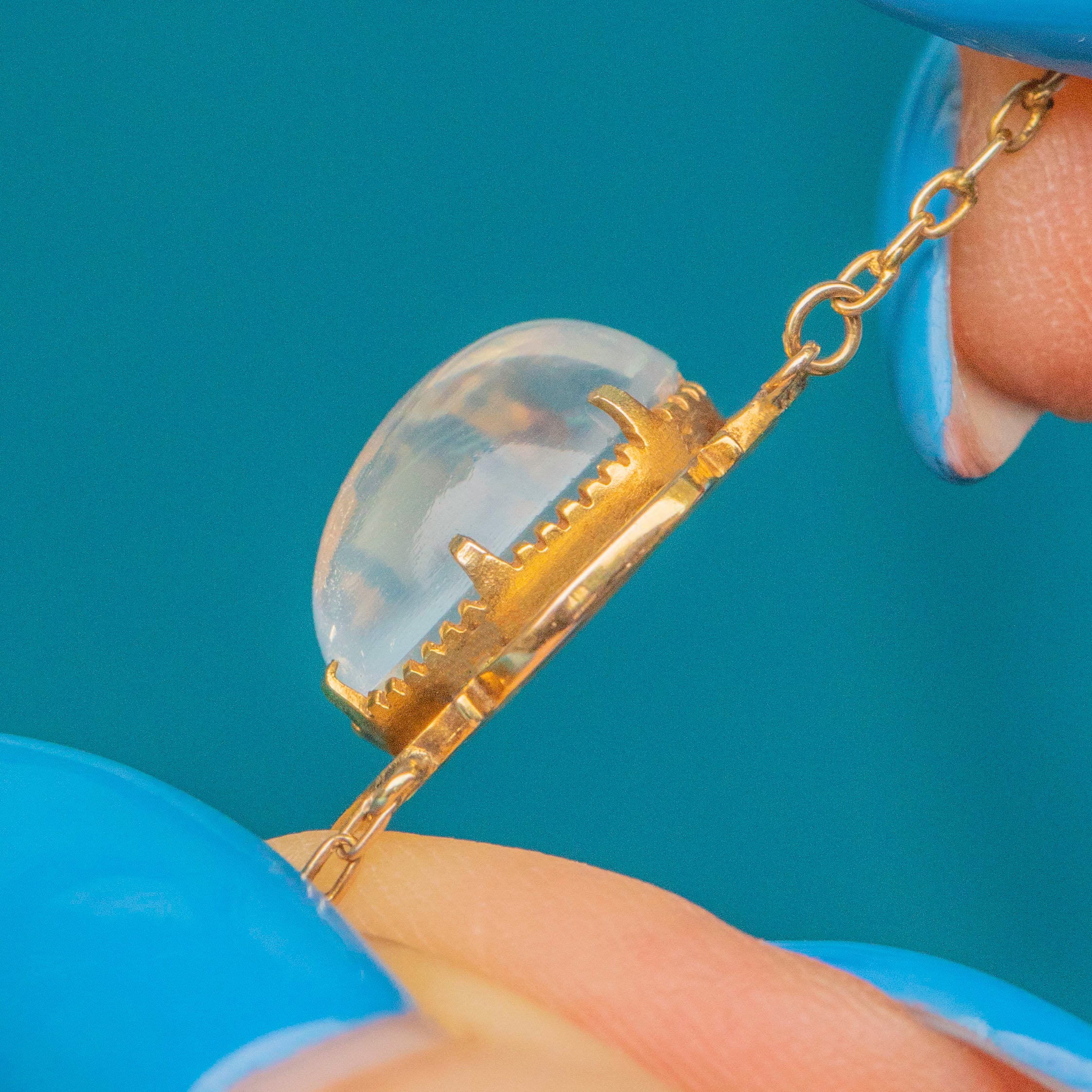 EXCELLENT. This antique 9ct Gold Ceylon Moonstone integral necklace is in excellent condition. The Moonstone is secure and plump, without any surface wear. The 9ct Gold chain links are secure and the clasp is in perfect working order. To the base of the pendant there is a sign of something previously having been attached, likely a drop, but this isn't visible unless you look directly upwards from below it - so wear her with confidence!