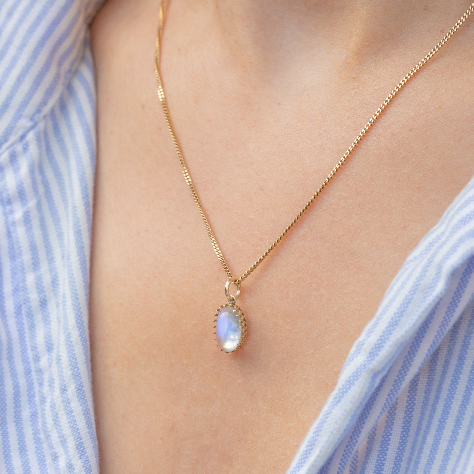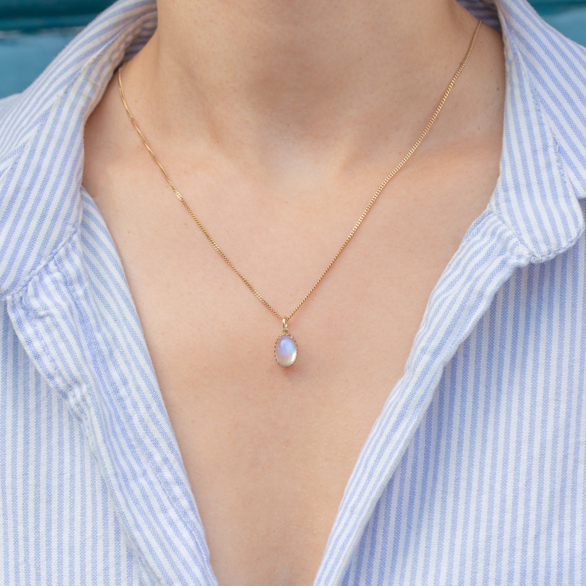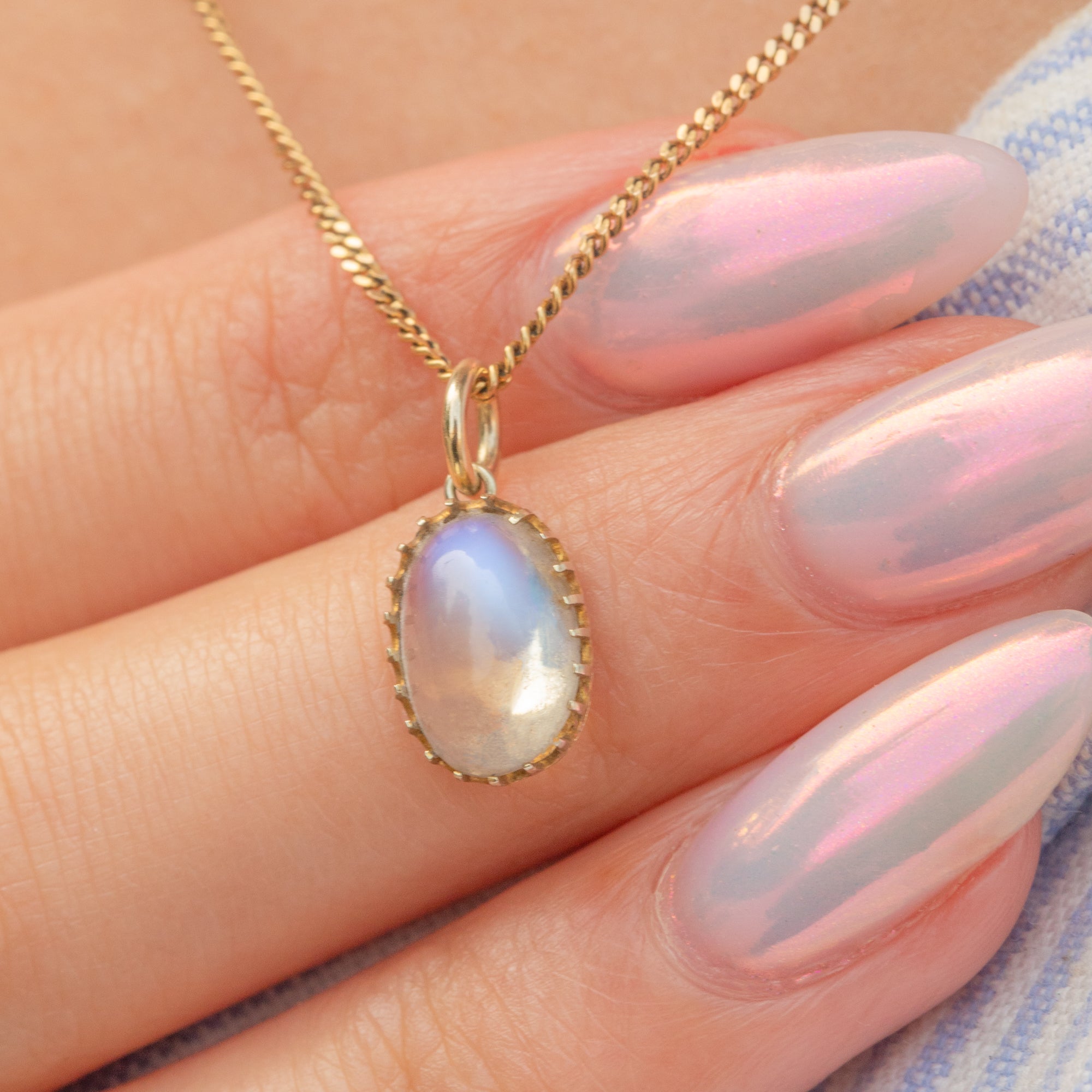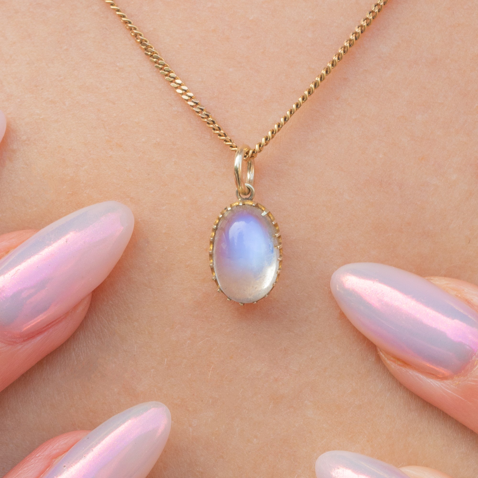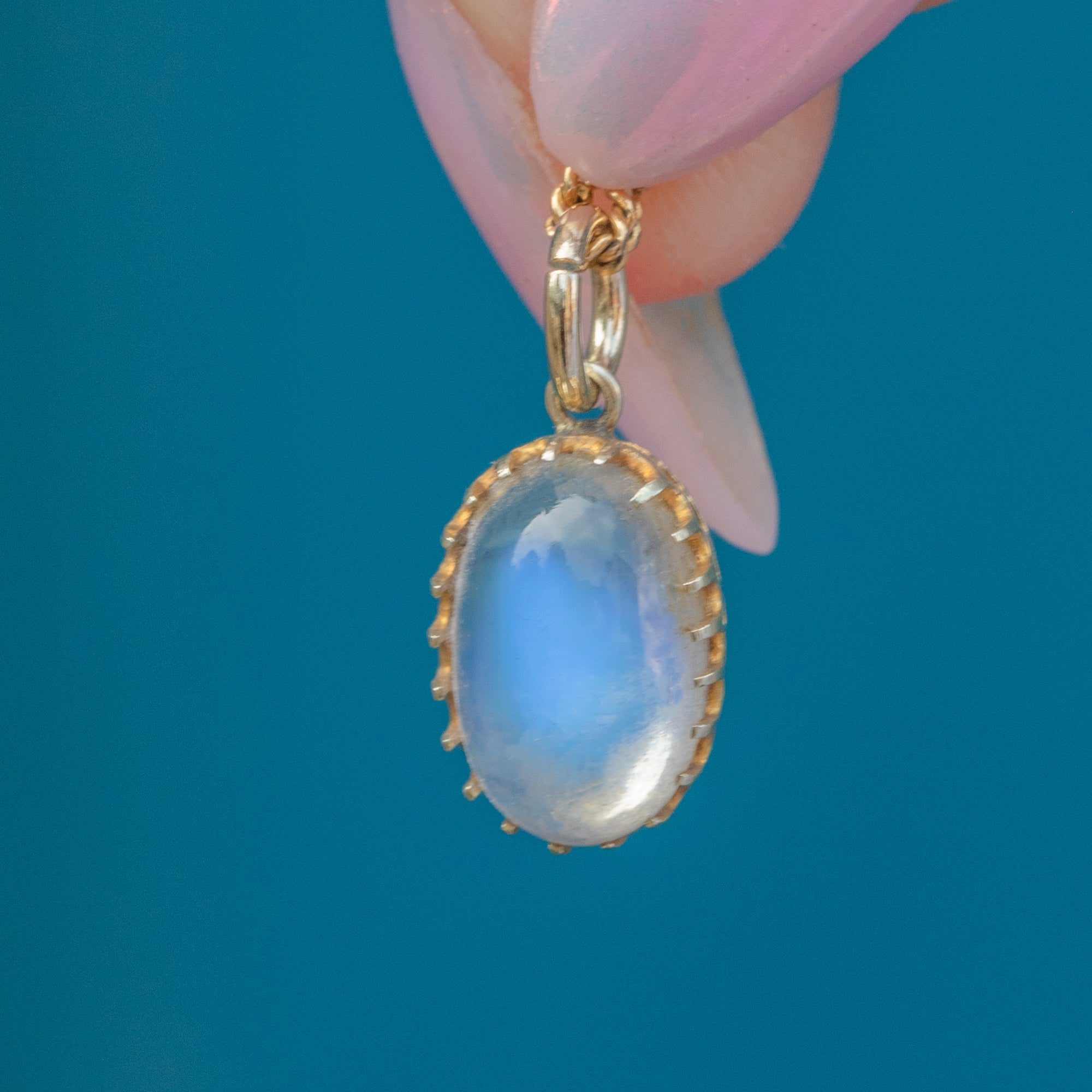 EXCELLENT: This antique 9ct Gold Ceylon Moonstone cabochon charm is in excellent condition. The oval Moonstone cabochon is set securely within its 9ct Gold claws and is complete with a generously sized jump ring. Free from any notable signs of wear, this antique charm has a lovely glow and glossy sheen from all angles.
