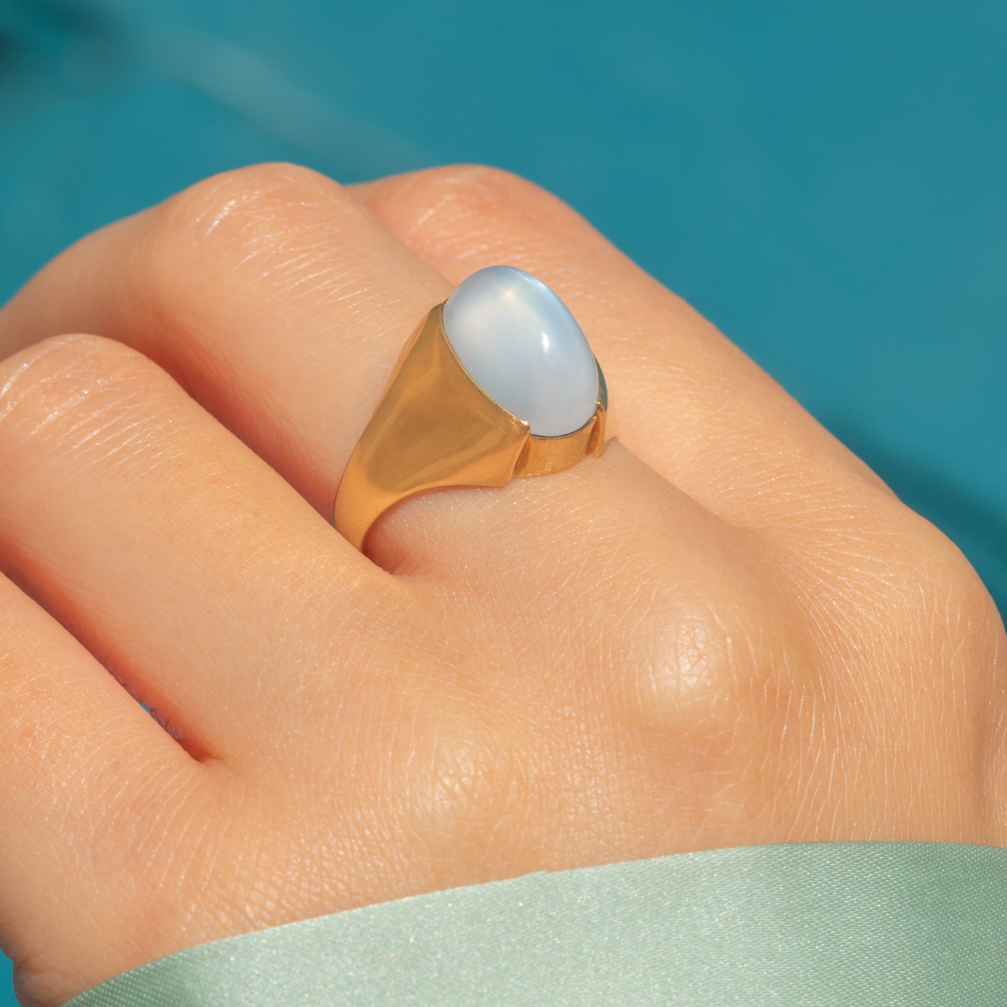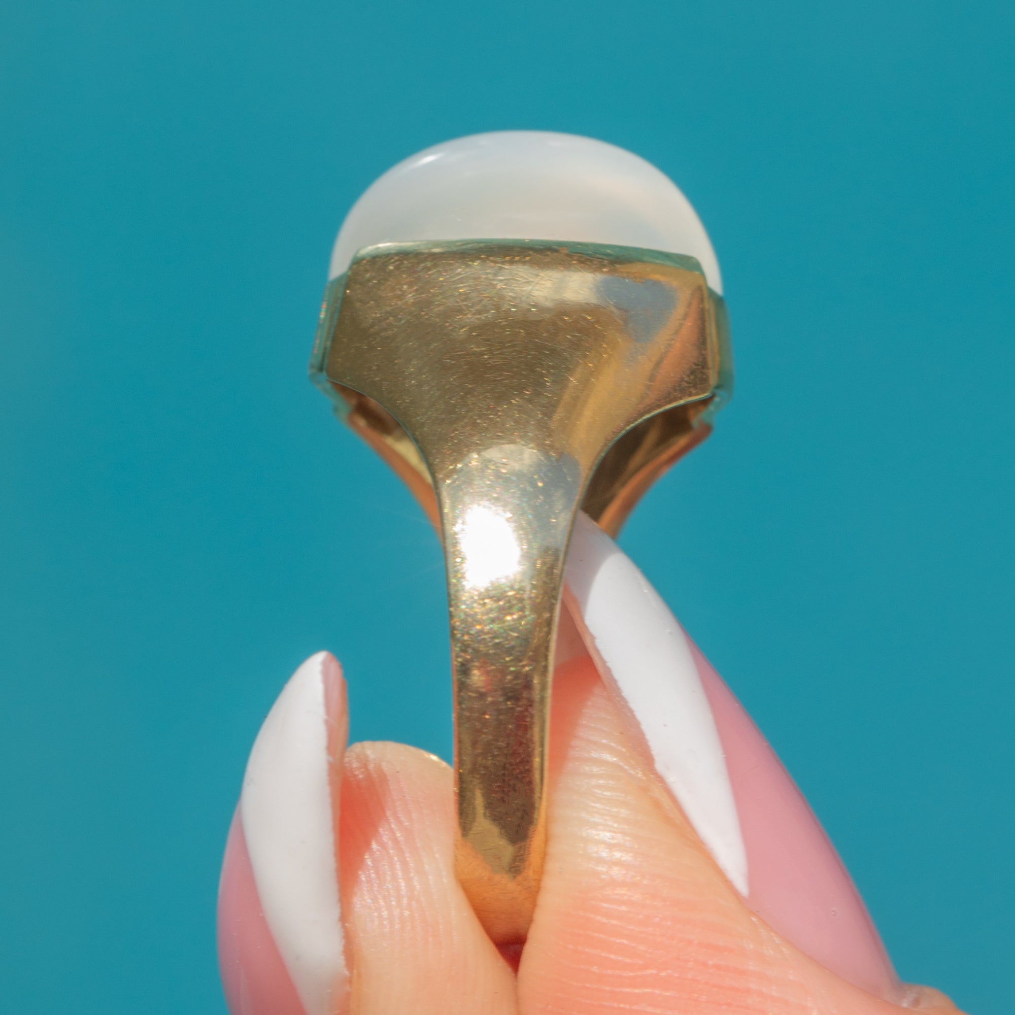 The Moonstone is set on a bright and glossy 9ct Gold band, providing exceptional finger coverage and a striking profile. Versatile yet eye-catching, this enchanting antique ring will make a wonderful addition to your collection!