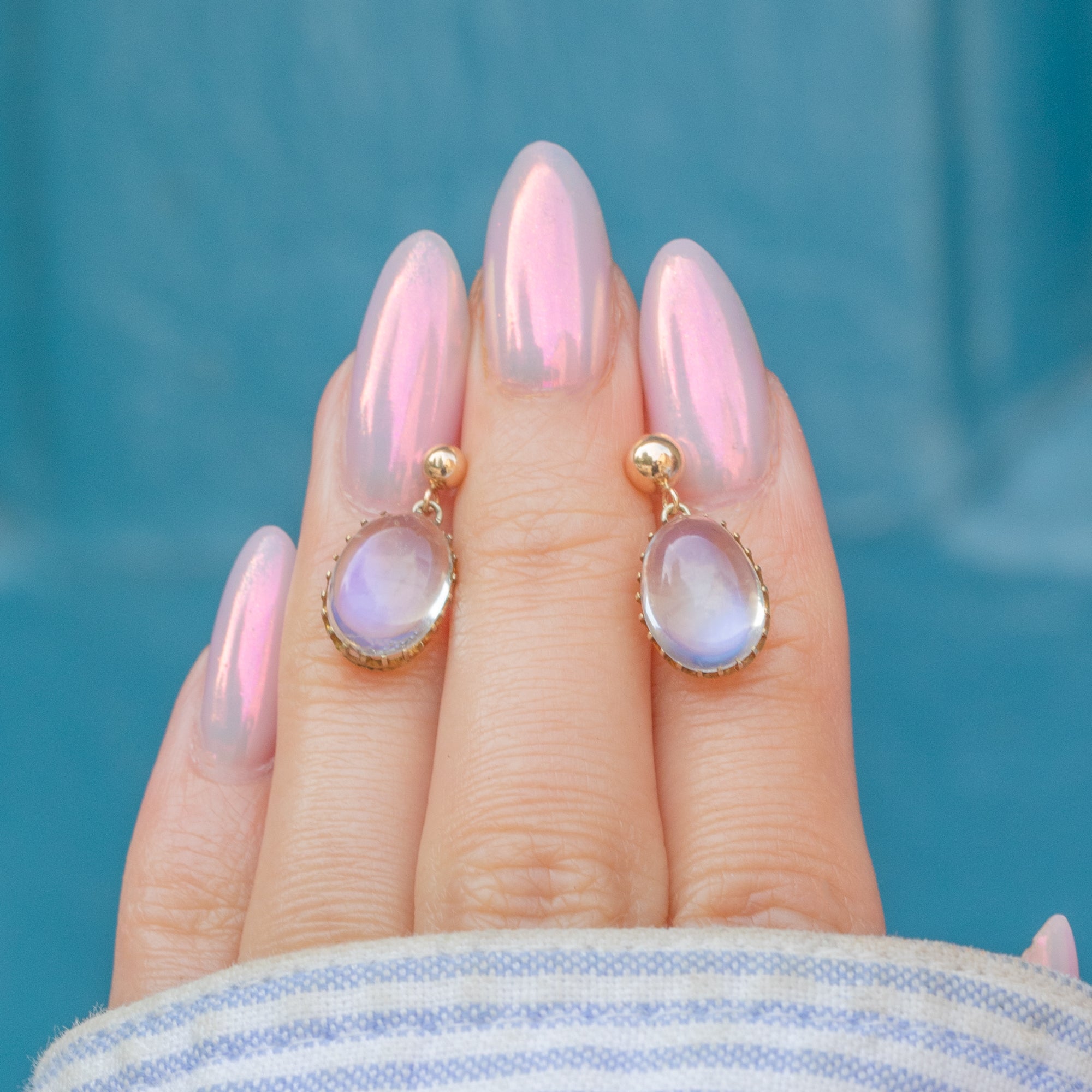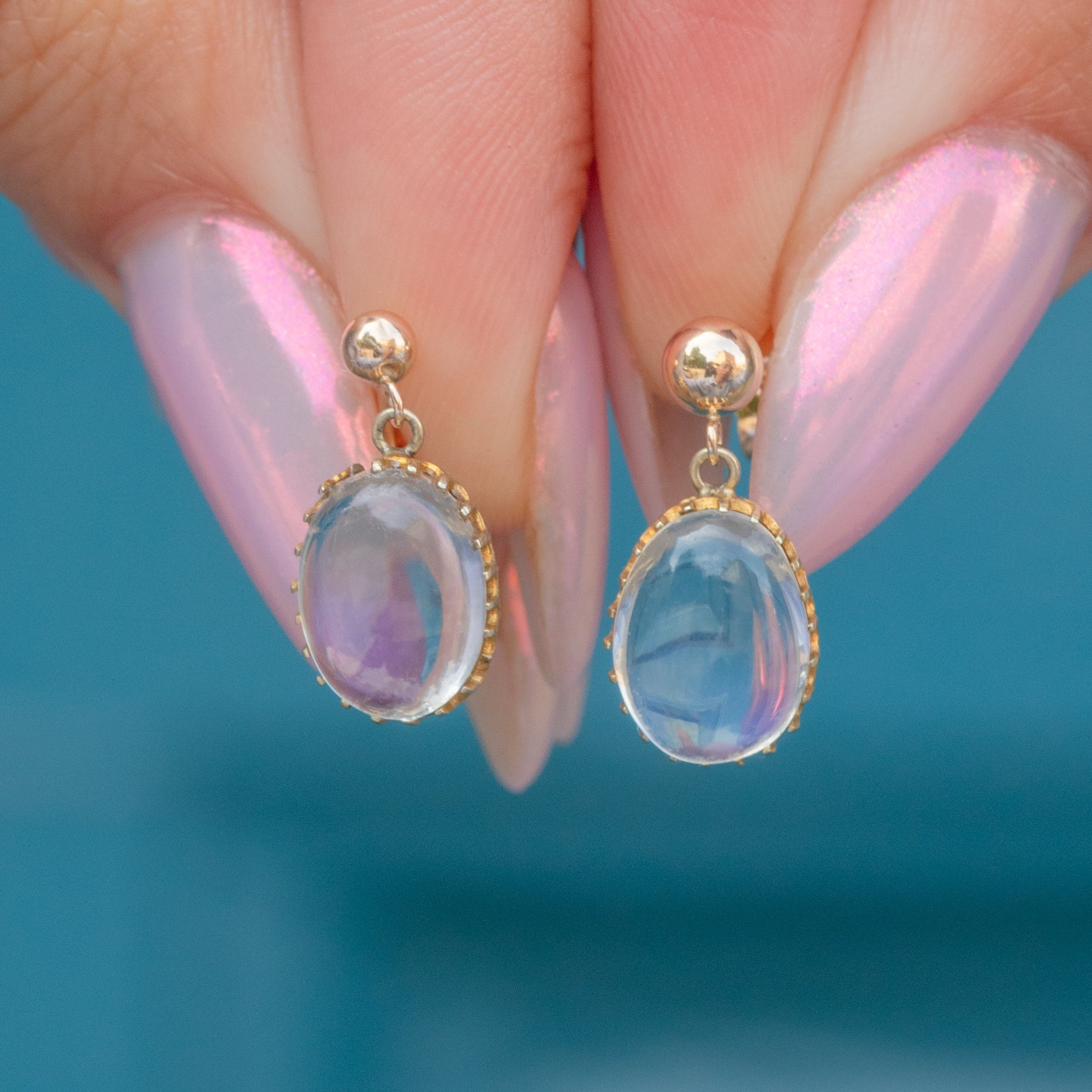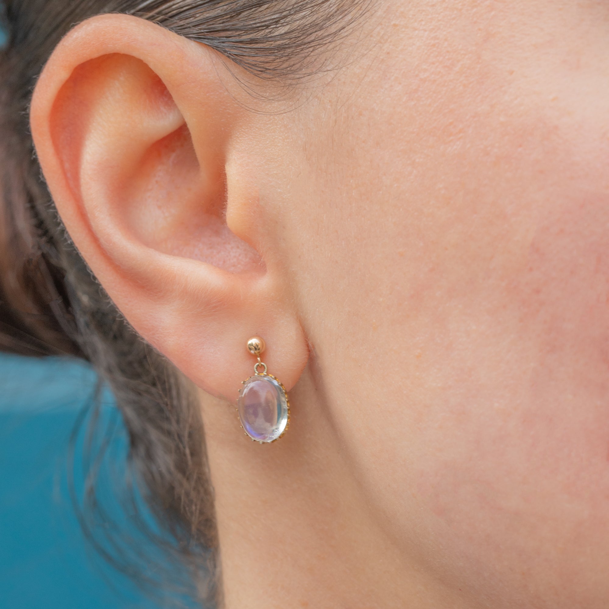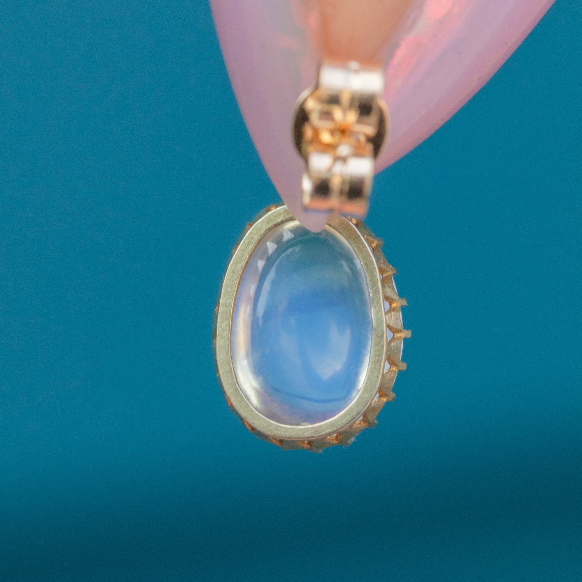 Clasped tightly in luxurious 9ct Gold settings, the exquisite antique 2.10ct Moonstones sway gently just below the earlobe. A luminous silver adularescence glows from the Moonstones as they catch the light, like a speck of magic caught beneath each surface!