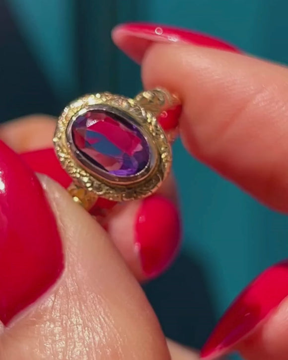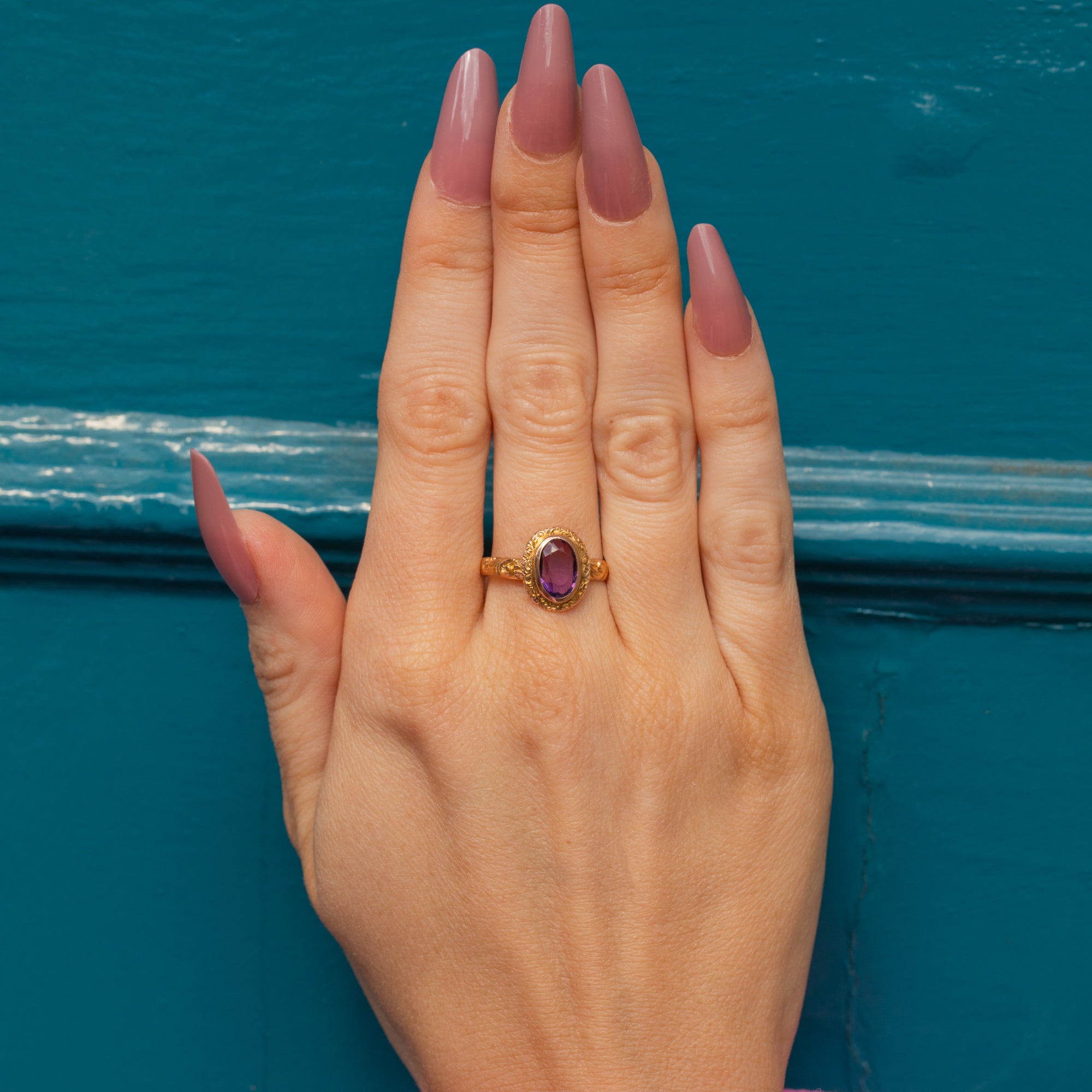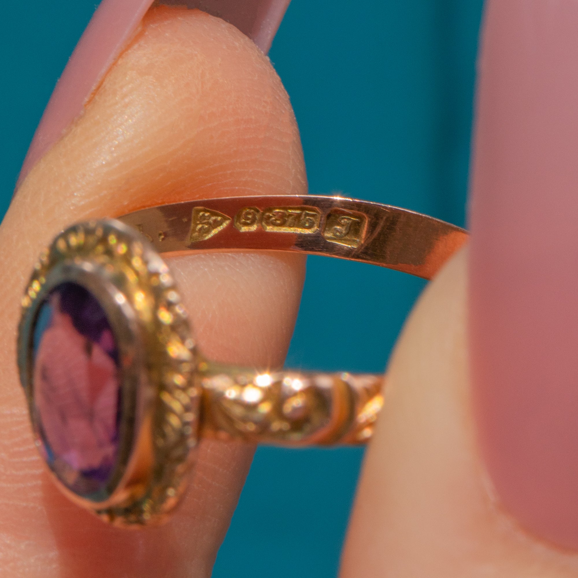 This antique 9ct Gold cased Amethyst ring is bursting with character! Centred by a 0.70ct Amethyst flaunting rich violet hues, she is embraced by a sun-kissed 9ct GOld bezel setting.