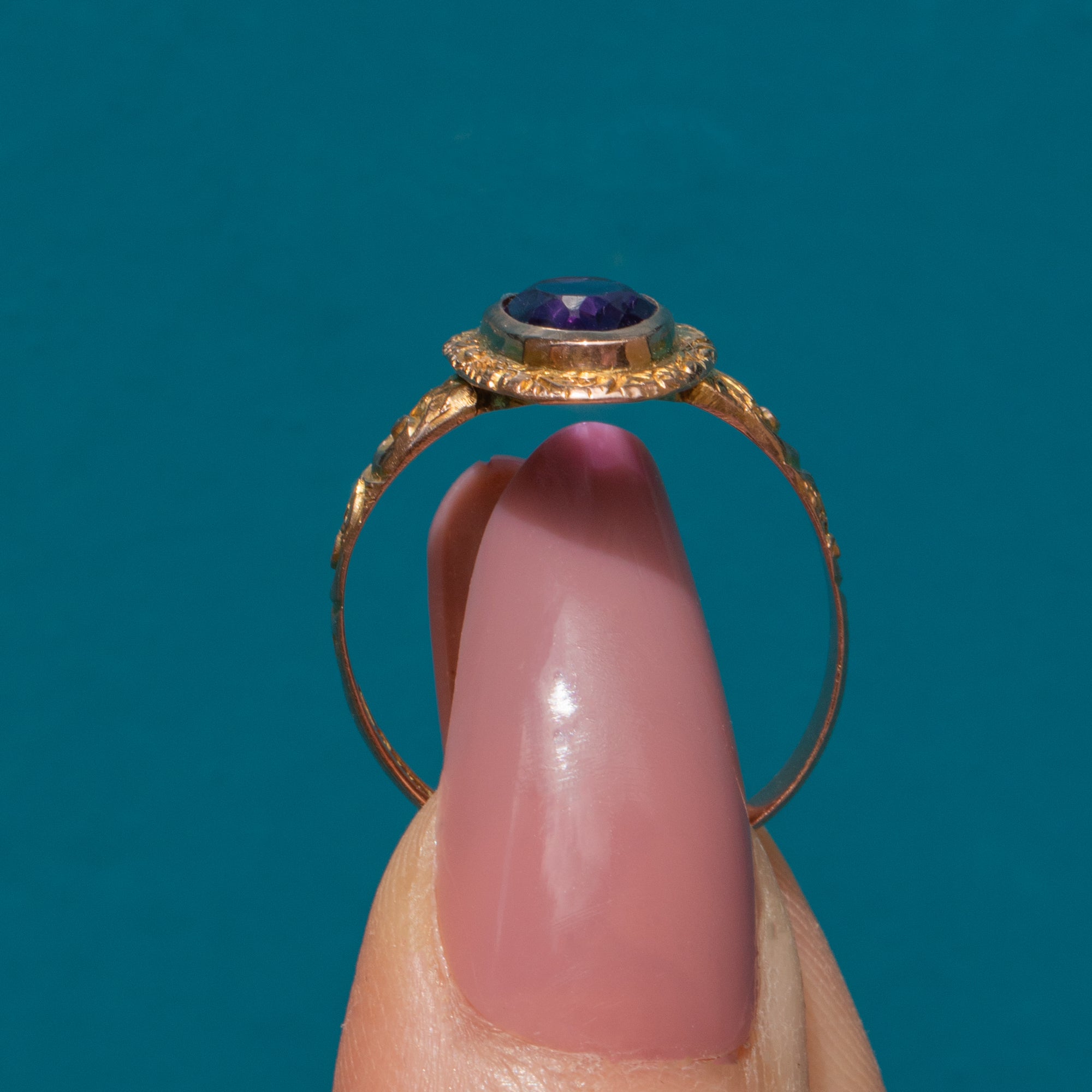 VERY GOOD. This antique 9ct Gold chased Amethyst ring is in very good condition. The Amethyst is secure within its setting, fabulously faceted and offers a vivid colour. The chased detailing is crisp and looks just as magnificent as when it was first created over a century ago. There is evidence of a previous resizing on the back of the ring band but this cannot be seen when worn. A delightful ring that will have no problems fitting in amongst your other Gold goodies!